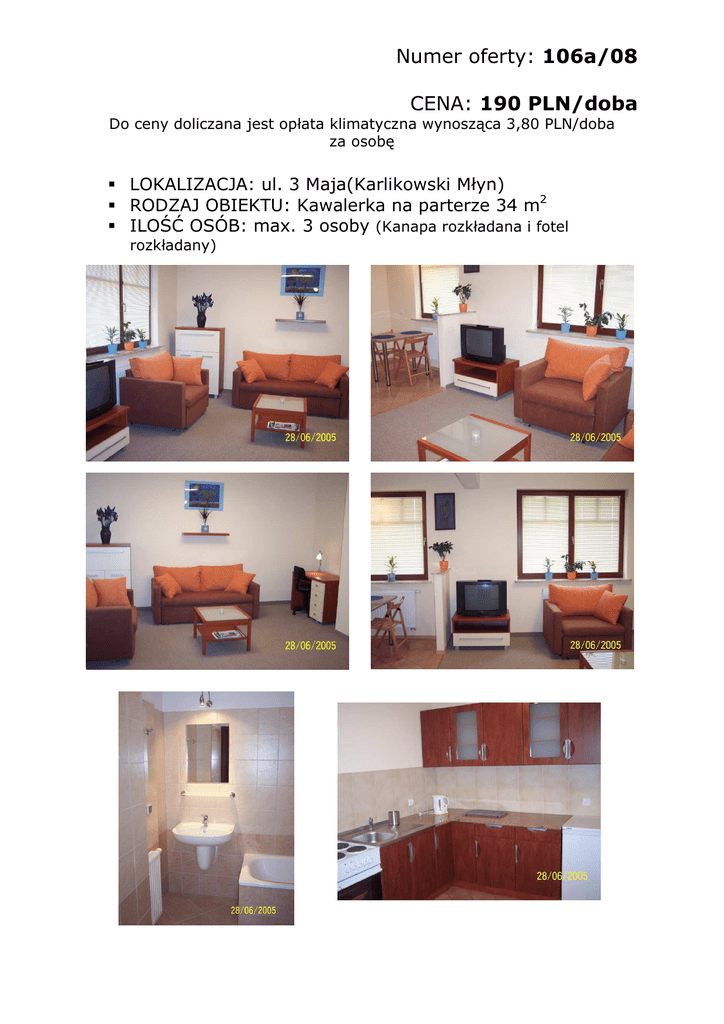Numer oferty: 106a/08 CENA: 190 PLN/doba Do ceny doliczana jest opłata klimatyczna wynosząca 3,80 PLN/doba za osobę LOKALIZACJA: ul. 3 Maja(Karlikowski Młyn) RODZAJ OBIEKTU: Kawalerka na parterze 34 m2 ILOŚĆ OSÓB: max. 3 osoby (Kanapa rozkładana i fotel rozkładany) Numer oferty: 106a/08 LOKALIZACJA: ul. 3 Maja Lp. PRZEDMIOT OCENY UWAGI 1. Nowe/stare budownictwo 2. Nowe/stare meble Nowe budownictwo, nowoczesne budynki, monitorowane osiedle Nowe meble 3. Parking na posesji/GaraŜ Miejsce postojowe na posesji 4. Balkon / taras / ogródek Nie 5. Telewizor (Kablówka, TV Sat), Radio TV kablowa 6. Dostęp do telefonu Nie 7. Dostęp do internetu Tak Kuchnia Kuchnia łączona z pokojem w pełni wyposaŜona w: lodówkę, kuchenkę elektryczną, czajnik bezprzewodowy, sztućce, zastawę i garnki Łazienka Łazienka z wanna oraz WC 10. Pościel, ręczniki Pościel 11. Dostęp do szafy / półek Tak 12. Pobyt ze zwierzątkiem Do uzgodnienia 14. Niepełnosprawni (winda, podjazd) Obiekt nieprzystosowany 15. Plac zabaw dla dzieci Tak na posesji 16. 17. Lokalizacja • Centrum – Dworzec PKP • PlaŜa, park • Dzielnica • Komunikacja miejska Osoby palące Nie 18. Piwnica/schowek Tak 19. Faktura VAT lub Rachunek Rachunek 20. Inne 8. 9. Blisko centrum, os. Karlikowski Młyn, 10 min od Dworca PKP/SKM, do plaŜy 900 m, blisko przystanek autobusowy (122, 143, 187, 185)