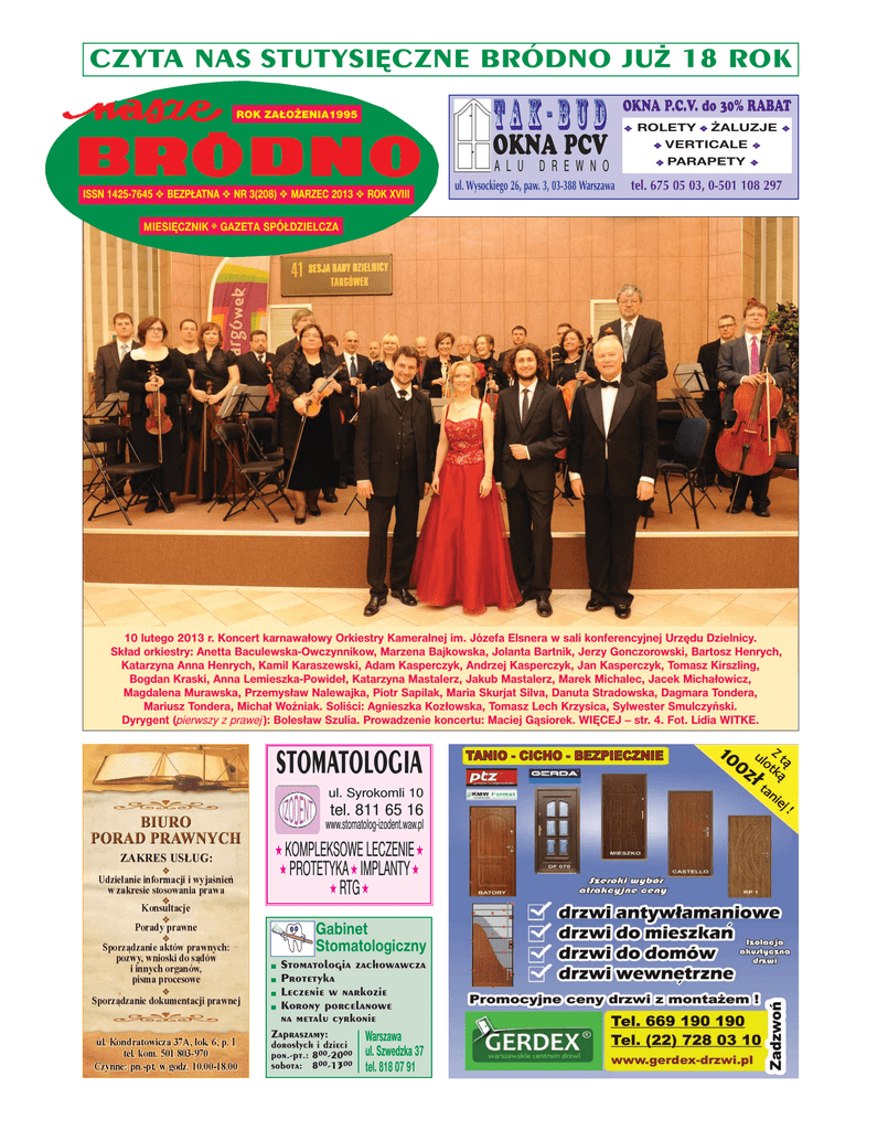 CZYTA NAS STUTYSIĘCZNE BRÓDNO JUŻ 18 ROK TA K- BU D ROK ZAŁOŻENIA1995 OKNA PCV A L U ISSN 1425-7645 v BEZPŁATNA v NR 3(208) v MARZEC 2013 v ROK XVIII D R E W N O ul. Wysockiego 26, paw. 3, 03-388 Warszawa OKNA P.C.V. do 30% RABAT v ROLETY v ŻALUZJE v VERTICALE v v PARAPETY v v tel. 675 05 03, 0-501 108 297 MIESIĘCZNIK v GAZETA SPÓŁDZIELCZA 10 lutego 2013 r. Koncert karnawałowy Orkiestry Kameralnej im. Józefa Elsnera w sali konferencyjnej Urzędu Dzielnicy. Skład orkiestry: Anetta Baculewska-Owczynnikow, Marzena Bajkowska, Jolanta Bartnik, Jerzy Gonczorowski, Bartosz Henrych, Katarzyna Anna Henrych, Kamil Karaszewski, Adam Kasperczyk, Andrzej Kasperczyk, Jan Kasperczyk, Tomasz Kirszling, Bogdan Kraski, Anna Lemieszka-Powideł, Katarzyna Mastalerz, Jakub Mastalerz, Marek Michalec, Jacek Michałowicz, Magdalena Murawska, Przemysław Nalewajka, Piotr Sapilak, Maria Skurjat Silva, Danuta Stradowska, Dagmara Tondera, Mariusz Tondera, Michał Woźniak. Soliści: Agnieszka Kozłowska, Tomasz Lech Krzysica, Sylwester Smulczyński. Dyrygent (pierwszy z prawej ): Bolesław Szulia. Prowadzenie koncertu: Maciej Gąsiorek. WIĘCEJ – str. 4. Fot. Lidia WITKE. STOMATOLOGIA ul. Syrokomli 10 tel. 811 65 16 www.stomatolog-izodent.waw.pl H KOMPLEKSOWE LECZENIE H H PROTETYKA H IMPLANTY H H RTG H Gabinet Stomatologiczny Stomatologia zachowawcza Protetyka n Leczenie w narkozie n Korony porcelanowe na metalu cyrkonie Zapraszamy: Warszawa n n dorosłych i dzieci pon.-pt.: 800-2000 sobota: 800-1300 ul. Szwedzka 37 tel. 818 07 91 2 DYŻURY CZŁONKÓW RADY NADZORCZEJ 21.03. – Marek BIEŻAŃSKI Jacek DUCZMAN 28.03. – Elżbieta GIERAŁTOWSKA Andrzej GAPYS 4.04. – Zbigniew GÓRSKI Bożenna JANASIAK 11.04. – Teresa KOS Mirosława KWIATEK DY¯URY: ul. Krasnobrodzka 11 Biuro Zarz¹du SM „Bródno” Pocz¹tek dy¿urów – godz. 1700 Na cmentarzu w Izabelinie pożegnaliśmy WIKTORA GUTOWSKIEGO Odszedł od nas tak nagle, że aż trudno uwierzyć. Przez kilka kadencji był członkiem Rady Nadzorczej SM „Bródno”, w której reprezentował interesy osiedla „Podgrodzie”. Pracował również dla mieszkańców w komisji rewizyjnej Rady Osiedla, przewodniczył komisji technicznej i angażował się w Komitecie Kolonii. Świetnie znał problemy osiedla. Był bardzo otwartym i uczynnym Człowiekiem. Chętnie rozglądał się dokoła, czy ktoś o pomoc nie woła, szanował ludzi, kochał przyrodę. Lubił najbardziej wśród ludzi zgodę. Taki był właśnie nasz Kolega Wiktor Gutowski. Wiktorze!, trudno nam będzie pogodzić się z tym, że nie ma Ciebie pośród nas. Jeszcze przez wiele, wiele lat będziesz mile wspominany przez nas wszystkich, długo pozostaniesz w naszej pamięci. Rodzinie i najbliższym składamy najszczersze wyrazy współczucia. U CHWAŁY STYCZNIOWE. Anonsujemy uchwały Rady Nadzorczej podjęte podczas posiedzenia 28 stycznia br. 1. Uchwała o finansowaniu remontów lokali socjalnych przewiduje pokrycie przez spółdzielnię kosztów remontów w wysokości nie większej niż 500 zł/m2 i jednocześnie nie więcej niż 30 proc. lokali socjalnych postawionych do dyspozycji spółdzielni przez Urząd Dzielnicy. Uchwała ma na celu przyspieszenie realizacji wyroków eksmisyjnych do lokali socjalnych i jednoczesne zwolnienie mieszkań przez dłużników. 2. Uchwała o zmianie w regulaminie o użytkowaniu parkingów zmieniła dwa przepisy. W pkt. 15 lit. a wykreślono zdanie: Do umów użytkownicy dołączą oświadczenie o poddaniu się rygorowi egzekucji na podstawie art. 777 k.p.c. W to miejsce wpisano: Wzór umowy stanowi załącznik nr. 1 do Regulaminu. Natomiast w pkt. 15 regulaminu dopisano: Wszystkie spory wynikające z zawartej umowy rozstrzyga Dyrektor Osiedla. 3. Uchwała o dodatkowej lokalizacji miejsc parkingowych wyznaczyła teren w os. „Wysockiego” przy ulicy Syrokomli 7/13 od strony ul Wysockiego. Na tej podstawie będzie mógł powstać parking ogólnodostępny. CHWAŁY LUTOWE. 25 lutego obradowała Rada Nadzorcza pod przewodnictwem Sławomira ANTONIKA i podjęła następujące uchwały: 1. O lokalizacji miejsc postojowych na tyłach budynków Malborska 6 i 12 zgodnie z wnioskiem Rady Osiedla „Podgrodzie” i administracji; 2. O wyrażeniu zgody na sfinansowanie robót wykończeniowych w lokalu usługowym w budynku „Różopol” na kwotę 45 tys. zł, co pozwoli na sprzedaż tego lokalu. 3. Rada Nadzorcza zatwierdziła uchwałę Rady Osiedla „Toruńska” o opłatach za miejsca postojowe naziemne w wysokości 2,31 zł/m2/m-c dla właścicieli mieszkań i lokali użytkowych w budynku przy Kondratowicza 11. 4. Rada Nadzorcza przyjęła też sprawozdanie ze swoich prac w 2012 roku. Sprawozdanie omówimy szerzej w wydaniu kwietniowym. OBRADY RADY NADZORCZEJ U SM „BRÓDNO” oferuje: miejsca postojowe w lokalu garażowym Turmoncka 22 – Chodecka 21. Cena 22 tys. zł + VAT 5.060,00 zł. Informacje 510 05 26. H „Różopol”. Do sprzedania lokal użytkowy. Powierzchnia 66,70 m2. Cena 5.200 zł netto/m2. Informacje 510 05 29, 510 05 01. H Z głębokim smutkiem pożegnaliśmy WIKTORA GUTOWSKIEGO wieloletniego członka Rady Nadzorczej SM „Bródno”. W naszej pamięci pozostanie jako Człowiek skromny, spokojny, uczynny, zawsze chętny do pomocy. Miał ogromne poczucie obowiązku. Zawsze wyróżniały Go spokój i cierpliwość. W Radzie Nadzorczej przewodniczył Komisji Techniczno-Eksploatacyjnej, która zajmowała się trudnymi sprawami tworzenia projektów regulaminów, m. in. dotyczących rozliczania kosztów centralnego ogrzewania czy kosztów zużycia wody, a również analizowaniem i opiniowaniem planów remontów i konserwacji oraz rozpatrywaniem indywidualnych spraw członków. Sprawom naszej spółdzielni był bardzo oddany i zawsze mogliśmy na Niego liczyć. Odszedł za szybko, będzie nam Go brakowało. Swoją pracą dobrze zapisał się w historii naszej spółdzielni. Rada Nadzorcza i Zarząd SM „Bródno” Małgorzata KWIATKOWSKA Klub Radnyc