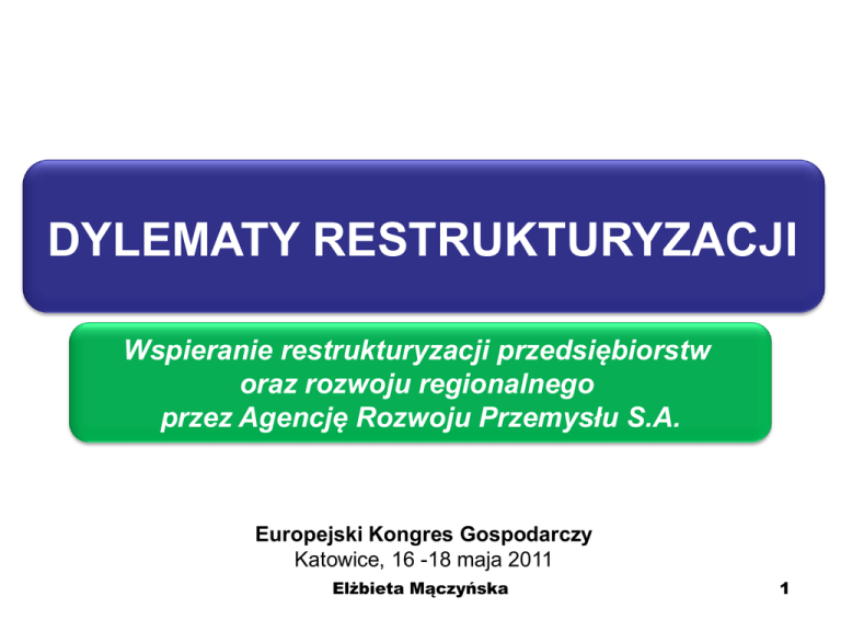 DYLEMATY RESTRUKTURYZACJI Wspieranie restrukturyzacji przedsiębiorstw oraz rozwoju regionalnego przez Agencję Rozwoju Przemysłu S.A. Europejski Kongres Gospodarczy Katowice, 16 -18 maja 2011 Elżbieta Mączyńska 1 Restrukturyzacja - Restrukturyzuj albo giń! Złożoność problemu Przełom cywilizacyjny. Poprzemysłowa gospodarka nietrwałości Globalizacja Globalnie naruszona równowaga Dysfunkcje systemowe Marginalizacja analiz prognostycznych „Nawet jeśli jesteś na właściwym szlaku, przegonią cię, gdy będziesz tylko na nim siedział” - Will Rogers (amerykański komik) „Jeśli się nie zmieniasz to jesteś na wylocie” - Bruce Barton (amerykański polityk) Elżbieta Mączyńska 2 Fale cywilizacyjne Zmiany systemu /ustroju gospodarczego Zmiany typu przekazu, komunikacji Władza i podwładni (górne i dolne warstwy społeczne) I. Rolna Feudalizm Epoka słowa pisanego feudałowie. chłopi feudalni, II. Industrialna Kapitalizm Epoka słowa drukowanego Fabrykanci, Robotnicy najemni III. Postindustrialna –trzecia fala (Toffler) Kapitalizm (????) postindustrialny Epoka języka cyfrowego IV. Internet V. Ponadnarodowe fuzje i przejęcia VI. Gospodarka oparta na wiedzy (Wiek dostępu Rifkin) VII. Wiek kreatywności GOW czy GOM „Nie stać nas na kapitalizm” (?) – Francis Fukuyama czyKoniec historii”?) Elżbieta Mączyńska NETOKRACJA (sieciowa arystokracja) KONSUMTARIAT 3 Złożoność problemu Wielki kryzys - efekty mnożnikowe i kumulacyjne czterech kryzysów: porządku globalnego Globalizacji Neoliberalizmu elit globalnych (A. Kukliński) Elżbieta Mączyńska 4 Francis Fukuyama Fetysz otwartego rynku: Jedną z konsekwencji kryzysu finansowego 2008/2009 było odkrycie przez Amerykanów Brytyjczyków tego, co Azjaci wymyślili już ponad dziesięć lat temu: że otwarte rynki kapitałowe, w połączeniu z nieuregulowanym sektorem finansowym, to doskonała recepta na katastrofę. Foreign Affairs, 24.02.2011, Forum Elżbieta Mączyńska 5 Francis Fukuyama Kryzys przypomniał boleśnie, jakie koszty ciągnie za sobą źle działający sektor publiczny. W Stanach Zjednoczonych urzędy regulacyjne nie sprostały wyzwaniu, bo były niedofinansowane, trudno było im przyciągnąć zdolny personel i bez przerwy musiały walczyć z oporem ze strony polityków. Do tego stanu doprowadzono, gdy obowiązywała doktryna Reagana i Thatcher, która zakładała, że rynek jest skutecznym substytutem kosztownego rządu. Kryzys udowodnił co innego. Elżbieta Mączyńska 6 Lester C. Thurow - Globalnie naruszona równowaga Wywoływana przez równoczesne „tektoniczne” ruchy pięciu „płyt ekonomicznych”, podskórnych sił przemian: upadek komunizmu, co m.in. (zgodnie z koncepcją wahadła) dało podłoże do bezkrytycznej wiary w doktrynę neoliberalizmu. gospodarka bazująca na kapitale intelektualnym, na wiedzy; demografia, w tym gwałtowny przyrost ludności w najbiedniejszych krajach, wzrost mobilności i starzenie się społeczeństw. postępująca globalizacja i związana z nią rosnąca złożoność i nieprzejrzystość powiązań gospodarczych; świat bez dominującego mocarstwa, co przejawia się w stopniowej utracie przez USA mocarstwowej hegemonii. świat bez dominującego mocarstwa, co przejawia się w stopniowej utracie przez USA mocarstwowej hegemonii. Dod (EM): finansyzacja i brak równowagi miedzy sektorem finansowym i realnym Elżbieta Mączyńska 7 Nieład Brak należytej dbałości o przyszłość wywołuje syndrom „psa zżerającego własny ogon”. Brak strategicznej refleksji ekonomicznej i ekologicznej. Elżbieta Mączyńska 8 Bezrefleksyjność GOW ≠ GOM? W bezrefleksyjnej pogoni za bogactwem, oddaliliśmy się od natury, zapominając, że „czas i cierpliwość zmieniają morwowe liście w jedwabną szatę”. Elżbieta Mączyńska 9 Nieznośność „Jesteśmy jak wielka ryba, która została wyciągnięta z wody i wściekle rzuca się i podskakuje, usiłując do niej powrócić. W takim stanie ryba nigdy nie pyta, gdzie wyląduje po następnym uderzeniu ogonem. Czuje jedynie, że jej obecna sytuacja jest nieznośna i że trzeba spróbować czegoś innego”. Elżbieta Mączyńska 10 John C. Bogle: Enough True Measures of Money, Business and Life PIENIĄDZE 1. Za dużo kosztów – za mało wartości (Too Much Cost, Not Enough Value) 2. Za dużo spekulacji – za mało inwestowania (Too Much Speculation, Not Enough Investment ) 3. Za dużo złożoności – za mało prostoty (Too Much Complexity, Not Enough Simplicity) BIZNES 4. Za dużo wyrachowania – za mało zaufania (Too Much Counting, Not Enough Trust) 5. Za dużo komercji – za mało profesjonalizmu (Too Much Business Conduct, Not Enough Professional Conduct) 6. Za dużo kupczenia - za mało obsługi (Too Much Salesmanship, Not Enough Stewardship) 7. Za dużo menedżeryzmu - za mało przywództwa (Too Much Management, Not Enough Leadership) ŻYCIE 8. Za dużo koncentracji na rzeczach – za mało odpowiedzialności (Too Much Focus on Things, Not Enough Focus on Commitment) 9. Za dużo wartości XXI wieku – za mało wartości z XVIII wieku (Too Much Emphasis on 21st Century Values, Not Enough Emphasis on 18th Century Values) 10. Za dużo „sukcesu” – za mało charakteru (Too Much “Success,” Not Enough Character) Elżbieta Mączyńska 11 Innowacyjne produkty finansowe Przyczyniły się do gigantycznych strat. Większość użytkowników nie rozumiała ich istoty, ryzyka i skali, na jaką je zastosowano. Dotyczy to także kierownictwa instytucji finansowych i szefów banków centralnych. Opinie bankowców : "Mało kto z nas, powyżej 35. roku życia i bez doktoratu z fizyki, rozumiał te instrumenty. Ale trudno się było do tego przyznać, a przy tym oferowali je konkurenci i co najważniejsze, przynosiły zyski". Elżbieta Mączyńska 12 Peter Sloterdijk – prawdziwym bohaterem neoliberalizmu jest Harry Potter Wizja świata pozbawionego realnych granic. Odkryj w sobie czarodziej