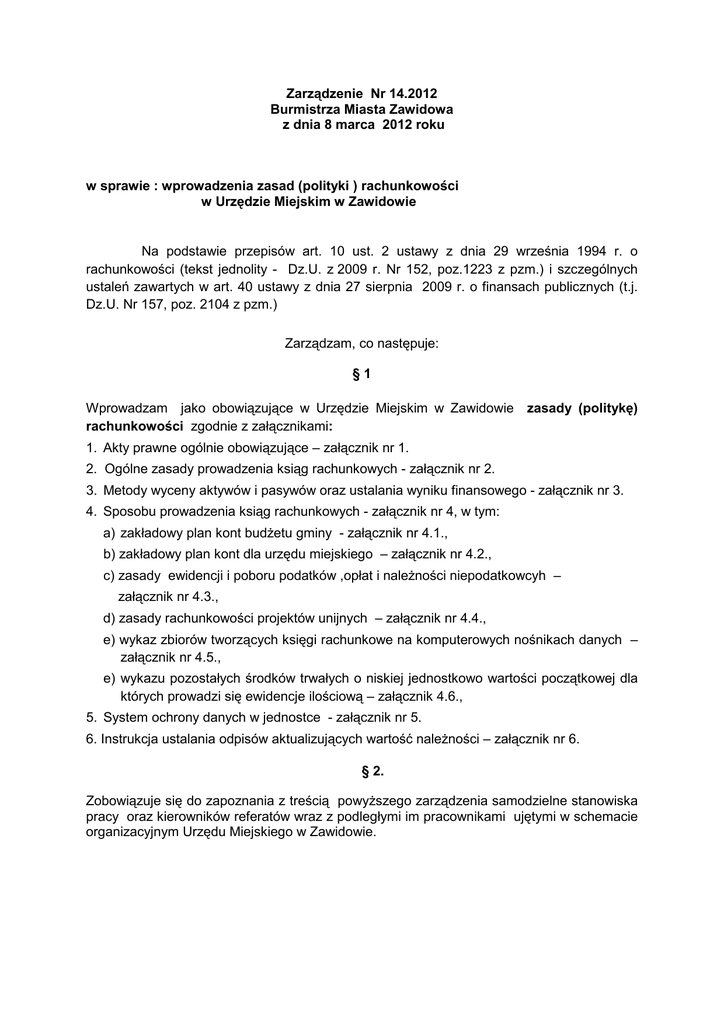 Zarządzenie Nr 14.2012 Burmistrza Miasta Zawidowa z dnia 8 marca 2012 roku w sprawie : wprowadzenia zasad (polityki ) rachunkowości w Urzędzie Miejskim w Zawidowie Na podstawie przepisów art. 10 ust. 2 ustawy z dnia 29 września 1994 r. o rachunkowości (tekst jednolity - Dz.U. z 2009 r. Nr 152, poz.1223 z pzm.) i szczególnych ustaleń zawartych w art. 40 ustawy z dnia 27 sierpnia 2009 r. o finansach publicznych (t.j. Dz.U. Nr 157, poz. 2104 z pzm.) Zarządzam, co następuje: §1 Wprowadzam jako obowiązujące w Urzędzie Miejskim w Zawidowie zasady (politykę) rachunkowości zgodnie z załącznikami: 1. Akty prawne ogólnie obowiązujące – załącznik nr 1. 2. Ogólne zasady prowadzenia ksiąg rachunkowych - załącznik nr 2. 3. Metody wyceny aktywów i pasywów oraz ustalania wyniku finansowego - załącznik nr 3. 4. Sposobu prowadzenia ksiąg rachunkowych - załącznik nr 4, w tym: a) zakładowy plan kont budżetu gminy - załącznik nr 4.1., b) zakładowy plan kont dla urzędu miejskiego – załącznik nr 4.2., c) zasady ewidencji i poboru podatków ,opłat i należności niepodatkowcyh – załącznik nr 4.3., d) zasady rachunkowości projektów unijnych – załącznik nr 4.4., e) wykaz zbiorów tworzących księgi rachunkowe na komputerowych nośnikach danych – załącznik nr 4.5., e) wykazu pozostałych środków trwałych o niskiej jednostkowo wartości początkowej dla których prowadzi się ewidencje ilościową – załącznik 4.6., 5. System ochrony danych w jednostce - załącznik nr 5. 6. Instrukcja ustalania odpisów aktualizujących wartość należności – załącznik nr 6. § 2. Zobowiązuje się do zapoznania z treścią powyższego zarządzenia samodzielne stanowiska pracy oraz kierowników referatów wraz z podległymi im pracownikami ujętymi w schemacie organizacyjnym Urzędu Miejskiego w Zawidowie. §3 Z dniem 1 stycznia 2012 roku traci moc Zarządzenie Nr 2/2011 Burmistrza Miasta Zawidowa z dnia 17 stycznia 2011 roku w sprawie wprowadzenia zasad (polityki) rachunkowości w Urzędzie Miejskim w Zawidowie. §4 Określone niniejszym zarządzeniem zasady (polityka) rachunkowości obowiązują od dnia 1 stycznia 2012 r. § 5. Zarządzenie wchodzi w życie z dniem podpisania i obowiązuje od dnia 1 stycznia 2012r. BURMISTRZ Józef Sontowski Załącznik nr 1 do Zarządzenia Nr 14/2012 Burmistrza Miasta Zawidowa z dnia 8 marca 2012 roku AKTY PRAWNE OGÓLNIE OBOWIĄZUJĄCE 1) ustawa z dnia 29 września 1994 r. o rachunkowości (tj. Dz.U. z 2009 r. Nr 152, poz.1223 z pzm), 2) ustawa z dnia 27 sierpnia 2009r. o finansach publicznych ( tj. Dz. U. Nr 157, poz. 1240 z pzm ), 3) ustawa z dnia 11 marca 2004 r. o podatku od towarów i usług (Dz.U. Nr 54, poz.535 z pzm), 4) rozporządzenie Ministra Finansów z dnia 5 lipca 2010r. sprawie szczególnych zasad rachunkowości oraz planów kont dla budżetu państwa, budżetów jednostek samorządu terytorialnego, jednostek budżetowych, samorządowych zakładów budżetowych, państwowych funduszy celowych oraz państwowych jednostek budżetowych mających siedzibę poza granicami Rzeczypospolitej Polskiej (Dz.U. Nr 128, poz. 861z pzm), 5) rozporządzenie Ministra Finansów z dnia 25 października 2010 r. w sprawie zasad rachunkowości oraz planu kont dla organów podatkowych jednostek samorządu terytorialnego (Dz.U. Nr 208, poz. 1375), 6) rozporządzenie Ministra Finansów z dnia 10 marca 2010 r. w sprawie wydatków strukturalnych (Dz.U. Nr 44, poz.255), 7) rozporządzenie Ministrów Finansów z dnia 2 marca 2010r. w sprawie szczegółowej klasyfikacji dochodów, wydatków, przychodów i rozchodów oraz środków pochodzących ze źródeł zagranicznych (Dz.U. Nr 38, poz.207 z pzm), 8) rozporządzenie Rady Ministrów z dnia 21 maja 2010r. w sprawie sposobu i trybu gospodarowania składnikami rzeczowymi majątku ruchomego, w który wyposażone są jednostki budżetowe (Dz.U. Nr 114, poz.761), 9) rozporządzenie Ministra Finansów z dnia 3 lutego 2010 r. w sprawie sprawozdawczości budżetowej (Dz.U. Nr 20, poz.103), 10) rozporządzenie Ministra Finansów z dnia 7 grudnia 2010r. w sprawie sposobu prowadzenia gospodarki finansowej jednostek budżetowych i samorządowych zakładów budżetowych (Dz.U.Nr 241 poz 1616). BURMISTRZ Józef Sontowski Załącznik nr 2 do Zarządzenia Nr 14/2012 Burmistrza Miasta Zawidowa z dnia 8 marca 2012 roku OGÓLNE ZASADY PROWADZENIA KSIĄG RACHUNKOWYCH DLA BUDŻETU GMINY ORAZ URZĘDU MIEJSKIEGO W ZAWIDOWIE § 1. Miejscem prowadzenia ksiąg rachunkowych jest siedziba Urzędu Miejskiego w Zawidowie. §2 1. Księgi rachunkowe prowadzi się w języku polskim i walucie polskiej. 2. Rokiem obrotowym jest rok kalendarzowy. §3 Okresy sprawozdawcze wchodzące w skład roku obrotowego w ramach sprawozdawczości finansowej i budżetowej to okresy: 1) miesięczne, 2) kwartalne, 3) półroczne, 4) roczne. 5) kwartał - dla : Sprawozdania budżetowe sporządzane są na podstawie rozporządzenia Ministra Finansów w sprawie sprawozdawczości budżetowej oraz innych obowiązujących przepisów szczegółowych. §4 Księgi rachunkowe jednostki obejmują zbiory zapisów księgowych, obrotów i sald, które tworzą: 1) dziennik, 2) księgę główną, 3) księgi pomocnicze, 4) zestawienia: obrotów i sald księgi głównej oraz sald kont ksiąg pomocniczych, 5) wykaz składników aktywów i pasywów (inwentarz). §5 1. Dziennik prowadzony jest w sposób następujący: 1) jego obroty są zgodne z obrotami zestawienia obrotów i sald kont księgi głównej. 2) zdarzenia, jakie nastąpiły w danym okresie sprawozdawczym, ujmowane są w nim chronologicznie, 3) zapisy są kolejno numerowane w okresie roku, co pozwala na ich jednoznaczne powiązanie ze sprawdzonymi i zatwierdzonymi dowodami księgowymi, 4) sumy zapisów (obroty) liczone są w sposób ciągły, 2. Dzienniki częściowe prowadzone są dla określonych grup rodzajowych zdarzeń: 1) WYKAZ DZIENNIKÓW KSIĘGOWYCH prowadzonych w budżecie gminy : KOD P