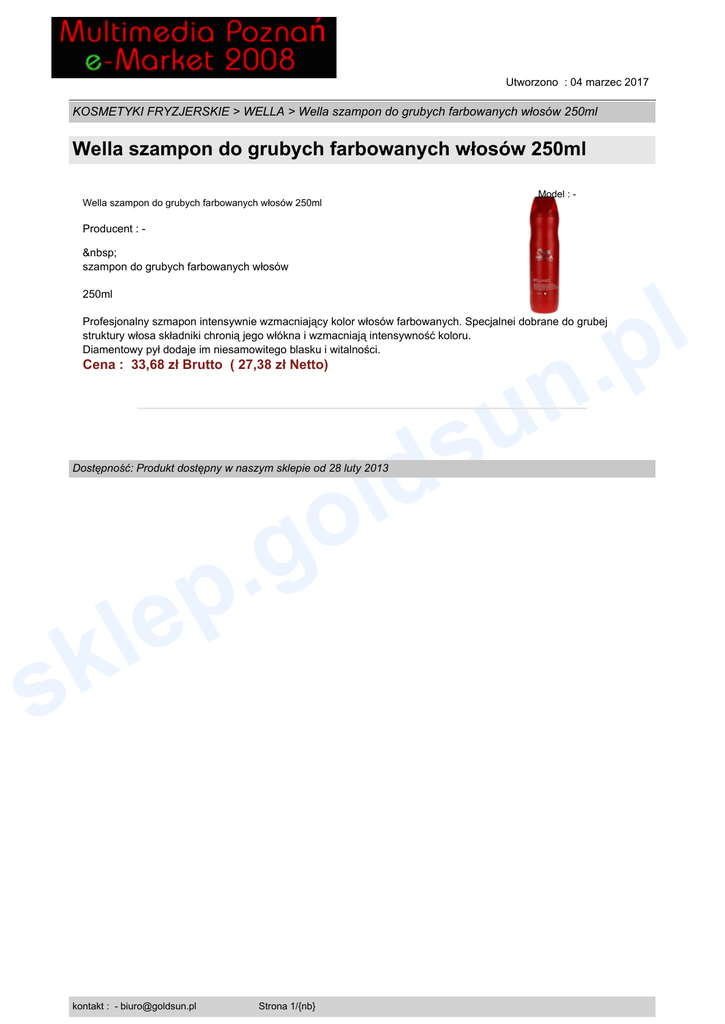 Utworzono : 04 marzec 2017 KOSMETYKI FRYZJERSKIE > WELLA > Wella szampon do grubych farbowanych włosów 250ml Wella szampon do grubych farbowanych włosów 250ml Model : - Wella szampon do grubych farbowanych włosów 250ml Producent : szampon do grubych farbowanych włosów 250ml l .p Profesjonalny szmapon intensywnie wzmacniający kolor włosów farbowanych. Specjalnei dobrane do grubej struktury włosa składniki chronią jego włókna i wzmacniają intensywność koloru. Diamentowy pył dodaje im niesamowitego blasku i witalności. n u Cena : 33,68 zł Brutto ( 27,38 zł Netto) s ld Dostępność: Produkt dostępny w naszym sklepie od 28 luty 2013 p le k s kontakt : - [email protected] o .g Strona 1/{nb}