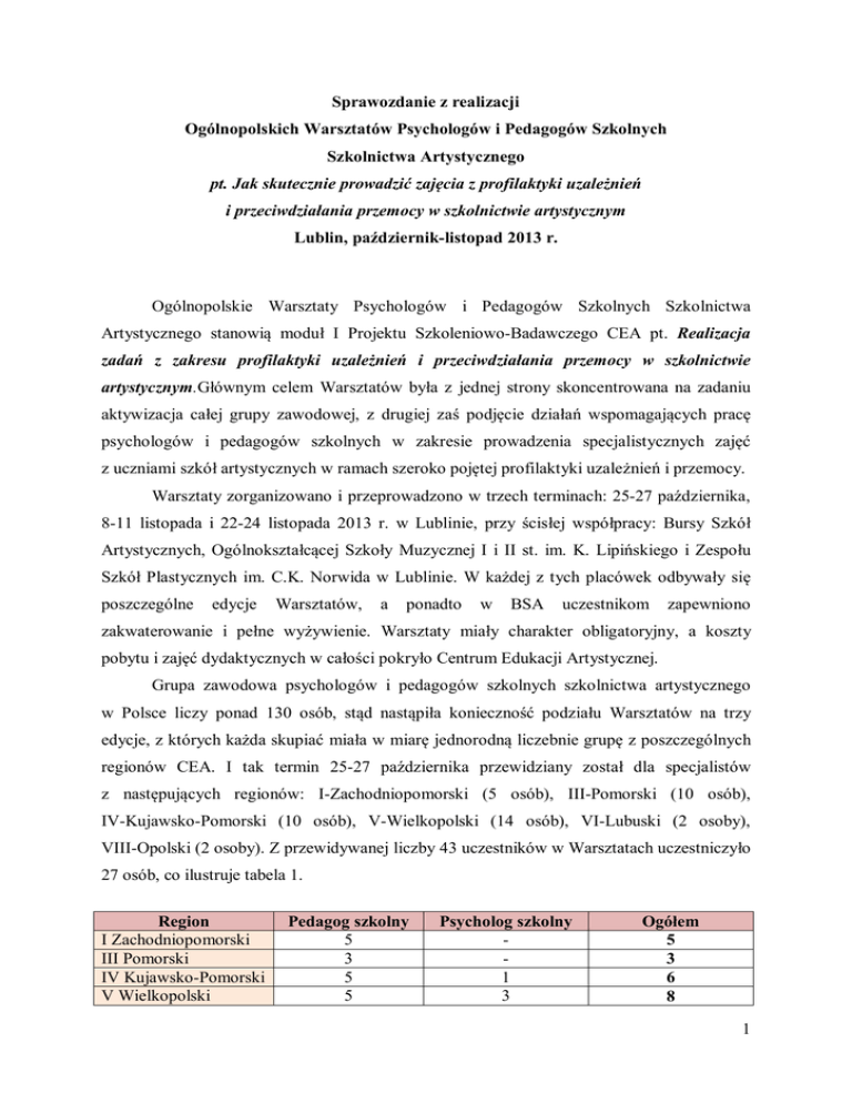Sprawozdanie z realizacji Ogólnopolskich Warsztatów Psychologów i Pedagogów Szkolnych Szkolnictwa Artystycznego pt. Jak skutecznie prowadzić zajęcia z profilaktyki uzależnień i przeciwdziałania przemocy w szkolnictwie artystycznym Lublin, październik-listopad 2013 r. Ogólnopolskie Warsztaty Psychologów i Pedagogów Szkolnych Szkolnictwa Artystycznego stanowią moduł I Projektu Szkoleniowo-Badawczego CEA pt. Realizacja zadań z zakresu profilaktyki uzależnień i przeciwdziałania przemocy w szkolnictwie artystycznym.Głównym celem Warsztatów była z jednej strony skoncentrowana na zadaniu aktywizacja całej grupy zawodowej, z drugiej zaś podjęcie działań wspomagających pracę psychologów i pedagogów szkolnych w zakresie prowadzenia specjalistycznych zajęć z uczniami szkół artystycznych w ramach szeroko pojętej profilaktyki uzależnień i przemocy. Warsztaty zorganizowano i przeprowadzono w trzech terminach: 25-27 października, 8-11 listopada i 22-24 listopada 2013 r. w Lublinie, przy ścisłej współpracy: Bursy Szkół Artystycznych, Ogólnokształcącej Szkoły Muzycznej I i II st. im. K. Lipińskiego i Zespołu Szkół Plastycznych im. C.K. Norwida w Lublinie. W każdej z tych placówek odbywały się poszczególne edycje Warsztatów, a ponadto w BSA uczestnikom zapewniono zakwaterowanie i pełne wyżywienie. Warsztaty miały charakter obligatoryjny, a koszty pobytu i zajęć dydaktycznych w całości pokryło Centrum Edukacji Artystycznej. Grupa zawodowa psychologów i pedagogów szkolnych szkolnictwa artystycznego w Polsce liczy ponad 130 osób, stąd nastąpiła konieczność podziału Warsztatów na trzy edycje, z których każda skupiać miała w miarę jednorodną liczebnie grupę z poszczególnych regionów CEA. I tak termin 25-27 października przewidziany został dla specjalistów z następujących regionów: I-Zachodniopomorski (5 osób), III-Pomorski (10 osób), IV-Kujawsko-Pomorski (10 osób), V-Wielkopolski (14 osób), VI-Lubuski (2 osoby), VIII-Opolski (2 osoby). Z przewidywanej liczby 43 uczestników w Warsztatach uczestniczyło 27 osób, co ilustruje tabela 1. Region I Zachodniopomorski III Pomorski IV Kujawsko-Pomorski V Wielkopolski Pedagog szkolny 5 3 5 5 Psycholog szkolny 1 3 Ogółem 5 3 6 8 1 VI Lubuski VIII Opolski IX Śląski* X Małopolski* Razem: 1 1 1 1 1 1 1 1 2 21 6 27 * Uczestnicy, którzy z ważnych powodów zmienili termin Warsztatów W terminie 8-10 listopada udział wzięli psycholodzy i pedagodzy z regionów: VII-Dolnośląski (7 osób), IX-Śląski (16 osób), X-Małopolski (12 osób), XII-Lubelski (7 osób). Z zakładanej liczby 46 uczestników w Warsztatach udział wzięło 35 osób. Dane liczbowe ilustruje tabela 2. Region VII Dolnośląski IX Śląski X Małopolski XII Lubelski Pedagog szkolny 4 9 7 3 Psycholog szkolny 2 4 2 4 Ogółem 6 13 9 7 23 12 35 Razem: W ostatnim terminie – 22-24 listopada uczestniczyli specjaliści z następujących regionów: XI-Podkarpacki (7 osób), XIII-Łódzki (9 osób), XIV/XV-Północno-Wschodni (9 osób), XVI-Mazowiecki (19 osób). Przewidywano liczbę 42 uczestników, a udział w Warsztatach wzięło 40 osób (tabela 3). Region XI Podkarpacki XIII Łódzki XIV/XV Północno-Wschodni XVI Mazowiecki III Pomorski* V Wielkopolski* VII Dolnośląski* IX Śląski* Razem: Pedagog szkolny 6 4 3 6 1 Psycholog szkolny 3 4 8 2 2 1 - Ogółem 6 7 7 14 2 2 1 1 20 20 40 * Uczestnicy, którzy z ważnych powodów zmienili termin Warsztatów Ogółem w Ogólnopolskich Warsztatach uczestniczyły 102 osoby, w tym 38 psychologów i 64 pedagogów szkolnych, co stanowi 77,9% całej grupy zawodowej specjalistów szkolnictwa artystycznego. Dokładne dane liczbowe ilustruje tabela 4. 2 Region I Zachodniopomorski III Pomorski IV Kujawsko-Pomorski V Wielkopolski VI Lubuski VII Dolnośląski VIII Opolski IX Śląski X Małopolski XI Podkarpacki XII Lubelski XIII Łódzki XIV/XV Północno-Wschodni XVI Mazowiecki Pedagog szkolny 5 3 5 5 1 4 1 10 8 6 3 4 3 6 Psycholog szkolny 2 1 5 3 5 3 4 3 4 8 Ogółem 5 5 6 10 1 7 1 15 11 6 7 7 7 14 64 38 102 obligatoryjnego charakteru Razem: Rodzi się zasadne pytanie, dlaczego, mimo przedsięwzięcia organizowanego przez Centrum Edukacji Artystycznej, udziału w nim nie wzięło 22,1% osób. To pytanie kieruję do dyrektorów szkół i wizytatorów regionalnych, którzy zostali pisemnie poinformowani zarówno o planowanych Warsztatach, jak i o całym Projekcie. Obecność psychologów i pedagogów szkolnych była istotna nie tylko z powodu wagi problemów związanych z profilaktyką w szkole artystycznej, lecz również dlatego, iż każdy specjalista został włączony w ogólnopolskie badania sondażowe diagnozujące poziom zagrożenia uzależnieniami i przemocą wśród uczniów szkół artystycznych. Są to pierwsze, prowadzone na tak dużą skalę, badania CEA z zakresu profilaktyki. Szkoły, z których specjaliści nie dotarli na Warsztaty, zostały automatycznie wyeliminowane z uczestnictwa w badaniach, co może mieć wpływ na obniżenie wskaźnika reprezentatywności uzyskanych wyników dla polskiego szkolnictwa artystycznego. Podczas Warsztatów specjaliści-trenerzy przeprowadzili z psychologami i pedagogami szkolnymi pięć sesji dwu-godzinnych o tematyce związanej z przeciwdziałaniem: alkoholizmowi, narkomanii, uzależnieniu od komputera i Internetu, przemocy seksualnej i przemocy w rodzinie. Trenerzy zostali wyłonieni głównie z naszej własnej grupy zawodowej, bowiem niezaprzeczalnym faktem jest, iż w gronie psychologów i pedagogów szkolnych pracujących w szkolnictwie artystycznym znajdują się specjaliści ze świetnymi kwalifikacjami, szerokimi kompetencjami i ogromnym bagażem doświadczeń zawodowych. Sesja dotycząca przeciwdziałania alkoholizmowi pt. Jak zrozumieć uzależnienie od alkoholu poprowadzona została przez Marię Ugarenko-Kupińską, pedagoga Zespołu Szkół 3 Plastycznych w Kole, która posiada duże doświadczenie w pracy z r