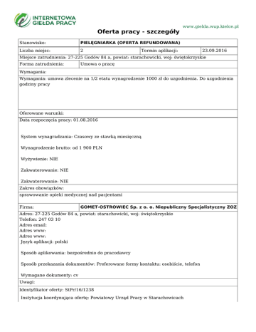 Oferta pracy - szczegóły Stanowisko: PIELĘGNIARKA (OFERTA REFUNDOWANA) Liczba miejsc: 2 www.gielda.wup.kielce.pl Termin aplikacji: 23.09.2016 Miejsce zatrudnienia: 27-225 Godów 84 a, powiat: starachowicki, woj: świętokrzyskie Forma zatrudnienia: Umowa o pracę Wymagania: Wymagania: umowa zlecenie na 1/2 etatu wynagrodzenie 1000 zł do uzgodnienia. Do uzgodnienia godziny pracy Oferowane warunki: Data rozpoczęcia pracy: 01.08.2016 System wynagradzania: Czasowy ze stawką miesięczną Wynagrodzenie brutto: od 1 900 PLN Wyżywienie: NIE Zakwaterowanie: NIE Zakwaterowanie: NIE Zakres obowiązków: sprawowanie opieki medycznej nad pacjentami Firma: GOMET-OSTROWIEC Sp. z o. o. Niepubliczny Specjalistyczny ZOZ Adres: 27-225 Godów 84 a, powiat: starachowicki, woj: świętokrzyskie Telefon: 247 03 10 Adres email: Adres www: Adres www: Język aplikacji: polski Sposób aplikowania: bezpośrednio do pracodawcy Sposób przekazania dokumentów: Preferowane formy kontaktu: osobiście, telefon Wymagane dokumenty: cv Uwagi: Identyfikator oferty: StPr/16/1238 Instytucja koordynująca ofertę: Powiatowy Urząd Pracy w Starachowicach Urząd Pracy dokłada wszelkich starań, aby oferty pracy będące w zasobach urzędu, były rzetelne i wiarygodne. Ponieważ wszystkie oferty pracy pochodzą od osób trzecich Urząd Pracy zastrzega, że odpowiedzialność za ewentualne rozbieżności pomiędzy warunkami pracy zaprezentowanymi w niniejszej ofercie a warunkami zaproponowanymi przez potencjalnego pracodawcę ponosi pracodawca.