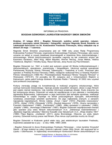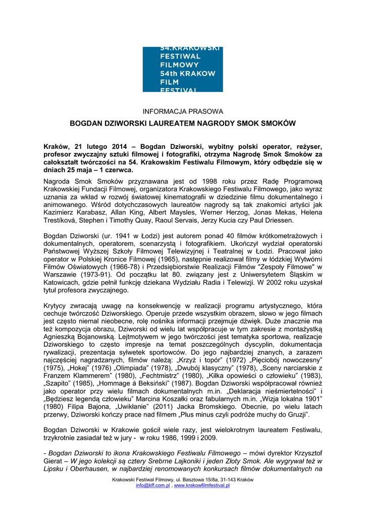 INFORMACJA PRASOWA BOGDAN DZIWORSKI LAUREATEM NAGRODY SMOK SMOKÓW Kraków, 21 lutego 2014 – Bogdan Dziworski, wybitny polski operator, reżyser, profesor zwyczajny sztuki filmowej i fotografiki, otrzyma Nagrodę Smok Smoków za całokształt twórczości na 54. Krakowskim Festiwalu Filmowym, który odbędzie się w dniach 25 maja – 1 czerwca. Nagroda Smok Smoków przyznawana jest od 1998 roku przez Radę Programową Krakowskiej Fundacji Filmowej, organizatora Krakowskiego Festiwalu Filmowego, jako wyraz uznania za wkład w rozwój światowej kinematografii w dziedzinie filmu dokumentalnego i animowanego. Wśród dotychczasowych laureatów nagrody są tak znakomici artyści jak Kazimierz Karabasz, Allan King, Albert Maysles, Werner Herzog, Jonas Mekas, Helena Trestíková, Stephen i Timothy Quay, Raoul Servais, Jerzy Kucia czy Paul Driessen. Bogdan Dziworski (ur. 1941 w Łodzi) jest autorem ponad 40 filmów krótkometrażowych i dokumentalnych, operatorem, scenarzystą i fotografikiem. Ukończył wydział operatorski Państwowej Wyższej Szkoły Filmowej Telewizyjnej i Teatralnej w Łodzi. Pracował jako operator w Polskiej Kronice Filmowej (1965), następnie realizował filmy w łódzkiej Wytwórni Filmów Oświatowych (1966-78) i Przedsiębiorstwie Realizacji Filmów "Zespoły Filmowe" w Warszawie (1973-91). Od początku lat 80. związany jest z Uniwersytetem Śląskim w Katowicach, gdzie pełnił funkcję dziekana Wydziału Radia i Telewizji. W 2002 roku uzyskał tytuł profesora zwyczajnego. Krytycy zwracają uwagę na konsekwencję w realizacji programu artystycznego, która cechuje twórczość Dziworskiego. Operuje przede wszystkim obrazem, słowo w jego filmach jest często niemal nieobecne, rolę nośnika informacji przejmuje dźwięk. Duże znacznie ma też kompozycja obrazu, Dziworski od wielu lat współpracuje w tym zakresie z montażystką Agnieszką Bojanowską. Lejtmotywem w jego twórczości jest tematyka sportowa, realizacje Dziworskiego to często impresje na temat poszczególnych dyscyplin, dokumentacja rywalizacji, prezentacja sylwetek sportowców. Do jego najbardziej znanych, a zarazem najczęściej nagradzanych, filmów należą: „Krzyż i topór” (1972) „Pięciobój nowoczesny” (1975), „Hokej” (1976) „Olimpiada” (1978), „Dwubój klasyczny” (1978), „Sceny narciarskie z Franzem Klammerem” (1980), „Fechtmistrz” (1980), „Kilka opowieści o człowieku” (1983), „Szapito” (1985), „Hommage á Beksiński” (1987). Bogdan Dziworski współpracował również jako operator przy wielu filmach dokumentalnych m.in. „Deklaracja nieśmiertelności” i „Będziesz legendą człowieku” Marcina Koszałki oraz fabularnych m.in. „Wizja lokalna 1901” (1980) Filipa Bajona, „Uwikłanie” (2011) Jacka Bromskiego. Obecnie, po wielu latach przerwy, Dziworski kończy prace nad filmem „Plus minus czyli podróże muchy do Gruzji”. Bogdan Dziworski w Krakowie gościł wiele razy, jest wielokrotnym laureatem Festiwalu, trzykrotnie zasiadał też w jury - w roku 1986, 1999 i 2009. - Bogdan Dziworski to ikona Krakowskiego Festiwalu Filmowego – mówi dyrektor Krzysztof Gierat – W jego kolekcji są cztery Srebrne Lajkoniki i jeden Złoty Smok. Ale wygrywał też w Lipsku i Oberhausen, w najbardziej renomowanych konkursach filmów dokumentalnych na Krakowski Festiwal Filmowy, ul. Basztowa 15/8a, 31-143 Kraków [email protected] , www.krakowfilmfestival.pl świecie. Bywał u nas jurorem, rok temu prezentowaliśmy wystawę jego zdjęć. Wspaniały nauczyciel, piękny człowiek. Mistrz. Tegoroczny laureat nagrody Smok Smoków od wielu lat odnosi także sukcesy w dziedzinie fotografii, opublikował albumy fotograficzne: „My View Polish Impressions in Photography” (Wiedeń, 1981); „Kino – Oko. Warsztat operatora filmowego” z Jerzym Łukaszewiczem (Warszawa, 2006); „Dziworski 1/250 sek.” (Warszawa, 2000); “Fotografia polska” (Warszawa, 1999). Jego fotografie były prezentowane m.in. na wystawach w Berlinie, Innsbrucku, Wiedniu, Warszawie, Krakowie i Wrocławiu. Poczesne miejsce w biografii Dziworskiego zajmuje praca pedagogiczna. Jest promotorem i recenzentem wielu prac magisterskich, z wykładami gościnnymi podróżował m.in. do Stanów Zjednoczonych (New York University of the Arts, Museum of Modern Art, Columbia University, Film Society of Lincoln Center), Meksyku (Centro de Capacitacion Cinematografica), Szwajcarii (Ecole Cantonale d'art de Lausanne), Danii (Den Danske Film Skole) oraz Wielkiej Brytani (University of Lincoln). Uroczyste wręczenie Nagrody Smok Smoków Bogdanowi Dziworskiemu będzie miało miejsce podczas 54. Krakowskiego Festiwalu Filmowego, 27 maja 2014 roku, w kinie Kijów.Centrum. Planowana jest retrospektywa filmów reżysera oraz jego master class. Doniesienia festiwalowe o programie 54. edycji można śledzić na stronie internetowej Festiwalu www.krakowfilmfestival.pl oraz na profilach festiwalowych na portalach Facebook i Twitter. Filmografia Bogdana Dziworskiego na łamach portalu Filmpolski.pl. Kontakt dla mediów: Anna E. Dziedzic PR manager [email protected] Tel. 696 448 795 Krakowski Festiwal Filmowy, ul. Basztowa 15/8a, 31-143 Kraków [email protected] , www.krakowfilmfestival.pl