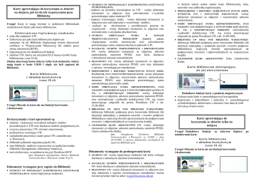 Karty uprawniające do korzystania ze zbiorów na miejscu, jak też do ich wypożyczania poza Bibliotekę Uwaga! Karty te mogą również w niektórych bibliotekach wydziałowych służyć jako karty biblioteczne. Elektroniczna legitymacja studencka tylko dla studentów UW, traktowana jest jako karta biblioteczna dopiero po zapisaniu się do Biblioteki (legitymację można aktywować osobiście w Wypożyczalni Miejscowej lub zdalnie przez stronę internetową BUW), legitymacja nie ma dodatkowych funkcji, studenci UW, którzy nie otrzymali ELS muszą wyrobić kartę biblioteczną ( cena 10 zł). Zdalna aktywacja konta dotyczy tylko tych studentów, którzy mają konto w bazie USOS i nigdy nie byli zapisani do Biblioteki. Karta biblioteczna z układem bezstykowym (cena 10 zł) - studenci na kierunku równoległym na UW – ważny dokument tożsamości ze zdjęciem oraz zaświadczenie z wydziału potwierdzające status studenta UW, - studenci wznawiający studia – ważny dokument tożsamości ze zdjęciem oraz zaświadczenie o wznowieniu studiów, - studenci po absolutorium z przedłużonym prawem do wypożyczeń – ważny dokument tożsamości ze zdjęciem oraz zaświadczenie o uzyskaniu absolutorium; STUDENCI ODBYWAJĄCY STUDIA W RAMACH MIĘDZYUCZELNIANYCH PROGRAMÓW (MOST): indeks i legitymacja uczelni macierzystej oraz zaświadczenie potwierdzające status studenta/słuchacza jednostki UW; SŁUCHACZE STUDIÓW PODYPLOMOWYCH I DOKTORANCKICH UW: ważny dokument tożsamości ze zdjęciem, adresem zamieszkania, numerem PESEL oraz karta słuchacza z aktualnymi wpisami semestralnymi; PRACOWNICY UW: ważny dokument tożsamości ze zdjęciem, adresem zamieszkania, numerem PESEL oraz inny dokument z wpisem stwierdzającym zatrudnienie; PROFESOROWIE I DOKTORZY HABILITOWANI INNYCH SZKÓŁ WYŻSZYCH, PAN I INSTYTUTÓW BADAWCZYCH: ważny dokument tożsamości ze zdjęciem, warszawskim adresem zamieszkania, numerem PESEL oraz dokument potwierdzający status samodzielnego pracownika nauki; OSOBY ODBYWAJĄCE STUDIA KRÓTKOTERMINOWE, STAŻ NAUKOWY LUB KORZYSTAJĄCE Z INNYCH FORM KSZTAŁCENIA W UW, A NIEOTRZYMUJĄCE INDEKSÓW: ważny dokument Uwaga! Obecnie ta karta nie ma funkcji kserowania i drukowania. Do korzystania z kart uprawnieni są: studenci i doktoranci wszystkich rodzajów studiów prowadzonych w UW oraz słuchacze studiów podyplomowych, wszyscy pracownicy UW, również emerytowani, profesorowie wizytujący UW, samodzielni pracownicy nauki spoza UW, zameldowani w Warszawie, biblioteki jednostek organizacyjnych UW, inne biblioteki naukowe warszawskie za zgodą kierownika Oddziału Udostępniania i Informacji Naukowej, inni użytkownicy, na podstawie decyzji Dyrektora BUW (por. Regulamin udostępniania zbiorów Biblioteki Uniwersyteckiej w Warszawie: rozdz. II, p.7) Dokumenty wymagane przy zapisie do Biblioteki STUDENCI UW POSIADAJĄCY ELEKTRONICZNĄ LEGITYMACJĘ STUDENCKĄ (ELS): ważna legitymacja studencka; w którym należy podać numer karty bibliotecznej, imię, nazwisko oraz jednostkę organizacyjna; STUDENCI UW NIEPOSIADAJĄCY ELEKTRONICZNEJ LEGITYMACJI STUDENCKIEJ (ELS): tożsamości ze zdjęciem, adresem zamieszkania, numerem PESEL oraz zaświadczenie z jednostki dydaktycznej UW, wg wzoru stanowiącego załącznik do pisma Prorektora UW z dn. 23.09.2003; BIBLIOTEKI UW ORAZ INNE BIBLIOTEKI WARSZAWSKIE: deklaracja biblioteki podpisana przez kierownika biblioteki lub instytucji nadrzędnej, z podaniem nazwisk i wzorów podpisów bibliotekarzy (najwyżej dwóch) upoważnionych do podpisywania rewersów i odpowiedzialnych za wypożyczone książki; CZŁONKOWIE KLUBU ABSOLWENTÓW UW: ważny dokument tożsamości ze zdjęciem, adresem zamieszkania, numerem PESEL i karta członkowska Klubu. (por. Zarządzenie Dyrektora Biblioteki Uniwersyteckiej w Warszawie nr 6/2003 z dnia 20.10.2003 w sprawie dokumentów niezbędnych do zapisu do Biblioteki, p.2) Dokumenty wymagane do prolongowania karty STUDENCI UW: SŁUCHACZE STUDIÓW PODYPLOMOWYCH I DOKTORANCKICH UW: karta słuchacza z aktualnymi wpisami semestralnymi; PRACOWNICY UW: ważna legitymacja studencka lub karta wolnego słuchacza z aktualnymi wpisami semestralnymi; ważny dokument tożsamości ze zdjęciem oraz inny dokument z wpisem stwierdzającym zatrudnienie; można również przesłać mail na adres: wypoć[email protected], PROFESOROWIE I DOKTORZY HABILITOWANI INNYCH SZKÓŁ WYŻSZYCH, PAN I INSTYTUTÓW BADAWCZYCH: ważny dokument tożsamości ze zdjęciem i warszawskim adresem zamieszkania; OSOBY ODBYWAJĄCE STUDIA KRÓTKOTERMINOWE, STAŻ NAUKOWY LUB KORZYSTAJĄCE Z INNYCH FORM KSZTAŁCENIA W UW, A NIEOTRZYMUJĄCE INDEKSÓW: zaświadczenie z jednostki dydaktycznej UW, wg wzoru stanowiącego załącznik do pisma Prorektora UW z dn. 23.09.2003; BIBLIOTEKI UW ORAZ INNE BIBLIOTEKI WARSZAWSKIE: deklaracja biblioteki podpisana przez kierownika biblioteki lub instytucji nadrzędnej, z podaniem nazwisk i wzorów podpisów bibliotekarzy (najwyżej dwóch) upoważnionych do podpisywania rewersów i odpowiedzialnych za wypożyczone książki; CZŁONKOWIE KLUBU ABSOLWENTÓW: karta członkowska Klubu. Karta biblioteczna obowiązująca, ale już niewystawiana Pasek magnetyczny Dodatkowe funkcje karty z paskiem magnetycznym: wykonywanie kopii w samoobsługowych kserografach, kopiowanie z mikrofilmów i mikrofisz w samoobsługowej czytnikokopiarce, drukowanie z internetu i baz danych (zob. Instrukcja drukowania). Karty uprawniające do korzystania ze zbiorów tylko na miejscu Uwaga! Dodatkowe naładowaniu karty. funkcje są aktywne dopiero Karta biblioteczna z układem bezstykowym (cena 10 zł) Uwaga! Obecnie ta karta nie ma funkcji kserowania i drukowania Data ważności karty po Karta biblioteczna obowiązująca, ale już niewystawiana Karta z paskiem magnetycznym Koszt wydania duplikatu karty określa cennik usług BUW. Obecnie koszt ten wynosi 15 zł. (por. Regulamin udostępniania zbiorów BUW: rozdz.I, p.3 b; Cennik usług świadczonych w Bibl