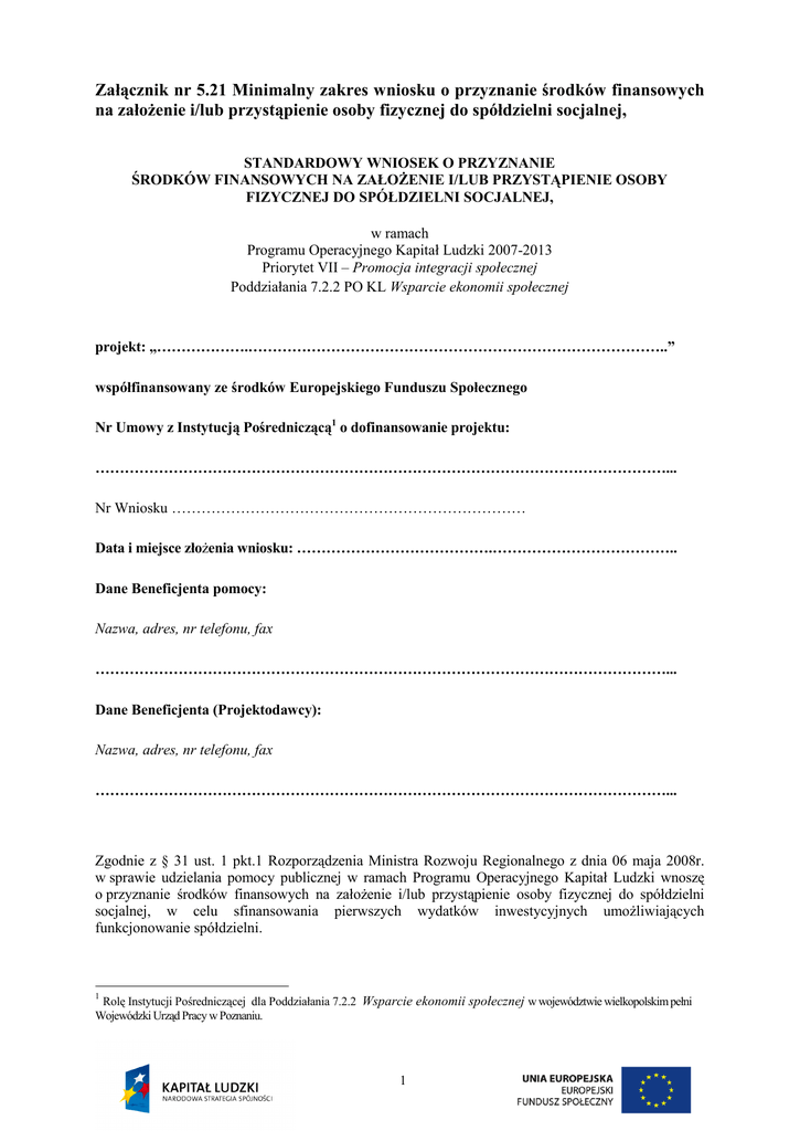 Załącznik nr 5.21 Minimalny zakres wniosku o przyznanie środków finansowych na założenie i/lub przystąpienie osoby fizycznej do spółdzielni socjalnej, STANDARDOWY WNIOSEK O PRZYZNANIE ŚRODKÓW FINANSOWYCH NA ZAŁOŻENIE I/LUB PRZYSTĄPIENIE OSOBY FIZYCZNEJ DO SPÓŁDZIELNI SOCJALNEJ, w ramach Programu Operacyjnego Kapitał Ludzki 2007-2013 Priorytet VII – Promocja integracji społecznej Poddziałania 7.2.2 PO KL Wsparcie ekonomii społecznej projekt: „……………….…………………………………………………………………………..” współfinansowany ze środków Europejskiego Funduszu Społecznego Nr Umowy z Instytucją Pośredniczącą1 o dofinansowanie projektu: ………………………………………………………………………………………………………... Nr Wniosku ……………………………………………………………… Data i miejsce złożenia wniosku: ………………………………….……………………………….. Dane Beneficjenta pomocy: Nazwa, adres, nr telefonu, fax ………………………………………………………………………………………………………... Dane Beneficjenta (Projektodawcy): Nazwa, adres, nr telefonu, fax ………………………………………………………………………………………………………... Zgodnie z § 31 ust. 1 pkt.1 Rozporządzenia Ministra Rozwoju Regionalnego z dnia 06 maja 2008r. w sprawie udzielania pomocy publicznej w ramach Programu Operacyjnego Kapitał Ludzki wnoszę o przyznanie środków finansowych na założenie i/lub przystąpienie osoby fizycznej do spółdzielni socjalnej, w celu sfinansowania pierwszych wydatków inwestycyjnych umożliwiających funkcjonowanie spółdzielni. 1 Rolę Instytucji Pośredniczącej dla Poddziałania 7.2.2 Wsparcie ekonomii społecznej w województwie wielkopolskim pełni Wojewódzki Urząd Pracy w Poznaniu. 1 Całkowite wydatki inwestycyjne wynoszą brutto/netto2: ………………… PLN. Wnioskowana kwota dofinansowania wynosi: ………………… PLN. UZASADNIENIE …………………………………………………………………………………………………………… …………………………………………………………………………………………………………… …………………………………………………………………………………………………………… …………………………………………………………………………………………………………… …………………………………………………………………………………………………………… …………………………………………………………………………………………….. Do niniejszego wniosku załącza się następujące dokumenty: wpis do Krajowego Rejestru Sądowego lub innego właściwego rejestru*, kopia nadania numeru REGON Beneficjentowi pomocy*, kopia dokumentu zawierającego PESEL Beneficjenta pomocy, biznes plan na okres 2 lat działalności przedsiębiorstwa, kopia aktualnego dokumentu poświadczającego zgłoszenie w ZUS/KRUS*, oświadczenie o nieotrzymaniu, w roku kalendarzowym, w którym Beneficjent pomocy przystępuje do projektu oraz w poprzedzających go dwóch latach kalendarzowych, pomocy de minimis z różnych źródeł i w różnych formach, której wartość brutto łącznie z pomocą, o którą się ubiega, przekracza równowartość w złotych kwoty 200 000,00 euro, a w przypadku podmiotu prowadzącego działalność w sektorze transportu drogowego – równowartość w złotych kwoty 100 000, 00 euro, obliczonych według średniego kursu Narodowego Banku Polskiego obowiązującego w dniu udzielenia pomocy, lub 7) oświadczenie o wysokości otrzymanej pomocy de minimis w roku kalendarzowym, w którym Beneficjent pomocy przystępuje do projektu oraz w poprzedzających go dwóch latach kalendarzowych wraz z zaświadczeniami o pomocy de minimis, wystawionymi przez podmioty udzielające pomoc 1) 2) 3) 4) 5) 6) ………………………………………… (Data i Podpis Beneficjenta pomocy) * Dokumenty należy dostarczyć po dokonaniu czynności związanych z zarejestrowaniem przedsiębiorstwa. 2 Maksymalna wartość pomocy finansowej przyznanej Beneficjentowi pomocy wynosi 20 000,00 PLN . 2