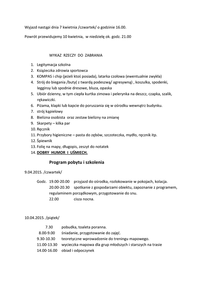 Wyjazd nastąpi dnia 7 kwietnia /czwartek/ o godzinie 16.00. Powrót przewidujemy 10 kwietnia, w niedzielę ok. godz. 21.00 WYKAZ RZECZY DO ZABRANIA 1. 2. 3. 4. Legitymacja szkolna Książeczka zdrowia sportowca KOMPAS i chip (jeżeli ktoś posiada), latarka czołowa (ewentualnie zwykła) Strój do biegania /buty( z twardą podeszwą/ agresywną) , koszulka, spodenki, legginsy lub spodnie dresowe, bluza, opaska 5. Ubiór dzienny, w tym ciepła kurtka zimowa i pelerynka na deszcz, czapka, szalik, rękawiczki. 6. Piżama, klapki lub kapcie do poruszania się w ośrodku wewnątrz budynku. 7. strój kąpielowy 8. Bielizna osobista oraz zestaw bielizny na zmianę 9. Skarpety – kilka par 10. Ręcznik 11. Przybory higieniczne – pasta do zębów, szczoteczka, mydło, ręcznik itp. 12. Śpiewnik 13. Folię na mapy, długopis, zeszyt do notatek 14. DOBRY HUMOR I UŚMIECH. Program pobytu i szkolenia 9.04.2015. /czwartek/ Godz. 19.00-20.00 przyjazd do ośrodka, rozlokowanie w pokojach, kolacja. 20.00-20.30 spotkanie z gospodarzami obiektu, zapoznanie z programem, regulaminem porządkowym, przygotowanie do snu. 22.00 cisza nocna. 10.04.2015. /piątek/ 7.30 8.00-9.00 9.30-10.30 11.00-13.30 14.00-16.00 pobudka, toaleta poranna. śniadanie, przygotowanie do zajęć. teoretyczne wprowadzenie do treningu mapowego. wycieczka mapowa dla grup młodszych i starszych na trasie obiad i odpoczynek 16.00-18.00 19.00-21.30 22.00 Krótkie trasy na symbolach skalnych i rzeźbie kolacja, program ogniskowy, konkurs znajomości znaków cisza nocna 11.04.2015. /sobota/ 7.30 8.00-9.00 11.00-13.30 14.00-16.00 16.00-18.00 19.00-22.30 23.00 pobudka, toaleta poranna. śniadanie, przygotowanie do zajęć. Trasa wejście-wyjście o wydłużonym przebiegu. obiad, savoir-vivre na sportowo i odpoczynek Start sprawdzający-indywidualny ognisko, nauka piosenek, starsi- sauna regeneracyjna cisza nocna. 12.04.2015. /niedziela/ 7.30 8.00-9.00 10.00-12.00 13.00 14.00-15.30 16.00 16.15-16.45 20.00-20.30 pobudka, toaleta poranna. śniadanie, przygotowanie do zawodów. zawody sztafetowe obiad zakończenie zgrupowania, pakowanie. wyjazd z ośrodka zwiedzenie Zamku w Ogrodzieńcu przyjazd do domu. Gdzie strumyk płynie z wolna Gdzie strumyk płynie z wolna, rozsiewa zioła maj, stokrotka rosła polna, I a nad nią szumiał gaj. I bis Wtem harcerz idzie drogą : „Stokrotko, witam cię, twój urok mię zachwyca, I czy chcesz być mą, czy nie. I bis Ma miłość jest ogromna, głęboko w sercu skryta, i nikt jej nie odgadnie, i nikt jej nie odczyta.” I I bis Gdzie strumyk płynie z wolna, rozsiewa zioła maj, stokrotka rosła polna, I z harcerzem poszła w dal. I bis Płonie ognisko w lesie Płonie ognisko w lesie, wiatr smętną piosnkę niesie, przy ogniu zaś drużyna gawędę rozpoczyna. Czuj czuj czuwaj! Czuj czuj czuwaj! Najstarszy druh zawoła. Czuj czuj czuwaj! Czuj czuj czuwaj! Rozlega się dokoła. Czuj czuj czuj czuj czuwaj czuwaj! Szła dzieweczka Szła dzieweczka do laseczka, do zielonego, do zielonego, do zielonego. napotkała myśliweczka bardzo szwarnego, bardzo szwarnego, bardzo szwarnego. La la la la….. O mój miły myśliweczku, bardzom ci rada, bardzom ci rada, bardzom ci rada, dałabym ci chleba z masłem, alem już zjadła, alem już zjadła, alem już zjadła….La la la …. OBOZOWE TANGO Obozowe tango śpiewam dla ciebie, Wiatr je niesie, las kołysze Do snu wiedzie nas. Śpij moja kochana i czekaj na mnie, Może gdy się obóz skończy Znów spotkamy się. Refren: I choć nas dzieli Może tysiące wiosek i mil, Nie zapominaj razem spędzonych chwil, Tę leśną serenadę śpiewam dla ciebie Obozowe tango, które Znów połączy nas. Czy pamiętasz miła jak przy ognisku, W ciemnym lesie na polance Spotkaliśmy się. Las tak szumiał cicho, Byłaś tak blisko, Serca nasze z żarem iskier Połączyły się. Refren: I choć nas dzieli….. PIEŚŃ POŻEGNALNA Ogniska już dogasa blask, Braterski splećmy krąg, w wieczornej ciszy, w świetle gwiazd, ostatni uścisk rąk. Refren: Kto raz przyjaźni poznał moc, nie będzie trwonić słów. Przy innym ogniu, w inna noc, do zobaczenia znów. Nie zgaśnie tej przyjaźni żar, co połączyła nas, Nie pozwolimy, by ją starł nieubłagany czas. Refren: Kto raz przyjaźni poznał moc…..