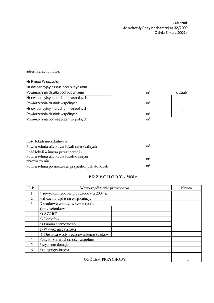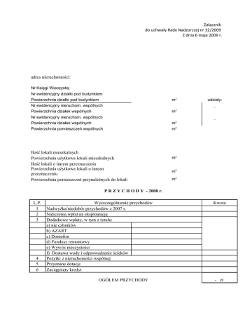 Załącznik do uchwały Rady Nadzorczej nr 32/2009 Z dnia 6 maja 2009 r. adres nieruchomości: Nr Księgi Wieczystej Nr ewidencyjny działki pod budynkiem Powierzchnia działki pod budynkiem m2 Nr ewidencyjny nieruchom. wspólnych Powierzchnia działek wspólnych Nr ewidencyjny nieruchom. wspólnych Powierzchnia działek wspólnych udziały: m2 m2 m2 Powierzchnia pomieszczeń wspólnych Ilość lokali mieszkalnych Powierzchnia użytkowa lokali mieszkalnych Ilość lokali o innym przeznaczeniu Powierzchnia użytkowa lokali o innym przeznaczeniu Powierzchnia pomieszczeń przynależnych do lokali m2 m2 m2 P R Z Y C H O D Y - 2008 r. L.P. 1 2 3 4 5 6 Wyszczególnienie przychodów Nadwyżka/niedobór przychodów z 2007 r. Naliczenia wpłat na eksploatację Dodatkowe wpłaty, w tym z tytułu: a) nie członków b) AZART c) Domofon d) Fundusz remontowy e) Wywóz nieczystości f) Dostawa wody i odprowadzenie ścieków Pożytki z nieruchomości wspólnej Przyznane dotacje Zaciągnięty kredyt OGÓŁEM PRZYCHODY Kwota - zł W Y D A T K I - 2008 r. L.P. 1. 2. 3. 4. 5. 6. 7. 8. 9. 10. 11. 12. 13. 14. 15. 16. 17. 18. 19. 20. 21. 22. 23. 24. 25. 26. 27. 28. 29. 30. 31. 32. 33. 34. 35. 36. 37. 38. 39. 40. 41. 42. 43. 44. 45. Konto Wyszczególnienie 501-1 -*****- 401 AMORTYZACJA 101 Amortyzacja podatkowa ZUŻYCIE MATERIAŁÓW 501-1 -*****- 411 101 102 105 106 109 110 501-1 -*****- 419 Materiały eksploatacyjne bezpośrednio z zakupu Materiały eksploatacyjne podstawowe pobrane z magazynu Materiały biurowe, prasa Podzespoły komputerowe Pozostałe materiały Wodomierze ZUŻYCIE ENERGII 901 905 906 909 911 501-1 -*****- 420 Energia Elektryczna Gaz - opłata stała Gaz - opłata zmienna Zimna Woda Zimna Woda do podgrzania USŁUGI OBCE KONSERWACJE I NAPRAWY 42001 42002 42003 42004 42005 42008 42032, 42035 42033 42036 42037 42055 42062 42031 42024 Konserwacje zlecone Konserwacja i drobne naprawy budowlane konserwacja sieci c.o. konserwacja sieci gazowej Konserwacja sieci wodno-kanalizacyjnej Konserwacja - drożność kanalizacji - usługa sprzętem Konserwacja instalacji domofonowej Konserwacja instalacji AZART Konserwacja instalacji elektrycznej Konserwacja oświetlenia zewnętrznego Konserwacja sprzętu przeciwpożarowego Konserwacja instalacji co i ccw Pozostałe usługi remontowe Dorabianie kluczy PRZEGLĄDY 42014 42015 42016 42017 42061 42010 42012 42054 42034,42067 Przeglądy gazowe Przeglądy elektryczne Przeglądy techniczne Opłaty dozoru technicznego Przeglądy kominiarskie WYWÓZ NIECZYSTOSCI STAŁYCH UTRZYMANIE CZYSTOŚCI , SPRZĄTANIE KONSERWACJA ZIELENI, WYCINKA DRZEW KONSERWACJA, WYMIANA, ODCZYTY WODOMIERZY POZOSTAŁE USŁUGI OBCE 420025 Pozostałe usługi obce 42060, 54000 Koszty wdrożenia ustawy 42069 Koszty podziału spółdzielni Kwota 46. 47. 48. 49. 50. 51. 52. 53. 54. 55. 56. 57. 58. 59. 60. 61. 62. 63. 64. 65. 66. 67. 68. 69. 70. 71. 42070 Wynik 2007 - nadwyżka kosztów nad przychodami 42018 Usługi pocztowo-telekomunikacyjne 501-1 -*****- 431 WYNAGRODZENIA 43101 Wynagrodzenia 501-1 -*****- 440 ŚWIADCZENIA NA RZECZ PRACOWNIKÓW 44001 44003 44004 44006 501-1 -*****- 450 Składki ZUS Odpis na ZFŚS Szkolenia Świadczenia na rzecz pracowników PPE ODPIS NA FUNDUSZ REMONTOWY 45001 Fundusz remontowy - lokale mieszkalne 45002 Fundusz remontowy - OW - lokale mieszkalne 501-1 -*****- 460 PODATKI I OPŁATY 46002 46003 46008 59900 501-1 -*****- 469 Podatek od nieruchomości Opłata za wieczyste użytkowanie Pozostałe opłaty Nieodliczony VAT - koszty magazynu POZOSTAŁE KOSZTY 46905 51870 51880 52200 52300 52400 52500 55500 Ubezpieczenia majątkowe Utrzymanie nieruchomości wspólnych - działek Utrzymanie mienia JSM Koszty wydziałowe Koszty obsługi konserwatorów Koszty transportu Koszty walnego zgromadzenia Koszty Zarządu (wynagrodzenie za zarząd nieruchomości) RAZEM KOSZTY Wynik GZM Nadwyżka przychodów nad kosztami - zł Nadwyżka kosztów nad przychodami - zł Sekretarz Rady Nadzorczej JSM Bogusława Wójcik Przewodniczący Rady Nadzorczej JSM Szymon Żarnowski - zł