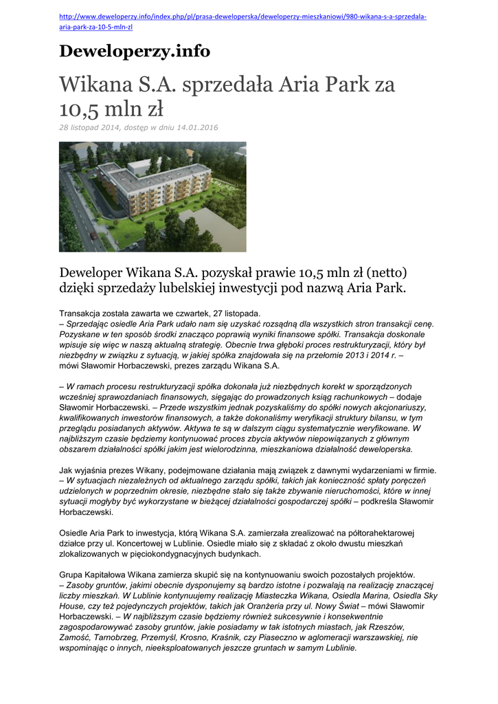 http://www.deweloperzy.info/index.php/pl/prasa-deweloperska/deweloperzy-mieszkaniowi/980-wikana-s-a-sprzedalaaria-park-za-10-5-mln-zl Deweloperzy.info Wikana S.A. sprzedała Aria Park za 10,5 mln zł 28 listopad 2014, dostęp w dniu 14.01.2016 Deweloper Wikana S.A. pozyskał prawie 10,5 mln zł (netto) dzięki sprzedaży lubelskiej inwestycji pod nazwą Aria Park. Transakcja została zawarta we czwartek, 27 listopada. – Sprzedając osiedle Aria Park udało nam się uzyskać rozsądną dla wszystkich stron transakcji cenę. Pozyskane w ten sposób środki znacząco poprawią wyniki finansowe spółki. Transakcja doskonale wpisuje się więc w naszą aktualną strategię. Obecnie trwa głęboki proces restrukturyzacji, który był niezbędny w związku z sytuacją, w jakiej spółka znajdowała się na przełomie 2013 i 2014 r. – mówi Sławomir Horbaczewski, prezes zarządu Wikana S.A. – W ramach procesu restrukturyzacji spółka dokonała już niezbędnych korekt w sporządzonych wcześniej sprawozdaniach finansowych, sięgając do prowadzonych ksiąg rachunkowych – dodaje Sławomir Horbaczewski. – Przede wszystkim jednak pozyskaliśmy do spółki nowych akcjonariuszy, kwalifikowanych inwestorów finansowych, a także dokonaliśmy weryfikacji struktury bilansu, w tym przeglądu posiadanych aktywów. Aktywa te są w dalszym ciągu systematycznie weryfikowane. W najbliższym czasie będziemy kontynuować proces zbycia aktywów niepowiązanych z głównym obszarem działalności spółki jakim jest wielorodzinna, mieszkaniowa działalność deweloperska. Jak wyjaśnia prezes Wikany, podejmowane działania mają związek z dawnymi wydarzeniami w firmie. – W sytuacjach niezależnych od aktualnego zarządu spółki, takich jak konieczność spłaty poręczeń udzielonych w poprzednim okresie, niezbędne stało się także zbywanie nieruchomości, które w innej sytuacji mogłyby być wykorzystane w bieżącej działalności gospodarczej spółki – podkreśla Sławomir Horbaczewski. Osiedle Aria Park to inwestycja, którą Wikana S.A. zamierzała zrealizować na półtorahektarowej działce przy ul. Koncertowej w Lublinie. Osiedle miało się z składać z około dwustu mieszkań zlokalizowanych w pięciokondygnacyjnych budynkach. Grupa Kapitałowa Wikana zamierza skupić się na kontynuowaniu swoich pozostałych projektów. – Zasoby gruntów, jakimi obecnie dysponujemy są bardzo istotne i pozwalają na realizację znaczącej liczby mieszkań. W Lublinie kontynuujemy realizację Miasteczka Wikana, Osiedla Marina, Osiedla Sky House, czy też pojedynczych projektów, takich jak Oranżeria przy ul. Nowy Świat – mówi Sławomir Horbaczewski. – W najbliższym czasie będziemy również sukcesywnie i konsekwentnie zagospodarowywać zasoby gruntów, jakie posiadamy w tak istotnych miastach, jak Rzeszów, Zamość, Tarnobrzeg, Przemyśl, Krosno, Kraśnik, czy Piaseczno w aglomeracji warszawskiej, nie wspominając o innych, nieeksploatowanych jeszcze gruntach w samym Lublinie.