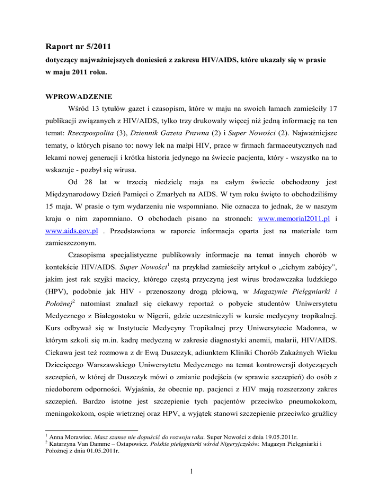 Raport nr 5/2011 dotyczący najważniejszych doniesień z zakresu HIV/AIDS, które ukazały się w prasie w maju 2011 roku. WPROWADZENIE Wśród 13 tytułów gazet i czasopism, które w maju na swoich łamach zamieściły 17 publikacji związanych z HIV/AIDS, tylko trzy drukowały więcej niż jedną informację na ten temat: Rzeczpospolita (3), Dziennik Gazeta Prawna (2) i Super Nowości (2). Najważniejsze tematy, o których pisano to: nowy lek na małpi HIV, prace w firmach farmaceutycznych nad lekami nowej generacji i krótka historia jedynego na świecie pacjenta, który - wszystko na to wskazuje - pozbył się wirusa. Od 28 lat w trzecią niedzielę maja na całym świecie obchodzony jest Międzynarodowy Dzień Pamięci o Zmarłych na AIDS. W tym roku święto to obchodziliśmy 15 maja. W prasie o tym wydarzeniu nie wspomniano. Nie oznacza to jednak, że w naszym kraju o nim zapomniano. O obchodach pisano na stronach: www.memorial2011.pl i www.aids.gov.pl . Przedstawiona w raporcie informacja oparta jest na materiale tam zamieszczonym. Czasopisma specjalistyczne publikowały informacje na temat innych chorób w kontekście HIV/AIDS. Super Nowości1 na przykład zamieściły artykuł o „cichym zabójcy”, jakim jest rak szyjki macicy, którego częstą przyczyną jest wirus brodawczaka ludzkiego (HPV), podobnie jak HIV - przenoszony drogą płciową, w Magazynie Pielęgniarki i Położnej2 natomiast znalazł się ciekawy reportaż o pobycie studentów Uniwersytetu Medycznego z Białegostoku w Nigerii, gdzie uczestniczyli w kursie medycyny tropikalnej. Kurs odbywał się w Instytucie Medycyny Tropikalnej przy Uniwersytecie Madonna, w którym szkoli się m.in. kadrę medyczną w zakresie diagnostyki anemii, malarii, HIV/AIDS. Ciekawa jest też rozmowa z dr Ewą Duszczyk, adiunktem Kliniki Chorób Zakaźnych Wieku Dziecięcego Warszawskiego Uniwersytetu Medycznego na temat kontrowersji dotyczących szczepień, w której dr Duszczyk mówi o zmianie podejścia (w sprawie szczepień) do osób z niedoborem odporności. Wyjaśnia, że obecnie np. pacjenci z HIV mają rozszerzony zakres szczepień. Bardzo istotne jest szczepienie tych pacjentów przeciwko pneumokokom, meningokokom, ospie wietrznej oraz HPV, a wyjątek stanowi szczepienie przeciwko gruźlicy 1 Anna Morawiec. Masz szanse nie dopuścić do rozwoju raka. Super Nowości z dnia 19.05.2011r. Katarzyna Van Damme – Ostapowicz. Polskie pielęgniarki wśród Nigeryjczyków. Magazyn Pielęgniarki i Położnej z dnia 01.05.2011r. 2 1 – dzieci matek zakażonych HIV szczepione są dopiero po wykluczeniu wertykalnej transmisji zakażenia oraz po wykonaniu próby tuberkulinowej. 3 EPIDEMIOLOGIA Zachodniopomorskie – coraz więcej zakażonych Przez ostatnich pięć miesięcy w województwie zachodniopomorskim wykryto trzy razy więcej zakażeń HIV niż zazwyczaj. Większość zakażonych osób o chorobie dowiedziało się przypadkiem. Małgorzata Kłys–Rachwalska, kierownik Regionalnej Poradni Nabytych Niedoborów Immunologicznych w Szczecinie mówi, że przez sześć lat działania anonimowego punktu testowania nigdy nie zdarzyło się, aby ujawniono aż 11 zakażeń w ciągu kilku miesięcy, rocznie bywały zaledwie trzy. Wśród tych u których wykryto ostatnio HIV są osoby od 19 do 60 roku życia. O swoim zakażeniu dowiedziały się, kiedy wykonywały badania profilaktyczne. Przez wielu wiadomość o dodatnim wyniku testu zostaje przyjmowana jako osobista tragedia, dlatego wolontariusze i pracownicy poradni starają się wyjaśnić, że z HIV można żyć i kierują taką osobę do właściwych specjalistów. Głównym problemem w naszym kraju jest brak profilaktyki HIV/AIDS ze względu na brak środków finansowych- mówi przewodnicząca Stowarzyszenia Wolontariuszy „DADU”.. Mimo to stowarzyszenie prowadzi działania we własnym zakresie. Korzysta z pomocy Urzędu Wojewódzkiego, Urzędu Marszałkowskiego, Urzędu Miasta. Wolontariusze działając na polu profilaktyki HIV/AIDS, wchodzą do agencji towarzyskich, klubów gejowskich, organizują akcje, spotykają się z młodzieżą. Przy stowarzyszeniu działa też Telefon Zaufania, pod który można dzwonić z każdą sprawą związaną z HIV/AIDS.4 ASPEKTY MEDYCZNE Genetycy opracowali lek na małpi HIV „Nature” donosi, że genetycy z Instytutu Szczepień i Terapii Genowej Oregon Health & Science University opracowali szczepionkę likwidującą odpowiednik małpiego wirusa HIV (SIV). 3 4 Marcin Wełnicki. Kontrowersje wokół szczepień. Służba Zdrowia z dnia 16.05.201 r. Anna Folkman. Kochajmy się bezpiecznie. Głos Szczeciński z dnia 10.05.2011 r. 2 Badania pod kierownictwem dr Louisa Pickera opierały się na wykorzystaniu cytomegalowirusów (CMV) do „nauczenia” organizmu charakterystyki małpiego HIV – czyli SIV. Po zaszczepieniu laboratoryjnych rezusów ponad połowa z nich wyzdrowiała. Efekt ten utrzymał się po upływie roku od wszczepienia im zmodyfikowanych cytomegalowirusów. W grupie kontrolnej u wszystkich zakażonych małp rozwinął się odpowiednik AIDS. Następnym krokiem w badaniach będą testy z udziałem ludzi. Na pytanie, skąd wziął się pomysł na wykorzystanie cytomegalowirusów, kierownik badań odpowiada, że obecnie stosowane terapie antyretrowirusowe umożliwiają zahamowanie postępów choroby, jednak wirusy potrafią ukryć się w ciele człowieka i po przerwaniu terapii atakują ponownie. Tymczasem CMV po infekcji pozostają w organizmie człowieka przez całe życie.5 Czy to możliwe, aby całkowicie pozbyć się HIV? W 2008r. cały świat obiegła wiadomość, że Amerykanin Timothy Ray Brown, pacjent od lat żyjący z HIV, pozbył się wirusa. Do tej pory na ten temat wypowiedziało się wielu ekspertów w tej dziedzinie, większość do sprawy podeszła sceptycznie. Po trzech latach, jakie upłynęły, gdy praca na ten temat ukazała się w literaturze fachowej, wszystko wskazuje na to, że rzeczywiście Timothy Brown j