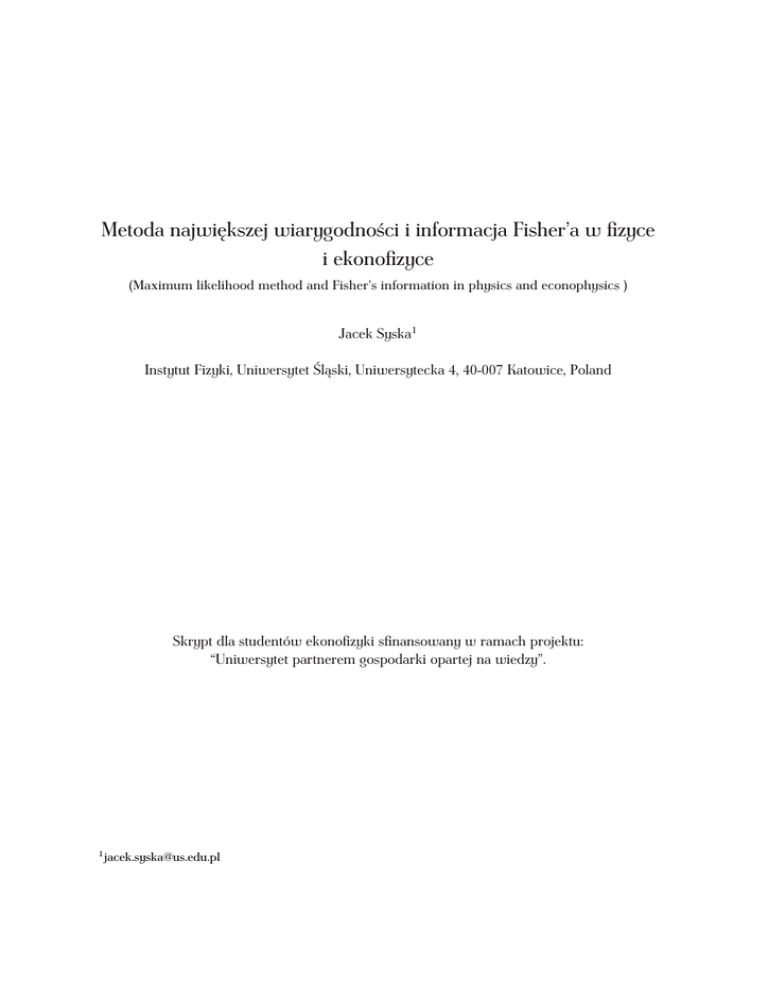 Metoda największej wiarygodności i informacja Fisher’a w fizyce i ekonofizyce (Maximum likelihood method and Fisher’s information in physics and econophysics ) Jacek Syska1 Instytut Fizyki, Uniwersytet Śląski, Uniwersytecka 4, 40-007 Katowice, Poland Skrypt dla studentów ekonofizyki sfinansowany w ramach projektu: “Uniwersytet partnerem gospodarki opartej na wiedzy”. 1 [email protected] Spis treści Abstract 4 Wstęp 5 1 Metoda największej wiarygodności 1.1 Podstawowe pojęcia MNW . . . . . . . . . . . . . . . . . . . . . . . . . . . 1.2 Wnioskowanie w MNW . . . . . . . . . . . . . . . . . . . . . . . . . . . . . 1.2.1 Wiarygodnościowy przedział ufności . . . . . . . . . . . . . . . . . . 1.2.2 Rozkłady regularne . . . . . . . . . . . . . . . . . . . . . . . . . . . . 1.2.3 Weryfikacja hipotez z wykorzystaniem ilorazu wiarygodności . . . 1.3 MNW w analizie regresji . . . . . . . . . . . . . . . . . . . . . . . . . . . . . 1.3.1 Dewiancja jako miara dobroci dopasowania. Rozkład Poissona. . . 1.3.2 Analiza regresji Poissona. . . . . . . . . . . . . . . . . . . . . . . . . . 1.3.2.1 Test statystyczny dla doboru modelu w regresji Poissona . 1.3.2.2 Podobieństwo dewiancji do SKR analizy częstotliwościowej 1.4 Zasada niezmienniczości ilorazu funkcji wiarygodności . . . . . . . . . . . . . . . . . . . . . . . . . . . . . . . . . . . . . . . . . . . . . . . . . . . . . . . 2 Entropia względna i informacja Fishera 2.1 Obserwowana i oczekiwana informacja Fishera . . . . . . . . . . . . . . . . . . . 2.1.1 Wartość oczekiwana i wariancja funkcji wynikowej . . . . . . . . . . . . . 2.2 Wstęp do geometrii różniczkowej na przestrzeni statystycznej i α-koneksja . . . 2.2.1 Przestrzeń statystyczna dualnie płaska . . . . . . . . . . . . . . . . . . . . . 2.2.2 Dualne układy współrzędnych . . . . . . . . . . . . . . . . . . . . . . . . . 2.2.2.1 Transformacja Legendre’a pomiędzy parametryzacjami dualnymi 2.2.3 Geometryczne sformułowanie teorii estymacji dla EFI . . . . . . . . . . . . 2.2.4 Uwaga o rozwinięciu rozkładu w szereg Taylora . . . . . . . . . . . . . . . 2.3 Twierdzenie Rao-Cramera i DORC . . . . . . . . . . . . . . . . . . . . . . . . . . . 2.3.1 Skalarne Twierdzenie Rao-Cramera . . . . . . . . . . . . . . . . . . . . . . 2.3.1.1 Dowód TRC (wersja dowodu dla przypadku skalarnego) . . . . . . 2.3.1.2 Przykład skalarny DORC dla rozkładu normalnego . . . . . . . . . 2.3.2 Wieloparametrowe Twierdzenie Rao-Cramera . . . . . . . . . . . . . . . . 2.3.2.1 Pierwsza wersja wieloparametrowego TRC . . . . . . . . . . . . . 2.3.2.2 Przykład wektorowego DORC . . . . . . . . . . . . . . . . . . . . . 2.3.2.3 Druga wersja wieloparametrowego TRC . . . . . . . . . . . . . . . 2.4 Entropia informacyjna Shannona i entropia względna . . . . . . . . . . . . . . . . 2.4.1 Interpretacja entropii Shannona . . . . . . . . . . . . . . . . . . . . . . . . . 1 . . . . . . . . . . . . . . . . . . . . . . . . . . . . . . . . . . . . . . . . . . . . . . . . . . . . . . . . . . . . . . . . . . . . . . . . . . . . . . . . . . . . . . . . . . . . . . . . . . . . . . . . . . . . . . . . . . . . . . . . . . . . . . . 9 9 13 13 16 16 18 20 22 24 26 28 . . . . . . . . . . . . . . . . . . 29 29 33 35 42 44 46 49 49 52 52 53 53 54 55 55 57 58 59 2.5 2.6 2.7 2.8 2.4.2 Przypadek ciągłego rozkładu prawdopodobieństwa . . . . . . . . . . . . 2.4.3 Entropia względna jako miara odległości . . . . . . . . . . . . . . . . . . Geometria przestrzeni rozkładów prawdopodobieństwa i metryka Rao-Fishera Informacja Fishera . . . . . . . . . . . . . . . . . . . . . . . . . . . . . . . . . . . 2.6.1 Informacja Fishera jako entropia . . . . . . . . . . . . . . . . . . . . . . . Pojęcie kanału informacyjnego . . . . . . . . . . . . . . . . . . . . . . . . . . . . 2.7.1 Pojemność informacyjna dla zmiennej losowej położenia . . . . . . . . . Pomiar układu w podejściu Friedena-Soffera . . . . . . . . . . . . . . . . . . . . 2.8.1 Przykład: Estymacja w fizycznych modelach eksponentialnych . . . . . . . . . . . . . . . . . . . . . . . . 3 Zasady informacyjne 3.1 Estymacja w statystyce klasycznej a estymacja fizyczna. Postawienie problemu . . 3.1.1 Strukturalna zasada informacyjna. Metoda EFI . . . . . . . . . . . . . . . . . 3.1.1.1 Całka rozwinięcia Taylora . . . . . . . . . . . . . . . . . . . . . . . . 3.1.1.2 I oraz Q dla parami niezależnych zmiennych położeniowych próby 3.2 Przepływ informacji . . . . . . . . . . . . . . . . . . . . . . . . . . . . . . . . . . . . 3.3 Kinematyczna postać informacji Fishera . . . . . . . . . . . . . . . . . . . . . . . . . 3.3.1 Postać kinematyczna pojemności zapisana w prawdopodobieństwie . . . . . 3.4 Równania master . . . . . . . . . . . . . . . . . . . . . . . . . . . . . . . . . . . . . . 3.5 Podsumowanie rozważań . . . . . . . . . . . . . . . . . . . . . . . . . . . . . . . . . . . . . . . . . . . . . . . . . . . . . . . . . . . . . . . . . . . . . . . . . . . . . . . . . . . . . . . . . . . . . . . . 59 61 63 67 67 71 72 77 79 . . . . . . . . . 84 84 85 87 88 89 93 97 97 98 4 Kryteria informacyjne w teorii pola 4.1 Informacja Fishera i klasyfikacja modeli . . . . . . . . . . . . . . . . . . . . . . . . . . . . 4.1.1 Podział modeli ze względu na N oraz kategorie I . . . . . . . . . . . . . . . . . . . 4.1.1.1 Dowód podziału na dwie kategorie I . . . . . . . . . . . . . . . . . . . . . 4.1.2 Podział modeli ze skończonym I na podklasy z różnym N . . . . . . . . . . . . . 4.1.3 Konkluzje i konsekwencje podziału modeli na kategorie I . . . . . . . . . . . . . . 4.2 Równania różniczkowe metody EFI . . . . . . . . . . . . . . . . . . . . . . . . . . . . . . 4.2.1 Ogólna postać funkcji gęstości TFI oraz obserwowane zasady informacyjne . . . 4.2.1.1 Postać obserwowana zasad informacyjnych . . . . . . . . . . . . . . . . . 4.3 TFI oraz specyficzne formy Q w teorii pola . . . . . . . . . . . . . . . . . . . . . . . . . . 4.3.1