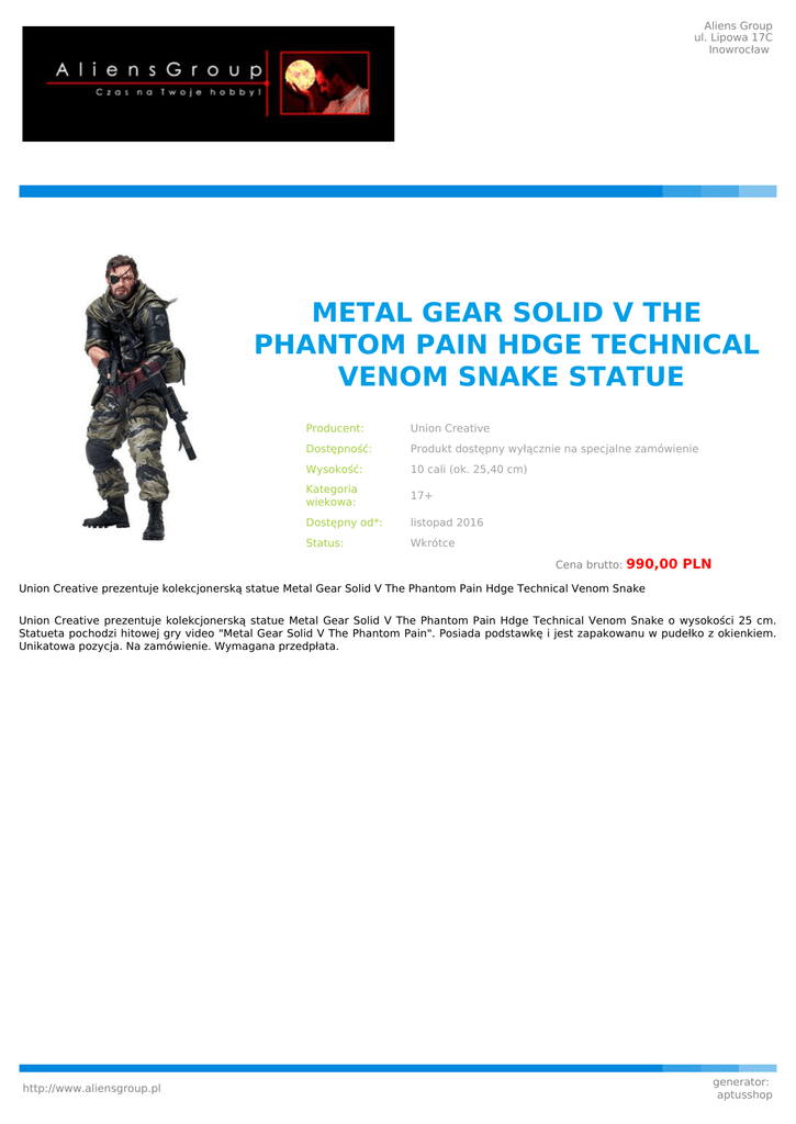 Aliens Group ul. Lipowa 17C Inowrocław METAL GEAR SOLID V THE PHANTOM PAIN HDGE TECHNICAL VENOM SNAKE STATUE Producent: Union Creative Dostępność: Produkt dostępny wyłącznie na specjalne zamówienie Wysokość: 10 cali (ok. 25,40 cm) Kategoria wiekowa: 17+ Dostępny od*: listopad 2016 Status: Wkrótce Cena brutto: 990,00 PLN Union Creative prezentuje kolekcjonerską statue Metal Gear Solid V The Phantom Pain Hdge Technical Venom Snake Union Creative prezentuje kolekcjonerską statue Metal Gear Solid V The Phantom Pain Hdge Technical Venom Snake o wysokości 25 cm. Statueta pochodzi hitowej gry video "Metal Gear Solid V The Phantom Pain". Posiada podstawkę i jest zapakowanu w pudełko z okienkiem. Unikatowa pozycja. Na zamówienie. Wymagana przedpłata. http://www.aliensgroup.pl generator: aptusshop