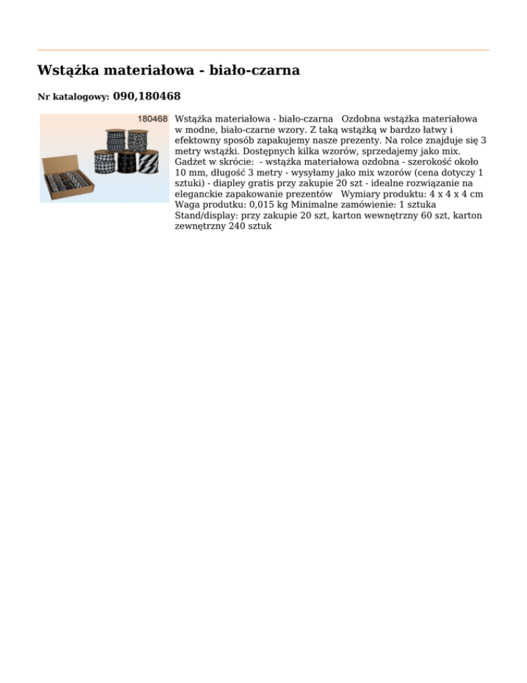 Wstążka materiałowa - biało-czarna Nr katalogowy: 090,180468 Wstążka materiałowa - biało-czarna Ozdobna wstążka materiałowa w modne, biało-czarne wzory. Z taką wstążką w bardzo łatwy i efektowny sposób zapakujemy nasze prezenty. Na rolce znajduje się 3 metry wstążki. Dostępnych kilka wzorów, sprzedajemy jako mix. Gadżet w skrócie: - wstążka materiałowa ozdobna - szerokość około 10 mm, długość 3 metry - wysyłamy jako mix wzorów (cena dotyczy 1 sztuki) - diapley gratis przy zakupie 20 szt - idealne rozwiązanie na eleganckie zapakowanie prezentów Wymiary produktu: 4 x 4 x 4 cm Waga produtku: 0,015 kg Minimalne zamówienie: 1 sztuka Stand/display: przy zakupie 20 szt, karton wewnętrzny 60 szt, karton zewnętrzny 240 sztuk