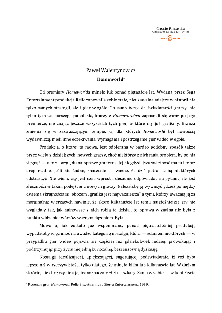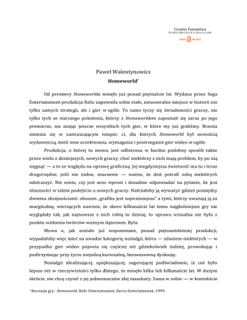 Creatio Fantastica PL ISSN: 2300-2514 R. X, 2014, nr 4 (46) Paweł Walentynowicz Homeworld* Od premiery Homeworlda minęło już ponad piętnaście lat. Wydana przez Sega Entertainment produkcja Relic zapewniła sobie stałe, nieusuwalne miejsce w historii nie tylko samych strategii, ale i gier w ogóle. To samo tyczy się świadomości graczy, nie tylko tych ze starszego pokolenia, którzy z Homeworldem zapoznali się zaraz po jego premierze, nie znając jeszcze wszystkich tych gier, w które my już graliśmy. Branża zmienia się w zastraszającym tempie: ci, dla których Homeworld był nowością wydawniczą, mieli inne oczekiwania, wymagania i postrzeganie gier wideo w ogóle. Produkcja, o której tu mowa, jest odbierana w bardzo podobny sposób także przez wielu z dzisiejszych, nowych graczy, choć niektórzy z nich mają problem, by po nią sięgnąć — a to ze względu na oprawę graficzną. Jej niegdysiejsza świetność ma tu i teraz drugorzędne, jeśli nie żadne, znaczenie — ważne, że dziś potrafi sobą niektórych odstraszyć. Nie wiem, czy jest sens wprost i dosadnie odpowiadać na pytanie, ile jest słuszności w takim podejściu u nowych graczy. Należałoby ją wyważyć gdzieś pomiędzy dwiema skrajnościami: obozem „grafika jest najważniejsza” a tymi, którzy uważają ją za marginalną; wierzących nawinie, że skoro kilkanaście lat temu najgłośniejsze gry nie wyglądały tak, jak najnowsze z nich robią to dzisiaj, to oprawa wizualna nie była z punktu widzenia twórców ważnym dążeniem. Była. Mowa o, jak zostało już wspomniane, ponad piętnastoletniej produkcji, wypadałoby więc mieć na uwadze kategorię nostalgii, która — zdaniem niektórych — w przypadku gier wideo pojawia się częściej niż gdziekolwiek indziej, prowokując i podtrzymując przy życiu niejedną kuriozalną, bezsensowną dyskusję. Nostalgii idealizującej, upiększającej, sugerującej podświadomie, iż coś było lepsze niż w rzeczywistości tylko dlatego, że minęło kilka lub kilkanaście lat. W dużym skrócie, nie chcę czynić z jej jednoznacznie złej maszkary. Sama w sobie — w kontekście * Recenzja gry: Homeworld, Relic Entertainment, Sierra Entertainment, 1999. gier, rzecz jasna — zasługuje na osobny tekst. W tej chwili wspomnienie jej ma służyć jednej konkretnej rzeczy: zaznaczeniu, iż Homeworld i kolejne pozycje z Retrogralni będą podkreślały wartość danych tytułów z perspektywy dnia obecnego. Tu i teraz. Kosmiczna strategia od Relic Entertainment wyróżnia się — jest to bardzo cenna rzecz w grach w ogóle, a w przypadku strategii, już zupełna rzadkość — zdolnością do wywoływania prawdziwych odczuć estetycznych. Opowiedziana przez Homeworlda historia angażuje i ciekawi. Przedstawiony w nim świat, mimo swej skali, budzi emocje charakterystyczne dla zupełnie innego rodzaju opowieści: takich, gdzie liczą się pojedyncze osobowości i ich wzajemne relacje, a większe zbiorowości i grupy społeczne, których widzimy zwykle jedynie niewielki fragment — są reprezentowane właśnie za pośrednictwem wspomnianych indywiduów. Tutaj głównym reprezentantem poszczególnych grup są właśnie statki: ogromne, zamieszkiwane przez setki tysięcy przedstawicieli danej społeczności obiekty, będące nieraz domem i schronieniem dla ostatnich z nich, co w znacznym stopniu wpływa na obecny w całej grze ładunek emocjonalny. Opowiadana tu historia ma wielką, niemal statystyczną skalę — niełatwo jest grać na emocjach, mając do dyspozycji wielkie liczby składające się z anonimowych mas, z którymi nie ma się bezpośredniej styczności (w tym wymiarze nawet nieliczne indywidualności są tutaj prawie że nieobecne). W Homeworldzie udało się to osiągnąć. Skala wszystkich wydarzeń, których jest się świadkiem, sprawia że nasze aangażowanie rośnie: ma się wrażenie odczuwania emocji każdej z osób, o których jest w danej chwili mowa; współodczuwa się strach, lęk, ból i szczęście tych niezliczonych, wielkich populacji — tak, a nawet bardziej intensywnie, jak gdyby miano do czynienia z garstką rozwijanych skrupulatnie i przez bardzo długi czas bohaterów. W relacji gracza z wymyślonym tutaj światem odczucia są inne niż przy obcowaniu z klasycznymi bohaterami pierwszoplanowymi — są za to motywy, cele i dążenia żyjących obok siebie wielkich zbiorowości. W warstwie mechaniki Homeworld oferuje przede wszystkim prawdziwie trójwymiarowe środowisko. Wszystkie jednostki i obiekty obecne w przestrzeni kosmicznej — środowisku gry — mogą poruszać się w trzech płaszczyznach, co w porównaniu do większości strategii czasu rzeczywistego, daje ogrom możliwości w planowaniu, dysponowaniu siłami itp. W skrócie — opcji planowania swoich poczynań jest tu mnóstwo, fakt trójwymiarowości wszystkich plansz oferuje zupełnie inny rodzaj rozgrywki. Za pierwszy, bardziej oczywisty przykład, może posłużyć tu kwestia detekcji i wykrywania wrogich jednostek: w przestrzeniach dwuwymiarowych, gdzie jednostki poruszają się tylko w poziomie (ewentualnie pokonują drobne elewacje i przeszkody terenowe), zwiad także ogranicza się do działań o kierunkach horyzontalnych. Naświetla i odkrywa się — czy to za pomocą samych jednostek czy osobnych urządzeń takich jak skaner w Starcrafcie II — tereny płaskie. W Homewordzie skanowanie i dokonywanie zwiadu są jak próby wypełnienia wielkiej kuli — reprezentującej tu środowisko gry — przy pomocy dość ograniczonych środków. Odkrywanie płaszczyzny już tu nie wystarczy, trzeba wypełniać przestrzeń. Podstawowym urządzeniem skanującym jest sonda, zasięg detekcji, której reprezentowany jest sferą. Każda sonda może poruszyć się tylko raz: po dotarciu na wyznaczone jej miejsce, traci ona swoją mobilność. Zabezpieczanie obszarów odbywa się więc poprzez w miarę równomierne krycie trójwymiarowego obszaru; aby by