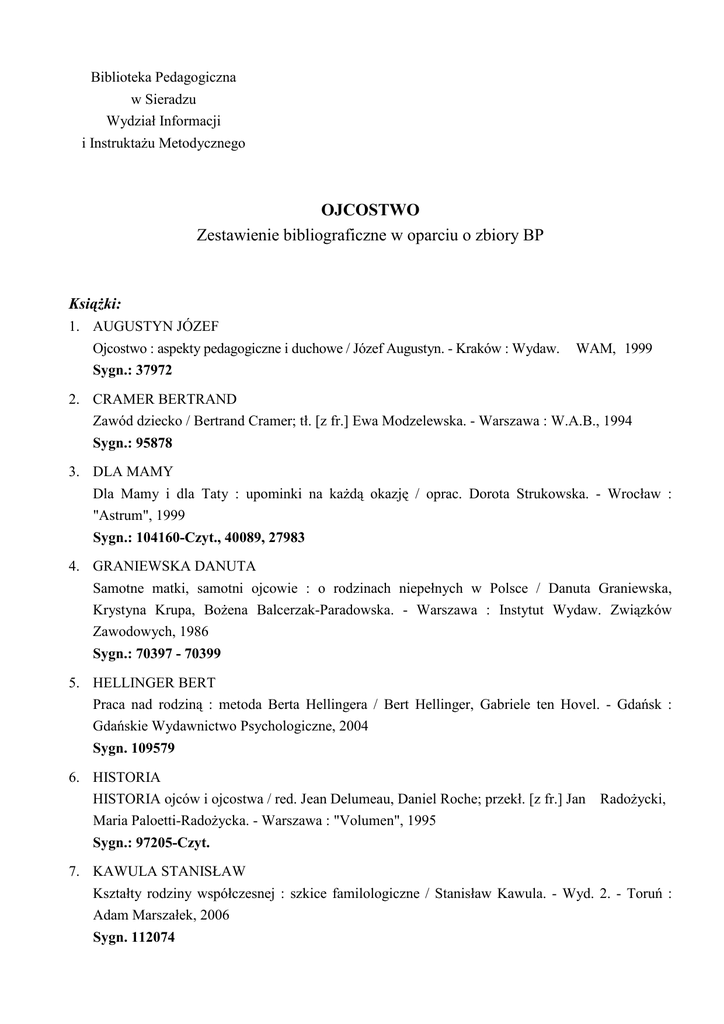 Biblioteka Pedagogiczna w Sieradzu Wydział Informacji i InstruktaŜu Metodycznego OJCOSTWO Zestawienie bibliograficzne w oparciu o zbiory BP KsiąŜki: 1. AUGUSTYN JÓZEF Ojcostwo : aspekty pedagogiczne i duchowe / Józef Augustyn. - Kraków : Wydaw. WAM, 1999 Sygn.: 37972 2. CRAMER BERTRAND Zawód dziecko / Bertrand Cramer; tł. [z fr.] Ewa Modzelewska. - Warszawa : W.A.B., 1994 Sygn.: 95878 3. DLA MAMY Dla Mamy i dla Taty : upominki na kaŜdą okazję / oprac. Dorota Strukowska. - Wrocław : "Astrum", 1999 Sygn.: 104160-Czyt., 40089, 27983 4. GRANIEWSKA DANUTA Samotne matki, samotni ojcowie : o rodzinach niepełnych w Polsce / Danuta Graniewska, Krystyna Krupa, BoŜena Balcerzak-Paradowska. - Warszawa : Instytut Wydaw. Związków Zawodowych, 1986 Sygn.: 70397 - 70399 5. HELLINGER BERT Praca nad rodziną : metoda Berta Hellingera / Bert Hellinger, Gabriele ten Hovel. - Gdańsk : Gdańskie Wydawnictwo Psychologiczne, 2004 Sygn. 109579 6. HISTORIA HISTORIA ojców i ojcostwa / red. Jean Delumeau, Daniel Roche; przekł. [z fr.] Jan RadoŜycki, Maria Paloetti-RadoŜycka. - Warszawa : "Volumen", 1995 Sygn.: 97205-Czyt. 7. KAWULA STANISŁAW Kształty rodziny współczesnej : szkice familologiczne / Stanisław Kawula. - Wyd. 2. - Toruń : Adam Marszałek, 2006 Sygn. 112074 8. KAWULA STANISŁAW Pedagogiki rodziny / Stanisław Kawula, Józefa Brągiel, Andrzej Janke. - Toruń : „Akapit”, 1999 Sygn. 107054-Czyt. 9. LOTHAR SCHON Synowie i ojcowie : tęsknota za nieobecnym ojcem/ Schon Lothar. - Gdańsk, Gdańskie Wydawnictwo Psychologiczne, 2002 Sygn. 78256, 77037 10. MACDONALD GORDON WZOROWY ojciec / Gordon Macdonald; [przekł. z ang.]. - Kraków : Towarzystwo Krzewienia Etyki Chrześcijańskiej, 1991 Sygn.: 92367, 91293 11. MCDOWELL Josh Zadziwiający wpływ tatusia / Josh McDowell. - Warszawa : 'Vacatio”, 1993 Sygn. 93171-93172 12. MARCINKOWSKI TADEUSZ Badania serologiczne w dochodzeniu ojcostwa / Tadeusz Marcinkowski. - Warszawa : Wydaw. Prawnicze, 1973 Sygn.: 22937 13. MARGASIŃSKI ANDRZEJ Analiza psychologiczna systemów rodzinnych z chorobą alkoholową / Andrzej Margasiński. Częstochowa : Wydaw. WyŜszej Szkoły Pedagogicznej, 1996 Sygn.: 104336 14. MEYER-GLITZA ERIKA Wiadomość od taty : terapeutyczne opowiadania o utracie i rozstaniach / Erika Meyer-Glitza. - Kielce : Jedność, 2002 Sygn. 109527 15. OBLICZA Oblicza ojcostwa / red. Dorota Kornas-Biela. - Lublin : Tow. Naukowe KUL, cop. 2001 Sygn.: 109192 16. OJCIEC Ojciec... / red. nauk. Sławomir Jabłoński. - Poznań : Wydaw. Fundacji Humaniora, 2000 Sygn.: 109633 17. OJCU Ojcu / wybór wierszy i posł. Jan Nagrabiecki; przedm. Zbigniew Bieńkowski. - Warszawa : Ludowa Spółdzielnia Wydawnicza, cop. 1995 Sygn.: 104082 18. PIĄTKOWSKA EWA Mój ojciec / Ewa Piątkowska. - Warszawa : Krajowa Agencja Wydawnicza, 1981 Sygn.: 48140 - 48142 19. POSPISZYL KAZIMIERZ Miłości ojcowskiej / Kazimierz Pospiszyl. - [Wyd. 2]. - Warszawa : Instytut Wydawniczy Związków Zawodowych, 1986 Sygn.: 68255 - 68259 20. POSPISZYL KAZIMIERZ Ojciec a rozwój dziecka / Kazimierz Pospiszyl. - Warszawa : „Wiedza Powszechna”, 1980 Sygn. 39620- 39622 21. POSPISZYL KAZIMIERZ Ojciec a wychowanie dziecka / Kazimierz Pospiszyl. - Warszawa : „śak”, 2007 Sygn. 115365 22. RODZINA Rodzina w czasach szybkich przemian / red. nauk.Tadeusz Tyszka. - Poznań : Uniwersytet Adam Mickiewicza, 2002 Sygn. 278-UŁ-Czyt. 23. SATIR VIRGINIA Rodzina : tu powstaje człowiek / Virginia Satir. - Gdańsk : Gdańskie Wydawnictwo Psychologiczne, 2000 Sygn. 106509 24. SCHON LOTHAR Synowie i ojcowie : tęsknota za nieobecnym ojcem ? Lothar Schon. - Gdańsk : Gdańskie Wydawnictwo Psychologiczne, 2002 Sygn.109634 25. SMITH MICHAEL Między ojcem a synem : dzielenie się wiarą, umacnianie więzi i stawanie się męŜczyzną : przewodnik / Michael Smith; przeł. [z ang.] Beata Majczyna. - Kraków : Wydaw. WAM, 2002 Sygn.: 108546 26. STOJANOWSKA WANDA Ojcostwo prawne a ojcostwo biologiczne / Wanda Stojanowska. - Warszawa : Instytut Wydaw. Związków Zawodowych, 1985 Sygn.: 66063 – 66064 27. SZCZOTKOWSKA ZOFIA Antropologia w dochodzeniu ojcostwa / Zofia Szczotkowska; PAN, Zakład Antropologii. Warszawa : Państ. Wydaw. Naukowe, 1985 Sygn.: 63712 28. TERAPIA Terapia systemowa Berta Hellingera / red. Gunthard Weber. - Gdańsk : Gdańskie Wydawnictwo Psychologiczne, 2005 Sygn. 110966-Czyt. 29. WITCZAK JERZY Ojcostwo bez tajemnic / Jerzy Witczak. - Warszawa : IWZZ, 1987 Sygn. 78751-78752 30. WSPÓŁCZESNE Współczesne zagroŜenia w strukturach społecznych (szkice z pedagogiki społecznej) / pod red. Ewy Syrek. - Katowice: Wieczorek-Press, 1993 Sygn. 94486 Artykuły z czasopism (2000 -): 1. Baka Łukasz : Identyfikacja z ojcem a wzorce idealnego męŜczyzny w percepcji chłopców w wieku adolescencji // MałŜeństwo i Rodzina. - 2003, nr 1, s. 29 - 33 2. Baran Sławomir : O nową koncepcję ojcostwa [nowy wizerunek współczesnego męŜczyzny jako ojca - rola w rodzinie i wychowaniu dzieci // Problemy Opiekuńczo-Wychowawcze. - 2001, nr 9, s. 49 - 54 3. Bieńko Mariola : Tęsknota za ojcem // Problemy Opiekuńczo-Wychowawcze. - 2003, nr 10, s. 20-24 4. Ceranek-Dadas Anna, Neumann - Schmidtke ElŜbieta : Ojcostwo - kierunki przemiany roli // Pedagogika Społeczna. - 2004, nr 2/4, s. 37 - 50 5. Dąbrowska Zofia : Ojcostwo jako wartość : studium empiryczne [nowe wymiary wartości ojcostwa we współczesnej polskiej rodzinie] // MałŜeństwo i Rodzina. - 2003, nr 4, s. 3 - 13 6. Dąbrowska Zofia : RóŜne oblicza ojcostwa // MałŜeństwo i Rodzina. - 2004, nr 1, s. 13 - 19 7. Dudek Anna : Kompetencje rodzicielskie rozwiedzionych rodziców [na podstawie badań, których celem było zdiagnozowanie róŜnic w posiadanych kompetencjach rodzicielskich w zakresie wiedzy i umiejętności między ojcami i matkami po rozwodzie // Pedagogika Społeczna. - 2004, nr 2/ 4, s. 67 - 72 8. Dudek Anna : Poziom samoakceptacji ojców i matek w pełnieniu przez nich ról rodzicielskich po rozwodzie /