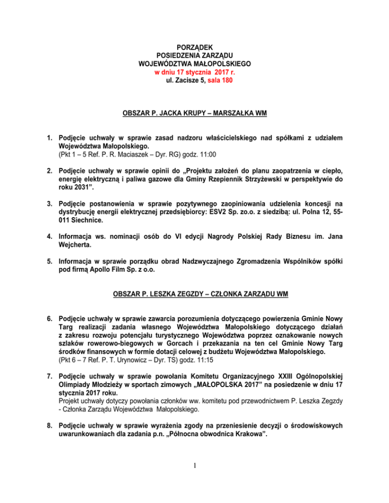 PORZĄDEK POSIEDZENIA ZARZĄDU WOJEWÓDZTWA MAŁOPOLSKIEGO w dniu 17 stycznia 2017 r. ul. Zacisze 5, sala 180 OBSZAR P. JACKA KRUPY – MARSZAŁKA WM 1. Podjęcie uchwały w sprawie zasad nadzoru właścicielskiego nad spółkami z udziałem Województwa Małopolskiego. (Pkt 1 – 5 Ref. P. R. Maciaszek – Dyr. RG) godz. 11:00 2. Podjęcie uchwały w sprawie opinii do „Projektu założeń do planu zaopatrzenia w ciepło, energię elektryczną i paliwa gazowe dla Gminy Rzepiennik Strzyżewski w perspektywie do roku 2031”. 3. Podjęcie postanowienia w sprawie pozytywnego zaopiniowania udzielenia koncesji na dystrybucję energii elektrycznej przedsiębiorcy: ESV2 Sp. zo.o. z siedzibą: ul. Polna 12, 55011 Siechnice. 4. Informacja ws. nominacji osób do VI edycji Nagrody Polskiej Rady Biznesu im. Jana Wejcherta. 5. Informacja w sprawie porządku obrad Nadzwyczajnego Zgromadzenia Wspólników spółki pod firmą Apollo Film Sp. z o.o. OBSZAR P. LESZKA ZEGZDY – CZŁONKA ZARZĄDU WM 6. Podjęcie uchwały w sprawie zawarcia porozumienia dotyczącego powierzenia Gminie Nowy Targ realizacji zadania własnego Województwa Małopolskiego dotyczącego działań z zakresu rozwoju potencjału turystycznego Województwa poprzez oznakowanie nowych szlaków rowerowo-biegowych w Gorcach i przekazania na ten cel Gminie Nowy Targ środków finansowych w formie dotacji celowej z budżetu Województwa Małopolskiego. (Pkt 6 – 7 Ref. P. T. Urynowicz – Dyr. TS) godz. 11:15 7. Podjęcie uchwały w sprawie powołania Komitetu Organizacyjnego XXIII Ogólnopolskiej Olimpiady Młodzieży w sportach zimowych „MAŁOPOLSKA 2017” na posiedzenie w dniu 17 stycznia 2017 roku. Projekt uchwały dotyczy powołania członków ww. komitetu pod przewodnictwem P. Leszka Zegzdy - Członka Zarządu Województwa Małopolskiego. 8. Podjęcie uchwały w sprawie wyrażenia zgody na przeniesienie decyzji o środowiskowych uwarunkowaniach dla zadania p.n. „Północna obwodnica Krakowa”. 1 (Pkt Ref. P. J. Kęsek – Z-ca Dyr. TK) godz. 11:25 9. Podjęcie uchwały w sprawie zmiany Uchwały nr 247/16 Zarządu Województwa Małopolskiego z dnia 25 lutego 2016 roku w sprawie przyjęcia Regulaminu konkursu dla naboru wniosków o dofinansowanie projektów ze środków Regionalnego Programu Operacyjnego Województwa Małopolskiego na lata 2014-2020 w ramach 9 Osi Priorytetowej Region spójny społecznie, Działania 9.1 Aktywna integracja, Poddziałania 9.1.2 Aktywna integracja – projekty konkursowe, Typ projektu A. kompleksowe programy na rzecz aktywizacji społecznej i zawodowej osób zagrożonych ubóstwem lub wykluczeniem społecznym oraz ich otoczenia. (Pkt 9 – 11 Ref. P. R. Solecki – Dyr. MCP) godz. 11:30 10. Podjęcie uchwały w sprawie zmiany Uchwały nr 1516/16 Zarządu Województwa Małopolskiego z dnia 13 października 2016 r. w sprawie zatwierdzenia listy ocenionych projektów oraz wyboru projektów do dofinansowania w ramach konkursu nr RPMP.09.01.02IP.01-12-010/16 w ramach Regionalnego Programu Operacyjnego Województwa Małopolskiego na lata 2014 – 2020 w ramach 9 Osi Priorytetowej Region spójny społecznie, Działanie 9.1 Aktywna integracja, Poddziałanie 9.1.2 Aktywna integracja – projekty konkursowe, Typ A. kompleksowe programy na rzecz aktywizacji społecznej i zawodowej osób zagrożonych ubóstwem lub wykluczeniem społecznym oraz ich otoczenia. 11. Podjęcie uchwały w sprawie wyboru do dofinansowania projektu nr RPMP.10.02.03-120490/16 złożonego przez Województwo Małopolskie – Urząd Marszałkowski Województwa Małopolskiego, Departament Edukacji i Kształcenia Ustawicznego pn.: Modernizacja kształcenia zawodowego w Małopolsce II w odpowiedzi na nabór nr RPMP.10.02.03-IP.01-12068/16 w ramach Poddziałania 10.2.3 KOORDYNACJA KSZTAŁCENIA ZAWODOWEGO UCZNIÓW dla Typu projektu A. kreowanie i koordynacja rozwoju kształcenia zawodowego w regionie, Typu projektu B. tworzenie oraz rozwój Centrów Kompetencji Zawodowych, Typu projektu C. promocja kształcenia zawodowego oraz działania z obszaru doradztwa edukacyjno-zawodowego oraz orientacji zawodowej, w szczególności skierowane do uczniów szkół gimnazjalnych, w tym w formule Festiwalu Zawodów, Typu projektu D. małopolska chmura edukacyjna – komponent dotyczący przedmiotów zawodowych, 10. Osi Priorytetowej WIEDZA I KOMPETENCJE Regionalnego Programu Operacyjnego Województwa Małopolskiego na lata 2014-2020. 12. Podjęcie uchwały w sprawie zatwierdzenia listy ocenionych projektów oraz wyboru projektów do dofinansowania w ramach konkursu nr RPMP.08.06.02.IP.02-12-058/16 dla naboru wniosków o dofinansowanie projektów ze środków Regionalnego Programu Operacyjnego Województwa Małopolskiego na lata 2014-2020 w ramach 8 Osi Priorytetowej Rynek pracy, Działania 8.6 Wsparcie na rzecz wydłużania aktywności zawodowej, Poddziałania 8.6.2 Programy zdrowotne dla typu projektu A. Wdrażanie krajowych programów zdrowotnych dotyczących rozwoju profilaktyki nowotworowej w kierunku wykrywania raka jelita grubego, szyjki macicy i piersi. (Pkt 12 – 14 Ref. P. J. Pająk – Dyr. WUP) godz. 11:40 13. Podjęcie uchwały w sprawie zmiany Uchwały nr 1322/16 Zarządu Województwa Małopolskiego z dnia 30 sierpnia 2016 roku w sprawie wyboru projektów do dofinansowania w ramach konkursu nr RPMP.08.05.00.IP.02-12-013/16 dla naboru wniosków o dofinansowanie projektów ze środków Regionalnego Programu Operacyjnego Województwa Małopolskiego na lata 2014-2020 w ramach 8 Osi Priorytetowej Rynek pracy, 2 Działania 8.5 Wsparcie na rzecz łączenia życia zawodowego z prywatnym zmienionej Uchwałą nr 1458/16 z dnia 4 października 2016 r. 14. Podjęcie uchwały w sprawie przyjęcia Regulaminu konkursu dla naboru wniosków o dofinansowanie projektów ze środków Regionalnego Programu Operacyjnego Województwa Małopolskiego na lata 2014-2020 w ramach 8. Osi Priorytetowej Rynek pracy, Działania 8.4 Rozwój kompetencji kadr i adaptacja do z