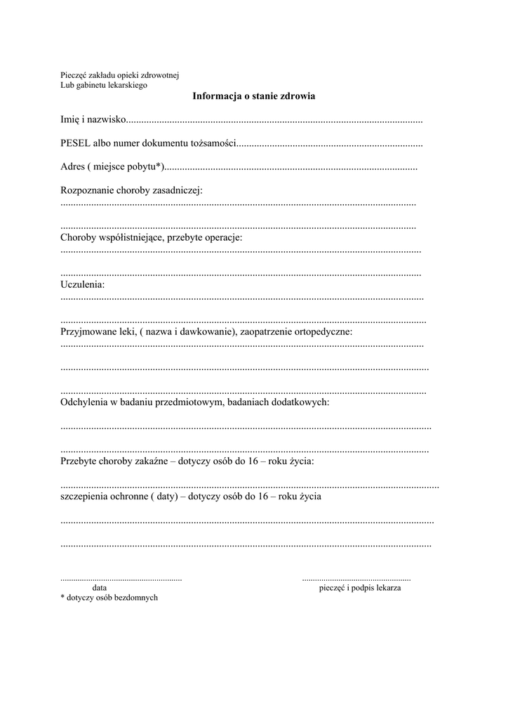 Pieczęć zakładu opieki zdrowotnej Lub gabinetu lekarskiego Informacja o stanie zdrowia Imię i nazwisko.................................................................................................................... PESEL albo numer dokumentu tożsamości......................................................................... Adres ( miejsce pobytu*)................................................................................................... Rozpoznanie choroby zasadniczej: ........................................................................................................................................... ........................................................................................................................................... Choroby współistniejące, przebyte operacje: ............................................................................................................................................. ............................................................................................................................................. Uczulenia: .............................................................................................................................................. ............................................................................................................................................... Przyjmowane leki, ( nazwa i dawkowanie), zaopatrzenie ortopedyczne: .............................................................................................................................................. ................................................................................................................................................ ............................................................................................................................................... Odchylenia w badaniu przedmiotowym, badaniach dodatkowych: ................................................................................................................................................. ................................................................................................................................................ Przebyte choroby zakaźne – dotyczy osób do 16 – roku życia: .................................................................................................................................................... szczepienia ochronne ( daty) – dotyczy osób do 16 – roku życia .................................................................................................................................................. ................................................................................................................................................. ......................................................... data * dotyczy osób bezdomnych ................................................... pieczęć i podpis lekarza