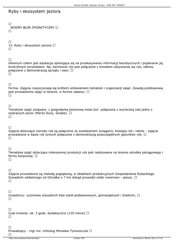 Zielona SzkoÂła, Wakacje, Wczasy - OSW ZHP ''PERKOZ'' Ryby i ekosystem jeziora WODNY BLOK DYDAKTYCZNY 12. Ryby i ekosystem jeziora Głównym celem jest edukacja opierająca się na przekazywaniu informacji teoretycznych i popieranie jej konkretnym przykładem. Np. karmienie ryb jest połączone z tematem odżywiania się ryb, odłowy połączone z demonstracją sprzętu i sieci. Forma: Zajęcia rozpoczynają się krótkim omówieniem tematyki i organizacji zajęć. Zasadą podstawową jest prowadzenie zajęć w terenie, w formie zabawy. Tematyka zajęć związana z gospodarką jeziorową może być połączona z wycieczką nad jedno z wybranych jezior (Maróz Duży, Święte). Zajęcia dotyczące rozrodu ryb są połączone ze zwiedzaniem wylęgarni, biologia ryb i raków - zajęcia prowadzone w bazie ryb żywych połączone z demonstracją poszczególnych gatunków ryb. Tematyka zajęć dotyczące intensywnej produkcji ryb jest realizowana na terenie ośrodka pstrągowego i fermy karpiowej. Zajęcia prowadzone są metodą poglądową, w obiektach produkcyjnych Gospodarstwa Rybackiego Szwaderki oddalonego od Ośrodka o 7 km dokąd prowadzi szlak rowerowo - pieszy. Uczestnicy: uczniowie wszystkich klas szkół podstawowych, gimnazjalnych i średnich, Czas trwania: ok. 3 godz. dydaktyczne (135 minut) Prowadzący - mgr inż. ichtiolog Mirosław Tymoszczuk http://www.perkoz.ehost.pl/kopia Kreator PDF Utworzono 4 March, 2017, 07:12 Zielona SzkoÂła, Wakacje, Wczasy - OSW ZHP ''PERKOZ'' Tematyka zajęć: 1. Jeziora i rzeki w Gospodarstwie Rybackim Szwaderki, ich podział i rodzaje. 2. Ekosystem jeziora: - naturalne czynniki abiotyczne, - naturalne czynniki biotyczne, - produkcja pierwotna zbiorników wodnych, - wpływ zanieczyszczenia wód na organizmy wodne. 3. Produkcja ryb jeziorowych: - odżywianie się ryb jeziorowych, - długość życia i tempo wzrostu, - rozród, - odłowy ryb i ich wpływ na populację. 4. Podstawowe dane o biologii ryb słodkowodnych i systematyka. 5. Ochrona wód śródlądowych. 6. Intensywna produkcja ryb: - organizacja fermy rybackiej - produkcja ryb ciepłolubnych /karp, lin, szczupak, sandacz, amur , tołpyga/ - produkcja ryb łososiowatych http://www.perkoz.ehost.pl/kopia Kreator PDF Utworzono 4 March, 2017, 07:12 Zielona SzkoÂła, Wakacje, Wczasy - OSW ZHP ''PERKOZ'' http://www.perkoz.ehost.pl/kopia Kreator PDF Utworzono 4 March, 2017, 07:12
