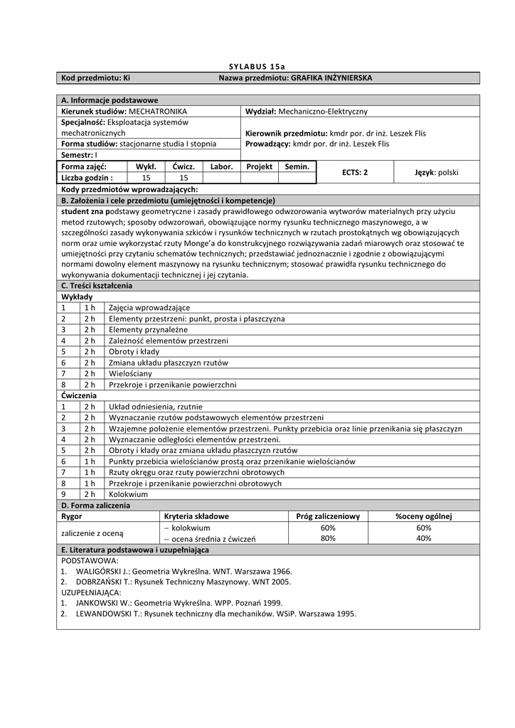 Kod przedmiotu: Ki SY L AB US 1 5a Nazwa przedmiotu: GRAFIKA INŻYNIERSKA A. Informacje podstawowe Kierunek studiów: MECHATRONIKA Wydział: Mechaniczno-Elektryczny Specjalność: Eksploatacja systemów mechatronicznych Kierownik przedmiotu: kmdr por. dr inż. Leszek Flis Forma studiów: stacjonarne studia I stopnia Prowadzący: kmdr por. dr inż. Leszek Flis Semestr: I Forma zajęć: Wykł. Ćwicz. Labor. Projekt Semin. ECTS: 2 Język: polski Liczba godzin : 15 15 Kody przedmiotów wprowadzających: B. Założenia i cele przedmiotu (umiejętności i kompetencje) student zna podstawy geometryczne i zasady prawidłowego odwzorowania wytworów materialnych przy użyciu metod rzutowych; sposoby odwzorowań, obowiązujące normy rysunku technicznego maszynowego, a w szczególności zasady wykonywania szkiców i rysunków technicznych w rzutach prostokątnych wg obowiązujących norm oraz umie wykorzystać rzuty Monge’a do konstrukcyjnego rozwiązywania zadań miarowych oraz stosować te umiejętności przy czytaniu schematów technicznych; przedstawiać jednoznacznie i zgodnie z obowiązującymi normami dowolny element maszynowy na rysunku technicznym; stosować prawidła rysunku technicznego do wykonywania dokumentacji technicznej i jej czytania. C. Treści kształcenia Wykłady 1 1h Zajęcia wprowadzające 2 2h Elementy przestrzeni: punkt, prosta i płaszczyzna 3 2h Elementy przynależne 4 2h Zależność elementów przestrzeni 5 2h Obroty i kłady 6 2h Zmiana układu płaszczyzn rzutów 7 2h Wielościany 8 2h Przekroje i przenikanie powierzchni Ćwiczenia 1 2h Układ odniesienia, rzutnie 2 2h Wyznaczanie rzutów podstawowych elementów przestrzeni 3 2h Wzajemne położenie elementów przestrzeni. Punkty przebicia oraz linie przenikania się płaszczyzn 4 2h Wyznaczanie odległości elementów przestrzeni. 5 2h Obroty i kłady oraz zmiana układu płaszczyzn rzutów 6 1h Punkty przebicia wielościanów prostą oraz przenikanie wielościanów 7 1h Rzuty okręgu oraz rzuty powierzchni obrotowych 8 1h Przekroje i przenikanie powierzchni obrotowych 9 2h Kolokwium D. Forma zaliczenia Rygor Kryteria składowe Próg zaliczeniowy %oceny ogólnej 60% 60% − kolokwium zaliczenie z oceną 80% 40% − ocena średnia z ćwiczeń E. Literatura podstawowa i uzupełniająca PODSTAWOWA: 1. WALIGÓRSKI J.: Geometria Wykreślna. WNT. Warszawa 1966. 2. DOBRZAŃSKI T.: Rysunek Techniczny Maszynowy. WNT 2005. UZUPEŁNIAJĄCA: 1. JANKOWSKI W.: Geometria Wykreślna. WPP. Poznań 1999. 2. LEWANDOWSKI T.: Rysunek techniczny dla mechaników. WSiP. Warszawa 1995.