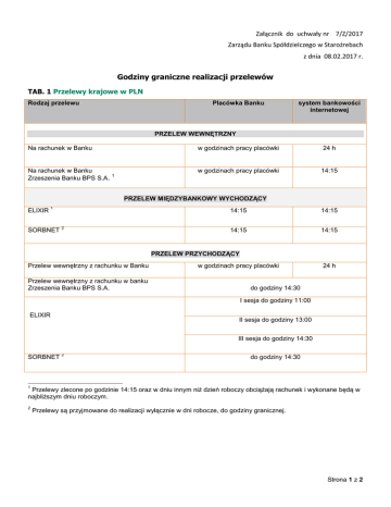 Załącznik do uchwały nr 7/Z/2017 Zarządu Banku Spółdzielczego w Staroźrebach z dnia 08.02.2017 r. Godziny graniczne realizacji przelewów TAB. 1 Przelewy krajowe w PLN Placówka Banku Rodzaj przelewu system bankowości internetowej PRZELEW WEWNĘTRZNY Na rachunek w Banku Na rachunek w Banku Zrzeszenia Banku BPS S.A. w godzinach pracy placówki 24 h w godzinach pracy placówki 14:15 1 PRZELEW MIĘDZYBANKOWY WYCHODZĄCY ELIXIR 1 SORBNET 2 14:15 14:15 14:15 14:15 PRZELEW PRZYCHODZĄCY Przelew wewnętrzny z rachunku w Banku Przelew wewnętrzny z rachunku w banku Zrzeszenia Banku BPS S.A. w godzinach pracy placówki 24 h do godziny 14:30 I sesja do godziny 11:00 ELIXIR II sesja do godziny 13:00 III sesja do godziny 14:30 SORBNET 2 do godziny 14:30 1 Przelewy zlecone po godzinie 14:15 oraz w dniu innym niż dzień roboczy obciążają rachunek i wykonane będą w najbliższym dniu roboczym. 2 Przelewy są przyjmowane do realizacji wyłącznie w dni robocze, do godziny granicznej. Strona 1 z 2 TAB. 2 Przelewy zagraniczne lub przelewy krajowe w walucie obcej Rodzaj Przelewu Data waluty placówka Banku System bankowości internetowej PRZELEW WEWNĘTRZNY Na rachunek w Banku D Na rachunek w banku Zrzeszenia Banku BPS S.A. D w godzinach pracy placówki 14:00 24 h 14:00 PRZELEW WYCHODZĄCY Przekaz w trybie standardowym: SEPA, polecenie wypłaty w walucie EUR D+1 14:00 14:00 Pozostałe polecenia wypłaty D+2 14:00 14:00 D 12:30 12:30 Przekazy w trybie pilnym PRZELEW PRZYCHODZĄCY Na rachunek w Banku D 14:00 Przelew wychodzący zlecony: 1) w dniu roboczym po godzinie granicznej, obciążą rachunek w danym dniu, ale przelew będzie wykonany z datą waluty ustaloną jak dla przelewu złożonego w następnym dniu roboczym, 2) w dniu innym niż dzień roboczy obciążą rachunek klienta w następnym dniu roboczym, a przelew będzie wykonany z datą waluty ustaloną jak dla przelewu złożonego w następnym dniu roboczym.