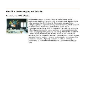 Grafika dekoracyjna na ścianę Nr katalogowy: 099,490353 Grafika dekoracyjna na ścianę Łatwe w zastosowaniu grafiki dekoracyjne błyskawicznie odmienią wystrój każdego pomieszczenia dając niesamowity efekt końcowy. Błyszcząca, samoprzylepna naklejka wykonana z papieru zrobią wrażenie na wszystkich gościach w Twoim domu. W niedrogi i łatwy sposób można nadać niepowtarzalny klimat w dziecięcym pokoju czy w salonie. Tą piekną dekoracją nacieszysz oko, a czas spędzony w takim pomieszczeniu będzie miły i przyjemny, jak nigdy wcześniej. WIOSENNE DRZEWO – naklejki w postaci kwitnącego drzewa. Rozmiar 180 cm x 90 cm Gadżet w skrócie: - naklejka dekoracyjna - wykonana z błyszczącego, samoprzylepnego papieru - łatwe w zastosowaniu - super pomysł na przemianę wnętrza Wymiary produktu: 7 x 7 x 72 cm Waga produktu: 0,75 kg Minimalne zamówienie: 1 sztuka Stand/display: brak