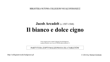 BIBLIOTEKA NUTOWA COLLEGIUM VOCALE BYDGOSZCZ Jacob Arcadelt (c.1507-1568) Il bianco e dolce cigno Utwór nagrany przez zespół Collegium Vocale Bydgoszcz na płycie Bonjour, mon coeur (CVB 001) jako ścieżka nr 13 PARTYTURA ZOPTYMALIZOWANA DLA TABLETÓW http://collegiumvocale.bydgoszcz.pl © 2014 by Michał Zieliński Biały słodki łabędź śpiewając umiera, i ja płaczę, osiągając kres swego żywota. Dziwne jest to, że kiedy on umiera niepocieszony ja konam z rozkoszy. Śmierć, którą umieram wypełnia mnie radością i pożądaniem. Ponieważ nie odczuwam żadnego bólu Byłbym rad umierając po tysiąckroć. Il bian - co͜ e dol - ce ci - gno can - tan - do mo - re ˙ ˙ ˙ w Il bian - co͜ e dol - ce ci - gno can - tan - do mo re et ˙ w w w ∑ ∑ & b C w w. w. Vb C w V b C w w. ?b C Il bian ∑ - ˙ ˙ ˙ w ˙ ˙ ˙ ˙ w ˙ ˙ ˙ ˙. œ œ ˙ ˙ œ œ w ˙ ˙ ˙ ˙. œ ˙ ˙ ˙ co͜ e dol - ce ∑ ci - w ˙ w - gno can - tan - do mo - re ∑ w et io pian - gen - ˙ ˙ bw io pian - gen - ˙ ˙ w et io pian - gen - et io pian - gen - w ˙ ˙ bw > & b bw ˙ 7 do bw Vb w giung' do giung' Vb w w do giung' ? b bw w do giung' ˙ w n˙ al fin ˙ w al fin ˙ w al fin ˙ w al fin del ˙ del ˙ ˙ w - vi - ver mi - vi - ver mi ˙ ˙. del ˙ del ˙ w œ w ˙ vi - ver ˙ w o, w vi - ver mi - w o, et w w mi - o, ˙ w ˙ ˙ ˙ w w o, et w ˙ io pian - gen - do ˙ ˙ bw bw w giung' io pian - gen - do giung' ˙ ˙ w w w ˙ ˙ bw bw w et io pian - gen - do giung' et io pian - gen - do giung' w > & b ˙ w ˙. 13 Vb Vb ˙ w ˙ ˙ w ˙ ˙ mi - o. Stran' ˙ ˙ ˙ ˙ e di - ver - sa al fin vi - ver mi - o. Stran' al fin del del ˙ w ˙ al fin del ?b ˙ w ˙ al fin del œ w vi - ver ˙ w ˙ ˙ w ˙ ˙ w ˙ ˙ ˙ w ˙ ˙. œ ˙ ˙ sor - te w ˙ e di-ver - sa ˙. œ ˙ ˙. sor - te e V ∑ di-ver - sa vi - ver mi - o. vi - ver mi - o. Stran' ˙ ch'ei ˙ ˙ w ch'ei œœœ ˙ ˙ sor - te ˙. œ ˙ ˙ Stran' e di - ver - sa ˙ ˙ ˙ ˙ mo - re scon - so - w mo ˙ - re ˙ ˙ ˙ ch'ei mo - re ˙ ˙ ∑ sor - te > & b ˙ ˙ ˙ ˙ ˙ ˙ ˙ ˙. œ œ œ ˙. 19 la - to io mo - ro be - a scon - so - la - to et io mo - ro scon - so - la - to et io mo - ro ˙ ˙. œ w be a ˙ ˙ ˙ ˙ ˙ ˙ w Vb ˙ ˙ ∑ ∑ - et - - ˙ ˙ ˙ ˙ ˙ ˙ w io mo - ro mo - ro be - a ˙ ˙ ˙ et io - w V. ˙ ˙ ˙ ˙ ˙ ˙ ˙ ˙ ˙ ˙ w b V - ?b et œw to. - Mor - #œ nœ w w ˙ - V be - a - V - to. Mor - to. Mor - to. Mor - w ˙ w ˙ > &b ˙ ˙ ˙ ˙ w 25 Vb Vb w. te che nel mo - ri - re ˙ ˙ ˙ ˙ w w te che nel mo - ri - re ˙ ˙ ˙ ˙ w w te che nel mo - ri - re ?b ˙ ˙ ˙ ˙ w w te che nel mo - ri - re ˙ ˙ ˙ ˙ ˙ ˙ ˙ ˙ ˙ w m'em - pie di gio - ia tut - to͜ e di de - si ˙ ˙ ˙ ˙ ˙ ˙ ˙ ˙ w m'em - pie di gio - ia tut - to͜ e di gio - ia tut - to͜ e di de - si ˙ ˙ ˙ ˙ ˙ ˙ ˙ ˙ ˙ w m'em - pie di gio - ia tut - to͜ e di ˙ re; se w w de - si - re; ˙ ˙ ˙ ˙ ˙ ˙ ˙ ˙. œ w m'em - pie di - de - si w w se ˙ - w re; - w w re; se se > & b ˙ ˙ w. 31 ˙ ˙ ˙ ˙ ˙ w nel mo - rir' al - tro do - lor non sen nel mo - rir' al - tro V b ˙ ˙ w. w. Vb ˙ ˙ nel mo - rir' ?b ˙ ˙ . w nel mo - rir' ˙ ˙. ˙ ˙ ˙ œ ˙ w do - lor non ˙ ˙ to, ˙ ˙ ˙. œ ˙ ˙ ˙ ˙ sen - to, di mil - le mor - te͜ il w al - tro do - lor non sen ˙ ˙ ˙ ˙ - ∑ V. ˙ ˙ w al - tro do - lor non sen - w to, V - to, ˙ di di di ˙. œ ˙. œ mil - le mor - te͜ il ˙ ˙. œ di mil - le > ˙. œ ˙ ˙ ˙ ˙ &b ˙ 36 Vb w. Vb ˙ ˙ di mil - le mor - te͜ il di sa - rei con - ten di mil di œ œ w - ˙ ˙ ˙ w le mor - te͜ il di ˙. œ ˙. œ ˙ ˙ ˙ mil - le mor - te͜ il di sa - rei ? b ˙. œ V mor - te͜ il di w sa - ˙ rei ˙ - to, ˙ ˙. œ ˙. œ ˙ ˙ di mil - le mor - te͜ il di di w. con - ten - to, di mil - le mor - te͜ il mil con - ten - ˙ ˙ to, di di mil - le di ˙ ˙ œ œ ˙. œ ˙. œ ˙ ˙ ˙ w ˙. œ ˙ V di ˙ - le ˙. œ mil - le ˙. œ ˙. œ V mil - le mor - te͜ il di > &b ˙ ˙ ˙ ˙ œ œ w 41 Vb mor - te͜ il di sa - rei con-ten ˙ ˙ w mor - te͜ il di V b ˙. œ ˙ ˙ ˙ ?b mor - te͜ il di sa - rei w sa - ˙ rei ˙ V - to. V V ˙. œ ˙. œ ˙ ˙ w V ˙ ˙. œ ˙. œ ˙. œ ˙ ˙ w ˙ V ˙ ˙. œ ˙. œ ˙ ˙ di mil - le mor - te͜ il di sa - rei ˙ w con-ten - V to, di con - ten - to. mil - le mor - te͜ il di ˙. œ ˙. œ ˙ œ œ ˙ w con-ten-to, di mil - le mor - te͜ il di sa - rei con - ten - to. ˙ ˙ ˙ w V sa - rei con - ten - to.