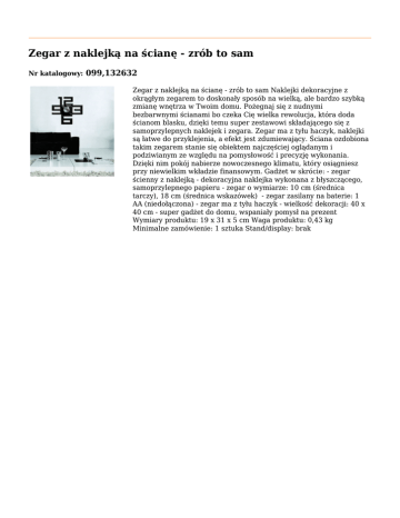 Zegar z naklejką na ścianę - zrób to sam Nr katalogowy: 099,132632 Zegar z naklejką na ścianę - zrób to sam Naklejki dekoracyjne z okrągłym zegarem to doskonały sposób na wielką, ale bardzo szybką zmianę wnętrza w Twoim domu. Pożegnaj się z nudnymi bezbarwnymi ścianami bo czeka Cię wielka rewolucja, która doda ścianom blasku, dzięki temu super zestawowi składającego się z samoprzylepnych naklejek i zegara. Zegar ma z tyłu haczyk, naklejki są łatwe do przyklejenia, a efekt jest zdumiewający. Ściana ozdobiona takim zegarem stanie się obiektem najczęściej oglądanym i podziwianym ze względu na pomysłowość i precyzję wykonania. Dzięki nim pokój nabierze nowoczesnego klimatu, który osiągniesz przy niewielkim wkładzie finansowym. Gadżet w skrócie: - zegar ścienny z naklejką - dekoracyjna naklejka wykonana z błyszczącego, samoprzylepnego papieru - zegar o wymiarze: 10 cm (średnica tarczy), 18 cm (średnica wskazówek) - zegar zasilany na baterie: 1 AA (niedołączona) - zegar ma z tyłu haczyk - wielkość dekoracji: 40 x 40 cm - super gadżet do domu, wspaniały pomysł na prezent Wymiary produktu: 19 x 31 x 5 cm Waga produktu: 0,43 kg Minimalne zamówienie: 1 sztuka Stand/display: brak