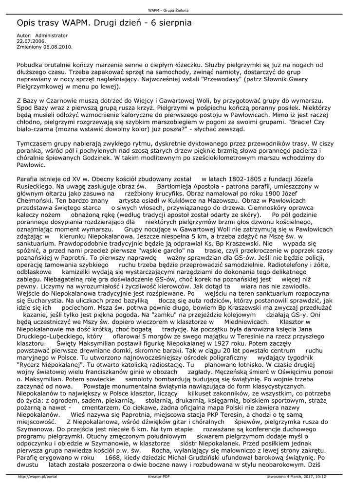 WAPM - Grupa Zielona Opis trasy WAPM. Drugi dzień - 6 sierpnia Autor: Administrator 22.07.2006. Zmieniony 06.08.2010. Pobudka brutalnie kończy marzenia senne o ciepłym łóżeczku. Służby pielgrzymki są już na nogach od dłuższego czasu. Trzeba zapakować sprzęt na samochody, zwinąć namioty, dostarczyć do grup naprawiany w nocy sprzęt nagłaśniający. Najwcześniej wstali "Przewodasy" (patrz Słownik Gwary Pielgrzymkowej w menu po lewej). Z Bazy w Czarnowie muszą dotrzeć do Wiejcy i Gawartowej Woli, by przygotować grupy do wymarszu. Spod Bazy wraz z pierwszą grupą rusza krzyż. Pielgrzymi w pośpiechu kończą poranny posiłek. Niektórzy będą musieli odłożyć wzmocnienie kaloryczne do pierwszego postoju w Pawłowicach. Mimo iż jest raczej chłodno, pielgrzymi rozgrzewają się szybkim marszobiegiem w pogoni za swoimi grupami. "Bracie! Czy biało-czarna (można wstawić dowolny kolor) już poszła?" - słychać zewsząd. Tymczasem grupy nabierają zwykłego rytmu, dyskretnie dyktowanego przez przewodników trasy. W ciszy poranka, wśród pól i pochylonych nad szosą starych drzew pięknie brzmią słowa porannego pacierza i chóralnie śpiewanych Godzinek. W takim modlitewnym po sześciokilometrowym marszu wchodzimy do Pawłowic. Parafia istnieje od XV w. Obecny kościół zbudowany został w latach 1802-1805 z fundacji Józefa Rusieckiego. Na uwagę zasługuje obraz św. Bartłomieja Apostoła - patrona parafii, umieszczony w głównym ołtarzu jako zasuwa na rzeźbiony krucyfiks. Obraz namalował po roku 1900 Józef Chełmoński. Ten bardzo znany artysta osiadł w Kuklówce na Mazowszu. Obraz w Pawłowicach przedstawia świętego starca o siwych włosach, przywiązanego do drzewa. Ciemnoskóry oprawca kaleczy nożem obnażoną rękę (według tradycji apostoł został odarty ze skóry). Po pół godzinie porannego dosypiania rozdzierająco dla niektórych pielgrzymów brzmi głos dzwonu kościelnego, oznajmiając moment wymarszu. Grupy nocujące w Gawartowej Woli nie zatrzymują się w Pawłowicach zdążając w kierunku Niepokalanowa. Jeszcze niespełna 5 km, a trzeba zdążyć na Mszę św. w sanktuarium. Prawdopodobnie tradycyjnie będzie ją odprawiał Ks. Bp Kraszewski. Nie wypada się spóźnić, a przed nami przecież pierwsze "wąskie gardło" na trasie, czyli przekroczenie w poprzek szosy poznańskiej w Paprotni. To pierwszy naprawdę ważny sprawdzian dla GS-ów. Jeśli nie będzie policji, operację tamowania szybkiego ruchu trzeba będzie przeprowadzić samodzielnie. Radiotelefony i żółte, odblaskowe kamizelki wydają się wystarczającymi narzędziami do dokonania tego delikatnego zabiegu. Niebagatelną rolę gra doświadczenie GS-ów, choć korek na poznańskiej jest więcej niż pewny. Liczymy na wyrozumiałość i życzliwość kierowców. Jak dotąd ta wiara nas nie zawiodła. Wejście do Niepokalanowa tradycyjnie jest rozśpiewane. Po wejściu na teren sanktuarium rozpoczyna się Eucharystia. Na uliczkach przed bazyliką tłoczą się auta rodziców, którzy postanowili sprawdzić, jak idzie się ich pociechom. Msza św. potrwa pewnie długo, bowiem Bp Kraszewski ma zwyczaj przedłużać kazanie, jeśli tylko jest piękna pogoda. Na "zamku" na przejeździe kolejowym działają GS-y. Oni będą uczestniczyć we Mszy św. dopiero wieczorem w klasztorze w Miedniewicach. Klasztor w Niepokalanowie ma dość krótką, choć bogatą tradycję. Na początku była darowizna księcia Jana Druckiego-Lubeckiego, który ofiarował 5 morgów ze swego majątku w Teresinie na rzecz przyszłego klasztoru. Święty Maksymilian postawił figurkę Niepokalanej w 1927 roku. Potem zaczęły powstawać pierwsze drewniane domki, skromne baraki. Tak w ciągu 20 lat powstało centrum ruchu maryjnego w Polsce. Tu utworzono najnowocześniejszy ośrodek poligraficzny wydający tygodnik "Rycerz Niepokalanej". Tu otwarto katolicką radiostację. Tu planowano lotnisko. W czasie drugiej wojny światowej wielu franciszkanów ginie w obozach zagłady. Męczeńską śmierć w Oświęcimiu ponosi o. Maksymilian. Potem sowieckie samoloty bombardują budującą się świątynię. Po wojnie trzeba zaczynać od nowa. Powstaje monumentalna świątynia nawiązująca do form klasycystycznych. Niepokalanów to największy w Polsce klasztor, liczący kilkuset zakonników, ze wszystkim, co potrzeba do życia: z ogrodem, sadem, piekarnią, stolarnią, drukarnią, księgarnią, boiskiem sportowym, strażą pożarną a nawet cmentarzem. Co ciekawe, żadna oficjalna mapa Polski nie zawiera nazwy Niepokalanów. Wieś nazywa się Paprotnia, miejscowa stacja PKP Teresin, a chodzi o tę samą miejscowość. Z Niepokalanowa, wśród dźwięków gitar i chóralnych śpiewów, pielgrzymka rusza do Szymanowa. Do przejścia jest niecałe 6 km. Na tym etapie rozważane są konferencje duchowego programu pielgrzymki. Otuchy zmęczonym południowym skwarem pielgrzymom dodaje myśl o odpoczynku i obiedzie w Szymanowie, w klasztorze sióstr Niepokalanek. Przed posiłkiem jednak pierwsza grupa nawiedza kościół p.w. św. Rocha, wyłaniający się malowniczo z lewej strony zakrętu. Parafię erygowano w roku 1668, kiedy dziedzic Michał Grudziński ufundował barokową świątynię. Po dwustu latach została poszerzona o dwie boczne nawy i rozbudowana w stylu neobarokowym. Dziś http://wapm.pl/portal Kreator PDF Utworzono 4 March, 2017, 10:12 WAPM - Grupa Zielona trudno już odróżnić te dwie części. W ogrodzie sióstr Niepokalanek stoją już przygotowane wiktuały obiadowe. Jest to chyba najlepiej oznakowany postój na całej trasie pielgrzymki. Z daleka widać wyraźne napisy: woda, chleb, zupa. Strzałki wskazują kierunki do WC. W centralnym miejscu mieści się kaplica. W tej kaplicy pątnicy klękają przed słynnym posągiem Najświętszej Maryi Panny. Jego historia rozpoczyna się w Jazłowcu, niedużej miejscowości położonej wśród podolskich jarów. W 1863 roku przybyły tam z Rzymu si