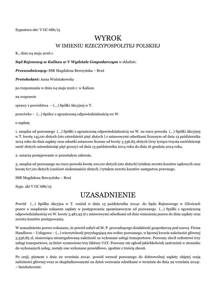 Sygnatura akt: V GC 686/15 WYROK W IMIENIU RZECZYPOSPOLITEJ POLSKIEJ K., dnia 04 maja 2016 r. Sąd Rejonowy w Kaliszu w V Wydziale Gospodarczym w składzie: Przewodniczący: SSR Magdalena Berczyńska – Bruś Protokolant: Anna Woźniakowska po rozpoznaniu w dniu 04 maja 2016 r. w Kaliszu na rozprawie sprawy z powództwa – (...) Spółki Akcyjnej w T. przeciwko – (...) Spółce z ograniczoną odpowiedzialnością we W. o zapłatę 1. zasądza od pozwanego (...) Spółki z ograniczoną odpowiedzialnością we W. na rzecz powoda (...) Spółki Akcyjnej w T. kwotę 145,00 złotych (sto czterdzieści pięć złotych ) z ustawowymi odsetkami liczonym od dnia 13 października 2014 roku do dnia zapłaty oraz odsetki ustawowe liczone od kwoty 3 336,85 złotych (trzy tysiące trzysta sześćdziesiąt sześć złotych osiemdziesiąt pięć groszy) od dnia 13 października 2014 roku do dnia 16 grudnia 2014 roku, 2. umarza postępowanie w pozostałym zakresie, 3. zasądza od pozwanego na rzecz powoda kwotę 100,00 złotych (sto złotych) tytułem zwrotu kosztów sądowych oraz kwotę 617,00 złotych (sześćset siedemnaście złotych ) tytułem zwrotu kosztów zastępstwa prawnego. SSR Magdalena Berczyńska – Bruś Sygn. akt V GC 686/15 UZASADNIENIE Powód (...) Spółka Akcyjna w T. wniósł w dniu 13 października 2014r. do Sądu Rejonowego w Gliwicach pozew o zasądzenie nakazem zapłaty w postępowaniu upominawczym od pozwanego (...) Spółki z ograniczoną odpowiedzialnością we W. kwoty 3.481,93 zł z ustawowymi odsetkami od dnia wniesienia pozwu do dnia zapłaty oraz zwrotu kosztów postępowania. W uzasadnieniu pozwu wskazano, że powód nabył od M. P. prowadzącego działalność gospodarczą pod nazwą Firma Handlowo – Usługowo – (...) wierzytelność przysługującą mu wobec pozwanego, w łącznej kwocie należności głównej 3.336,85 zł, stanowiąca nieuregulowaną należność za wykonane usługi transportowe. Pozwany zlecił cedentowi trzy usługi transportowe, za które wystawiono trzy faktury VAT. Pozwany nie zgłosił jakichkolwiek zastrzeżeń w stosunku do wykonanych usług, zostały one wykonane prawidłowo, zgodnie z treścią zleceń. Po cesji, pismem z dnia 22 września 2014r. powód wezwał pozwanego do dobrowolnej zapłaty objętej cesją należności głównej wraz ze skapitalizowanymi na dzień wezwania odsetkami w terminie do dnia 29 września 2014r. – bezskutecznie. Do pozwu załączono pismo M. P. do pozwanego z dnia 18 września 2014r., w której poinformował pozwanego o cesji wierzytelności na rzecz powoda i dokonanie spłaty wierzytelności na rachunek nowego wierzyciela, trzy umowy zlecenia wraz z fakturami VAT i dokumentami CMR oraz wezwanie do zapłaty i wyliczenie odsetek na dzień 8 października 2014r. W dniu 25 listopada 2014r. Referendarz Sądowy w Sądzie Rejonowym w Gliwicach wydał nakaz zapłaty w postepowaniu upominawczym, sygn. akt VII GNc 4970/14, którym orzekł zgodnie z żądaniem pozwu. Zachowując ustawowy termin pozwany wniósł sprzeciw od nakazu zapłaty zaskarżając go w całości. Pozwany zarzucił brak istnienia wierzytelności po stronie powoda w dniu złożenia pozwu i brak właściwości miejscowej Sądu Rejonowego w Gliwicach. Pozwany zarzucił brak prawidłowej realizacji zlecenia przez poprzednika powoda. Strony ustaliły termin do przesłania pozwanemu dokumentów dotyczących przewozu na 10 dni od dnia rozładunku i możliwość liczenia terminu płatności od daty otrzymania przez pozwanego prawidłowo wystawionej faktury VAT wraz z kompletem dokumentów przewozowych. Powód nie wykazał jednak faktycznej daty dostarczenia towaru do odbiorcy przez poprzednika powoda. Postanowieniem z dnia 25 lutego 2015r. Sąd Rejonowy w Gliwicach stwierdził swą niewłaściwość miejscową i przekazał sprawę do rozpoznania Sądowi Rejonowemu w Kaliszu Wydziałowi Gospodarczemu. W odpowiedzi na sprzeciw pełnomocnik powoda ze względu na dokonanie przez pozwanego w dniu 16 grudnia 2014r. wpłaty na rzecz cedenta kwoty 3.336,85 zł, zmieniła żądanie pozwu w ten sposób, że wniosła o zasądzenie od pozwanego kwoty 145,08 zł z ustawowymi odsetkami od dnia wniesienia pozwu do dnia zapłaty oraz odsetek ustawowych od kwoty 3.336,85 zł od dnia wniesienia pozwu do dnia zapłaty oraz o zasądzenie zwrotu kosztów procesu. W pozostałym zakresie cofnęła pozew. Podniosła również, że pozwany został zawiadomiony prawidłowo o cesji wierzytelności. Do pisma załączono dowód przelewu z dnia 16 grudnia 2014r. na kwotę 3.336,85 zł z tytułu trzech faktur załączonych do pozwu. Sąd ustalił następujący stan faktyczny: W dniu 27 marca 2014r. pozwany zlecił M. P. usługę transportową na trasie Francja – Polska za kwotę wynagrodzenia 150 EUR, wg średniego kursu NBP ogłoszonego w dniu poprzedzającym dzień rozładunku, z terminem płatności 60 dni od dnia wpłynięcia faktury wraz z dokumentami. W punkcie 15 zlecenia wskazano, że płatność za wykonaną usługę transportową liczona jest od daty otrzymania prawidłowo wystawionej faktury VAT wraz z kompletem dokumentów przewozowych, które należy dostarczyć w nieprzekraczalnym terminie 10 dni liczonych od dnia rozładunku. W puncie 16 wskazano, że przekroczenie terminu dostarczenia dokumentów automatycznie skutkuje wydłużeniem terminu płatności o dodatkowe 30 dni, oraz cesji obciążeń nałożonych na pozwanego przez zleceniodawcę. W punkcie 19 zlecenia wskazano, że kwota faktury wystawionej w walucie obcej przeliczna jest na polskie złote – przeliczenia na złote dokonuje się według kursu średniego danej waluty obcej, ogłoszonego przez NBP na ostatni dzień roboczy poprzedzający dzień powstania obowiązku podatkowego, obowiązek podatkowy powstaje w dniu wykonania usługi – potwierdzonej na dokumencie CMR datą, pieczęcią i podpisem. Dowód: zlecenie nr (...) z 27.03.2014r. (k.18 – 19 akt) Przewóz został wykonany zgodnie ze zlecen