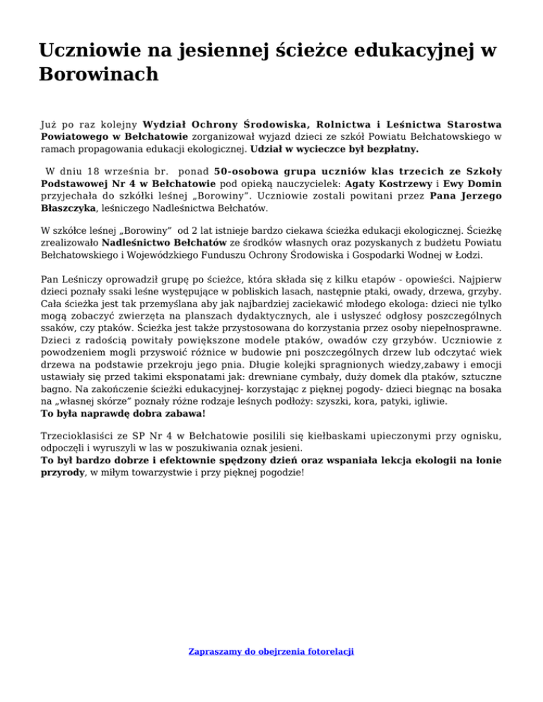 Uczniowie na jesiennej ścieżce edukacyjnej w Borowinach Już po raz kolejny Wydział Ochrony Środowiska, Rolnictwa i Leśnictwa Starostwa Powiatowego w Bełchatowie zorganizował wyjazd dzieci ze szkół Powiatu Bełchatowskiego w ramach propagowania edukacji ekologicznej. Udział w wycieczce był bezpłatny. W dniu 18 września br. ponad 50-osobowa grupa uczniów klas trzecich ze Szkoły Podstawowej Nr 4 w Bełchatowie pod opieką nauczycielek: Agaty Kostrzewy i Ewy Domin przyjechała do szkółki leśnej „Borowiny”. Uczniowie zostali powitani przez Pana Jerzego Błaszczyka, leśniczego Nadleśnictwa Bełchatów. W szkółce leśnej „Borowiny” od 2 lat istnieje bardzo ciekawa ścieżka edukacji ekologicznej. Ścieżkę zrealizowało Nadleśnictwo Bełchatów ze środków własnych oraz pozyskanych z budżetu Powiatu Bełchatowskiego i Wojewódzkiego Funduszu Ochrony Środowiska i Gospodarki Wodnej w Łodzi. Pan Leśniczy oprowadził grupę po ścieżce, która składa się z kilku etapów - opowieści. Najpierw dzieci poznały ssaki leśne występujące w pobliskich lasach, następnie ptaki, owady, drzewa, grzyby. Cała ścieżka jest tak przemyślana aby jak najbardziej zaciekawić młodego ekologa: dzieci nie tylko mogą zobaczyć zwierzęta na planszach dydaktycznych, ale i usłyszeć odgłosy poszczególnych ssaków, czy ptaków. Ścieżka jest także przystosowana do korzystania przez osoby niepełnosprawne. Dzieci z radością powitały powiększone modele ptaków, owadów czy grzybów. Uczniowie z powodzeniem mogli przyswoić różnice w budowie pni poszczególnych drzew lub odczytać wiek drzewa na podstawie przekroju jego pnia. Długie kolejki spragnionych wiedzy,zabawy i emocji ustawiały się przed takimi eksponatami jak: drewniane cymbały, duży domek dla ptaków, sztuczne bagno. Na zakończenie ścieżki edukacyjnej- korzystając z pięknej pogody- dzieci biegnąc na bosaka na „własnej skórze” poznały różne rodzaje leśnych podłoży: szyszki, kora, patyki, igliwie. To była naprawdę dobra zabawa! Trzecioklasiści ze SP Nr 4 w Bełchatowie posilili się kiełbaskami upieczonymi przy ognisku, odpoczęli i wyruszyli w las w poszukiwania oznak jesieni. To był bardzo dobrze i efektownie spędzony dzień oraz wspaniała lekcja ekologii na łonie przyrody, w miłym towarzystwie i przy pięknej pogodzie! Zapraszamy do obejrzenia fotorelacji (Kliknij tutaj) A. Gaszewska-Woroniecka, WOŚRiL