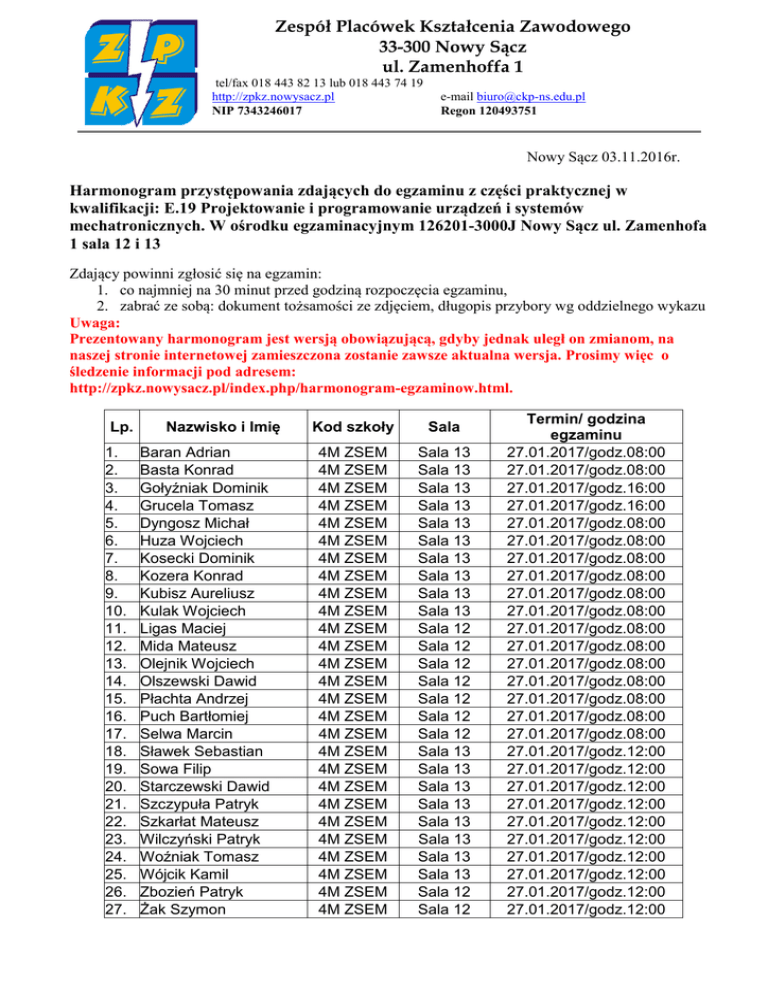 Zespół Placówek Kształcenia Zawodowego 33-300 Nowy Sącz ul. Zamenhoffa 1 tel/fax 018 443 82 13 lub 018 443 74 19 http://zpkz.nowysacz.pl NIP 7343246017 e-mail [email protected] Regon 120493751 Nowy Sącz 03.11.2016r. Harmonogram przystępowania zdających do egzaminu z części praktycznej w kwalifikacji: E.19 Projektowanie i programowanie urządzeń i systemów mechatronicznych. W ośrodku egzaminacyjnym 126201-3000J Nowy Sącz ul. Zamenhofa 1 sala 12 i 13 Zdający powinni zgłosić się na egzamin: 1. co najmniej na 30 minut przed godziną rozpoczęcia egzaminu, 2. zabrać ze sobą: dokument tożsamości ze zdjęciem, długopis przybory wg oddzielnego wykazu Uwaga: Prezentowany harmonogram jest wersją obowiązującą, gdyby jednak uległ on zmianom, na naszej stronie internetowej zamieszczona zostanie zawsze aktualna wersja. Prosimy więc o śledzenie informacji pod adresem: http://zpkz.nowysacz.pl/index.php/harmonogram-egzaminow.html. Lp. 1. 2. 3. 4. 5. 6. 7. 8. 9. 10. 11. 12. 13. 14. 15. 16. 17. 18. 19. 20. 21. 22. 23. 24. 25. 26. 27. Nazwisko i Imię Baran Adrian Basta Konrad Gołyźniak Dominik Grucela Tomasz Dyngosz Michał Huza Wojciech Kosecki Dominik Kozera Konrad Kubisz Aureliusz Kulak Wojciech Ligas Maciej Mida Mateusz Olejnik Wojciech Olszewski Dawid Płachta Andrzej Puch Bartłomiej Selwa Marcin Sławek Sebastian Sowa Filip Starczewski Dawid Szczypuła Patryk Szkarłat Mateusz Wilczyński Patryk Woźniak Tomasz Wójcik Kamil Zbozień Patryk Żak Szymon Kod szkoły Sala 4M ZSEM 4M ZSEM 4M ZSEM 4M ZSEM 4M ZSEM 4M ZSEM 4M ZSEM 4M ZSEM 4M ZSEM 4M ZSEM 4M ZSEM 4M ZSEM 4M ZSEM 4M ZSEM 4M ZSEM 4M ZSEM 4M ZSEM 4M ZSEM 4M ZSEM 4M ZSEM 4M ZSEM 4M ZSEM 4M ZSEM 4M ZSEM 4M ZSEM 4M ZSEM 4M ZSEM Sala 13 Sala 13 Sala 13 Sala 13 Sala 13 Sala 13 Sala 13 Sala 13 Sala 13 Sala 13 Sala 12 Sala 12 Sala 12 Sala 12 Sala 12 Sala 12 Sala 12 Sala 13 Sala 13 Sala 13 Sala 13 Sala 13 Sala 13 Sala 13 Sala 13 Sala 12 Sala 12 Termin/ godzina egzaminu 27.01.2017/godz.08:00 27.01.2017/godz.08:00 27.01.2017/godz.16:00 27.01.2017/godz.16:00 27.01.2017/godz.08:00 27.01.2017/godz.08:00 27.01.2017/godz.08:00 27.01.2017/godz.08:00 27.01.2017/godz.08:00 27.01.2017/godz.08:00 27.01.2017/godz.08:00 27.01.2017/godz.08:00 27.01.2017/godz.08:00 27.01.2017/godz.08:00 27.01.2017/godz.08:00 27.01.2017/godz.08:00 27.01.2017/godz.08:00 27.01.2017/godz.12:00 27.01.2017/godz.12:00 27.01.2017/godz.12:00 27.01.2017/godz.12:00 27.01.2017/godz.12:00 27.01.2017/godz.12:00 27.01.2017/godz.12:00 27.01.2017/godz.12:00 27.01.2017/godz.12:00 27.01.2017/godz.12:00