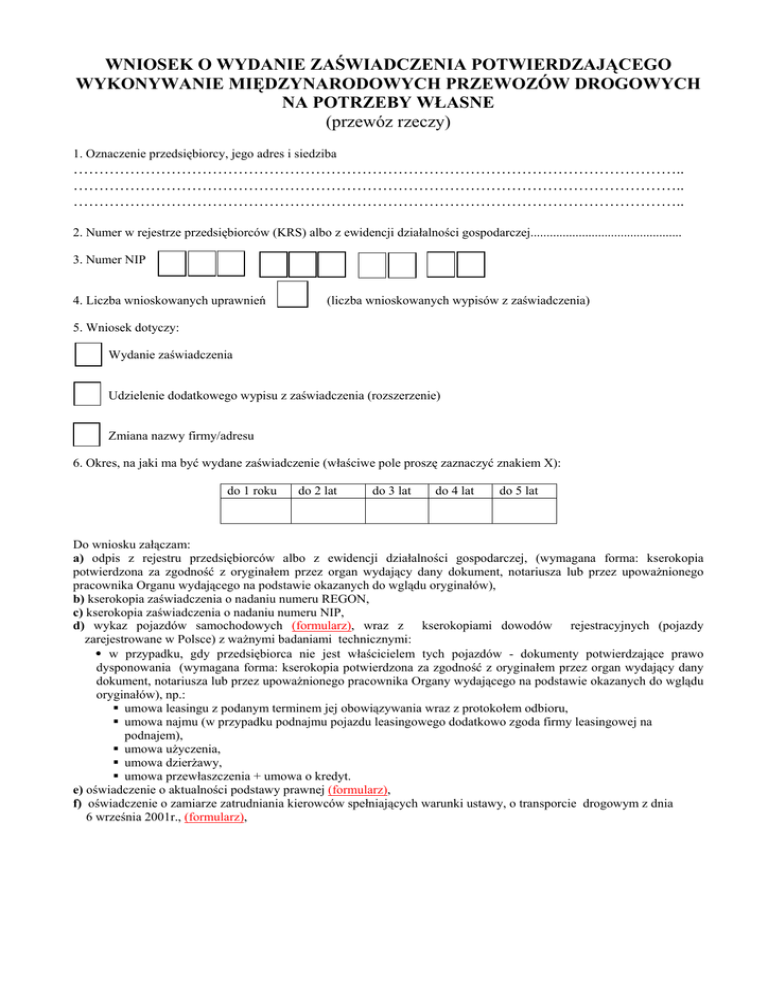 WNIOSEK O WYDANIE ZAŚWIADCZENIA POTWIERDZAJĄCEGO WYKONYWANIE MIĘDZYNARODOWYCH PRZEWOZÓW DROGOWYCH NA POTRZEBY WŁASNE (przewóz rzeczy) 1. Oznaczenie przedsiębiorcy, jego adres i siedziba ……………………………………………………………………………………………………….. ……………………………………………………………………………………………………….. ……………………………………………………………………………………………………….. 2. Numer w rejestrze przedsiębiorców (KRS) albo z ewidencji działalności gospodarczej............................................... 3. Numer NIP 4. Liczba wnioskowanych uprawnień (liczba wnioskowanych wypisów z zaświadczenia) 5. Wniosek dotyczy: Wydanie zaświadczenia Udzielenie dodatkowego wypisu z zaświadczenia (rozszerzenie) Zmiana nazwy firmy/adresu 6. Okres, na jaki ma być wydane zaświadczenie (właściwe pole proszę zaznaczyć znakiem X): do 1 roku do 2 lat do 3 lat do 4 lat do 5 lat Do wniosku załączam: a) odpis z rejestru przedsiębiorców albo z ewidencji działalności gospodarczej, (wymagana forma: kserokopia potwierdzona za zgodność z oryginałem przez organ wydający dany dokument, notariusza lub przez upoważnionego pracownika Organu wydającego na podstawie okazanych do wglądu oryginałów), b) kserokopia zaświadczenia o nadaniu numeru REGON, c) kserokopia zaświadczenia o nadaniu numeru NIP, d) wykaz pojazdów samochodowych (formularz), wraz z kserokopiami dowodów rejestracyjnych (pojazdy zarejestrowane w Polsce) z ważnymi badaniami technicznymi: w przypadku, gdy przedsiębiorca nie jest właścicielem tych pojazdów - dokumenty potwierdzające prawo dysponowania (wymagana forma: kserokopia potwierdzona za zgodność z oryginałem przez organ wydający dany dokument, notariusza lub przez upoważnionego pracownika Organy wydającego na podstawie okazanych do wglądu oryginałów), np.: umowa leasingu z podanym terminem jej obowiązywania wraz z protokołem odbioru, umowa najmu (w przypadku podnajmu pojazdu leasingowego dodatkowo zgoda firmy leasingowej na podnajem), umowa użyczenia, umowa dzierżawy, umowa przewłaszczenia + umowa o kredyt. e) oświadczenie o aktualności podstawy prawnej (formularz), f) oświadczenie o zamiarze zatrudniania kierowców spełniających warunki ustawy, o transporcie drogowym z dnia 6 września 2001r., (formularz), 7. Forma odbioru zaświadczenia (właściwe pole zaznaczyć znakiem X). W przypadku nie dokonania wyboru zaświadczenie zostanie wysłane kurierem na koszt przedsiębiorcy. Osobiście w siedzibie Organu wydającego Przesyłka kurierska – na koszt przedsiębiorcy Opłata za zaświadczenie i wypis na przewóz rzeczy: Okres na jaki ma być wydane zaświadczenie Opłata za zaświadczenie Opłata za wypis z zaświadczenia do jednego roku 100 zł 20 zł do dwóch lat do trzech lat do czterech lat do pięciu lat Za zmianę zaświadczenia, polegającą na zmianie danych w nim zawartych, o ile zmiana ta nie spowoduje zmiany formy prawnej działalności i terminu ważności zaświadczenia oraz po zwróceniu dotychczasowego dokumentu 200 zł 300 zł 400 zł 500 zł 40 zł 60 zł 80 zł 100 zł 25 zł 10 zł Opłata skarbowa: zwolniono z opłaty skarbowej – art. 3 ustawy o opłacie skarbowej (Dz.U z 2006 r. Nr 225, poz. 1635 z późniejszymi zmianami) Wpłaty należy dokonać na konto – Narodowy Bank Polski 83 1010 1010 0079 7913 9120 0000 Dodatkowe informacje: Liczba wypisów z zaświadczenia na potrzeby własne przy przewozie rzeczy odpowiada liczbie zgłoszonych pojazdów do wykonywania przewozów drogowych. WAŻNE Kontakt tel. do osoby przygotowującej wniosek ………………………………………………………………………………………………………………………… Kontakt e-mail do osoby przygotowującej wniosek ……………………………………………………..…….…………………………………………………………….. podpis przedsiębiorcy
