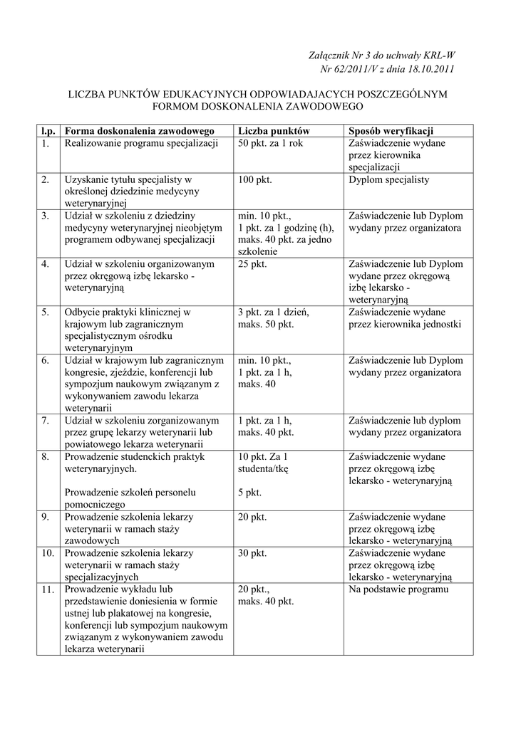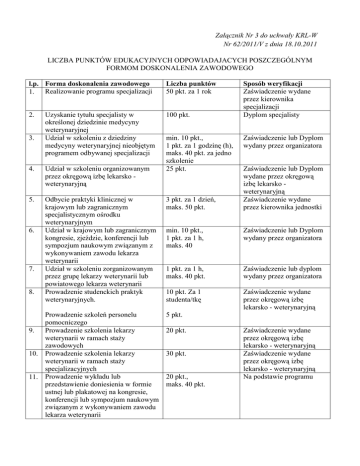 Załącznik Nr 3 do uchwały KRL-W Nr 62/2011/V z dnia 18.10.2011 LICZBA PUNKTÓW EDUKACYJNYCH ODPOWIADAJACYCH POSZCZEGÓLNYM FORMOM DOSKONALENIA ZAWODOWEGO l.p. Forma doskonalenia zawodowego 1. Realizowanie programu specjalizacji 2. 3. Uzyskanie tytułu specjalisty w określonej dziedzinie medycyny weterynaryjnej Udział w szkoleniu z dziedziny medycyny weterynaryjnej nieobjętym programem odbywanej specjalizacji 4. Udział w szkoleniu organizowanym przez okręgową izbę lekarsko weterynaryjną 5. Odbycie praktyki klinicznej w krajowym lub zagranicznym specjalistycznym ośrodku weterynaryjnym Udział w krajowym lub zagranicznym kongresie, zjeździe, konferencji lub sympozjum naukowym związanym z wykonywaniem zawodu lekarza weterynarii Udział w szkoleniu zorganizowanym przez grupę lekarzy weterynarii lub powiatowego lekarza weterynarii Prowadzenie studenckich praktyk weterynaryjnych. 6. 7. 8. Prowadzenie szkoleń personelu pomocniczego 9. Prowadzenie szkolenia lekarzy weterynarii w ramach staży zawodowych 10. Prowadzenie szkolenia lekarzy weterynarii w ramach staży specjalizacyjnych 11. Prowadzenie wykładu lub przedstawienie doniesienia w formie ustnej lub plakatowej na kongresie, konferencji lub sympozjum naukowym związanym z wykonywaniem zawodu lekarza weterynarii Liczba punktów 50 pkt. za 1 rok 100 pkt. min. 10 pkt., 1 pkt. za 1 godzinę (h), maks. 40 pkt. za jedno szkolenie 25 pkt. 3 pkt. za 1 dzień, maks. 50 pkt. Sposób weryfikacji Zaświadczenie wydane przez kierownika specjalizacji Dyplom specjalisty Zaświadczenie lub Dyplom wydany przez organizatora Zaświadczenie lub Dyplom wydane przez okręgową izbę lekarsko weterynaryjną Zaświadczenie wydane przez kierownika jednostki min. 10 pkt., 1 pkt. za 1 h, maks. 40 Zaświadczenie lub Dyplom wydany przez organizatora 1 pkt. za 1 h, maks. 40 pkt. Zaświadczenie lub dyplom wydany przez organizatora 10 pkt. Za 1 studenta/tkę Zaświadczenie wydane przez okręgową izbę lekarsko - weterynaryjną 5 pkt. 20 pkt. 30 pkt. 20 pkt., maks. 40 pkt. Zaświadczenie wydane przez okręgową izbę lekarsko - weterynaryjną Zaświadczenie wydane przez okręgową izbę lekarsko - weterynaryjną Na podstawie programu 12. Uzyskanie stopnia naukowego doktora, 200 pkt. doktora habilitowanego lub tytułu profesora w dziedzinie nauk weterynaryjnych 50 pkt. 13. Uzyskanie uprawnień konsultanta w określonej dziedzinie medycyny weterynaryjnej uznanych przez KRLW 14. Publikacja książki lub artykułu z zakresu medycyny weterynaryjnej w fachowym, recenzowanym czasopiśmie lub opracowanie edukacyjnego programu multimedialnego 15. Publikacja książki, artykułu lub opracowanie programu multimedialnego o charakterze popularno-naukowym z zakresu medycyny weterynaryjnej 16. Przetłumaczenie i opublikowanie artykułu, książki, rozdziału w książce lub edukacyjnego programu multimedialnego – z zakresu medycyny weterynaryjnej 17. Opublikowanie artykułu w fachowym czasopiśmie indeksowanym przez Filadelfijski Instytut Informacji Naukowej, Medline lub Index Copernicus 18. roczna prenumerata w ramach jednej praktyki czasopisma weterynaryjnego z listy Krajowej Izby Lekarsko – Weterynaryjnej 19. zakup książki o tematyce fachowej lub programu multimedialnego 20. Przynależność do stowarzyszenia lekarzy weterynarii lub innego stowarzyszenia naukowego z zakresu nauk przyrodniczych 21. Uzyskanie tytułu specjalisty na poziomie europejskim lub amerykańskim 22. Szkolenie pracowników Inspekcji na poziomie powiatowym, wojewódzkim lub centralnym 23. Udział w programie edukacyjnym opartym o zadania testowe akredytowanym przez Komisję KRLW 100 pkt. - książka, artykuł - 20 pkt., program multimedialny – 20 pkt. Dyplom Zaświadczenie odpowiedniego stowarzyszenia lekarzy weterynarii lub na wniosek innej organizacji Notka bibliograficzna 75 pkt. - książka, artykuł – 5 pkt., program multimedialny – 10 pkt. Notka bibliograficzna 15 – 75 pkt. Notka bibliograficzna 40 pkt. Notka bibliograficzna 5 pkt. za tytuł, maks. 10 pkt. za rok Potwierdzenie przez wydawcę, kierownika ZLZ lub dowód wpłaty 5 pkt. za tytuł dowód nabycia 5 pkt. za rok Zaświadczenie 100 pkt. Zaświadczenie lub Dyplom Min. 10 pkt., 1 pkt za 1 h Zaświadczenie lub Dyplom wydany przez organizatora 5 – 20 pkt. Zaświadczenie lub Dyplom