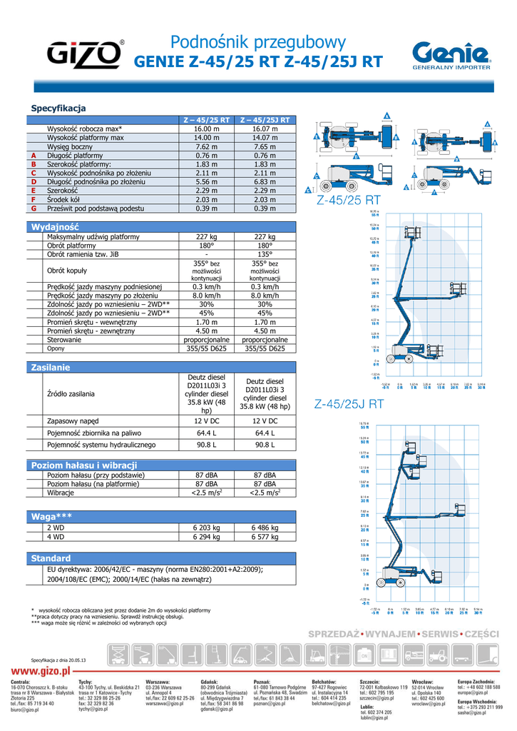 Podnośnik przegubowy GENIE Z-45/25 RT Z-45/25J RT Specyfikacja A B C D E F G Wysokość robocza max* Wysokość platformy max Wysięg boczny Długość platformy Szerokość platformy: Wysokość podnośnika po złożeniu Długość podnośnika po złożeniu Szerokość Środek kół Prześwit pod podstawą podestu Z – 45/25 RT 16.00 m 14.00 m 7.62 m 0.76 m 1.83 m 2.11 m 5.56 m 2.29 m 2.03 m 0.39 m Z – 45/25J RT 16.07 m 14.07 m 7.65 m 0.76 m 1.83 m 2.11 m 6.83 m 2.29 m 2.03 m 0.39 m 227 kg 180° 355° bez 227 kg 180° 135° 355° bez możliwości kontynuacji możliwości kontynuacji 0.3 km/h 8.0 km/h 30% 45% 1.70 m 4.50 m proporcjonalne 355/55 D625 0.3 km/h 8.0 km/h 30% 45% 1.70 m 4.50 m proporcjonalne 355/55 D625 Wydajność Maksymalny udźwig platformy Obrót platformy Obrót ramienia tzw. JiB Obrót kopuły Prędkość jazdy maszyny podniesionej Prędkość jazdy maszyny po złożeniu Zdolność jazdy po wzniesieniu – 2WD** Zdolność jazdy po wzniesieniu – 2WD** Promień skrętu - wewnętrzny Promień skrętu - zewnętrzny Sterowanie Opony Zasilanie Źródło zasilania Zapasowy napęd Deutz diesel D2011L03i 3 cylinder diesel 35.8 kW (48 hp) 12 V DC Deutz diesel D2011L03i 3 cylinder diesel 35.8 kW (48 hp) 12 V DC Pojemność zbiornika na paliwo 64.4 L 64.4 L Pojemność systemu hydraulicznego 90.8 L 90.8 L 87 dBA 87 dBA <2.5 m/s2 87 dBA 87 dBA <2.5 m/s2 6 203 kg 6 294 kg 6 486 kg 6 577 kg Poziom hałasu i wibracji Poziom hałasu (przy podstawie) Poziom hałasu (na platformie) Wibracje Waga*** 2 WD 4 WD Standard EU dyrektywa: 2006/42/EC - maszyny (norma EN280:2001+A2:2009); 2004/108/EC (EMC); 2000/14/EC (hałas na zewnątrz) * wysokość robocza obliczana jest przez dodanie 2m do wysokości platformy **praca dotyczy pracy na wzniesieniu. Sprawdź instrukcję obsługi. *** waga może się różnić w zależności od wybranych opcji Specyfikacja z dnia 20.05.13 Podnośnik przegubowy GENIE Z-45/25 RT Z-45/25J RT CHARAKTERYSTYKA Standardowe wyposażenie Z-45/25 - 16.00 m – wysokość robocza - 7.62 m - zasięg boczny - 7.16 m - max. prześwit na poziomym wysięgniku - do 227 kg udźwigu platformy Z-45/25J - 16.07 m – wysokość robocza - 7.65 m - zasięg boczny - 7.16 m - max. prześwit na poziomym wysięgniku - do 227 kg udźwigu platformy Opcje dodatkowe - - Platforma - 1.83 m stalowa platforma Platforma z systemem samopoziomowania Hydraulicznie obrotowa platforma - Zestaw do pracy w nieprzyjaznym środowisku (osłony cylindrów, uszczelki i szczotki czyszczące ramiona maszyny, osłona pulpitu górnego)* - Moduł odcięcia przy zbyt niskiej temperaturze Biodegradowalny olej hydrauliczny Pakiet do prac przy samolotach (piankowe osłony barierek, system automatycznego odcięcia zasilania w przypadku dotknięcia platformą do elementu samolotu* Pojemnik na narzędzia Pojemnik na świetlówki Łoże na rury* Światła robocze na platformie Zamykana osłona pulpitu górnego Zestaw wskaźników silnika (wskaźniki: ciśnienia oleju, temperatury, obrotów silnika) Wyposażenie - W pełni płynne sterowanie Przycisk funkcji skrętu kół w joysticku System zabezpieczający przed jazdą w przeciwnym kierunku Linia 230V poprowadzona do platformy Sygnał dźwiękowy Licznik roboczogodzin Alarm przechyłowy Zestaw ostrzegawczy z błyskającym światłem - 355 stopni stałego obrotu kopuły bez możliwości kontynuacji System trakcji Oś oscylacyjna Dwie prędkości motorów jazdy Certyfikowany system kontroli udźwigu maszyny - - Zasilanie - 12 V DC jako napęd zapasowy Pakiet ochrony silnika Podgrzewanie powietrza na wejściu do silnika Deutz Silnik wysuwany z podstawy na obrotowej platformie Silniki spełniające obowiązujące normy Napęd - 4x4 Koła - Wypełnione pianą do ciężkiego terenu * Wymagana opcja platformy – platforma z wejściem z trzech stron Bramka uchylna na platformie* Dodatkowa barierka wokół platformy zabezpieczająca przed przyciśnięciem rąk operatora* Linia pneumatyczna doprowadzona do platformy Zabezpieczenie linii 230V doprowadzonej do platformy (wtyczka, gniazdko w koszu, wyłącznik różnicowo prądowy na podstawie maszyny) Pakiet oświetleniowy: 2 światła do jazdy umiejscowione na podwoziu, 2 światła robocze umiejscowione na platformie - Zestaw do holowania Podgrzewanie silnika przed rozruchem Generator hydrauliczny (110V/60Hz lub 230V/50Hz) Pakiet do prac w niskich temperaturach