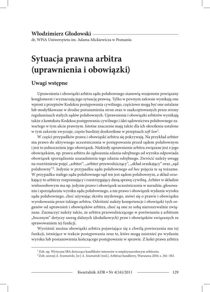 Włodzimierz Głodowski dr, WPiA Uniwersytetu im. Adama Mickiewicza w Poznaniu Sytuacja prawna arbitra (uprawnienia i obowiązki) Uwagi wstępne Uprawnienia i obowiązki arbitra sądu polubownego stanowią wzajemnie powiązany konglomerat i wyznaczają jego sytuację prawną. Tylko w pewnym zakresie wynikają one wprost z przepisów Kodeksu postępowania cywilnego, częściowo mogą być one ustalane lub modyfikowane w drodze porozumienia stron oraz w zaakceptowanych przez strony regulaminach stałych sądów polubownych. Uprawnienia i obowiązki arbitrów wynikają także z kontekstu Kodeksu postępowania cywilnego i idei sądownictwa polubownego zawartego w tym akcie prawnym. Istotne znaczenie mają także dla ich określenia ustalone w tym zakresie zwyczaje, często bardziej dookreślone w przepisach soft law1. W części przypadków prawa i obowiązki arbitra się pokrywają. Na przykład arbiter ma prawo do aktywnego uczestniczenia w postępowaniu przed sądem polubownym i jest to jednocześnie jego obowiązek. Niekiedy uprawnienie arbitra związane jest z jego obowiązkiem, np. prawu arbitra do zgłoszenia zdania odrębnego od wyroku odpowiada obowiązek sporządzenia uzasadnienia tego zdania odrębnego. Zwrócić należy uwagę na rozróżnienie pojęć „arbiter”, „arbiter przewodniczący”, „skład orzekający” oraz „sąd polubowny”2 . Jedynie w przypadku sądu polubownego ad hoc pojęcia te są tożsame. W przypadku stałego sądu polubownego sąd ten jest sądem polubownym, a skład orzekający to arbitrzy rozpoznający i rozstrzygający daną sprawę cywilną. Arbiter w składzie wieloosobowym ma np. jedynie prawo i obowiązek uczestniczenia w naradzie, głosowaniu i sporządzeniu wyroku sądu polubownego, a nie prawo i obowiązek wydania wyroku sądu polubownego, choć używając skrótu myślowego, mówi się o prawie i obowiązku wyrokowania przez takiego arbitra. Odróżnić należy kompetencje i obowiązki tych organów od uprawnień i obowiązków arbitra, choć są one ze sobą nierozerwalnie związane. Zaznaczyć należy także, że arbitra przewodniczącego w porównaniu z arbitrem „bocznym” dotyczy szereg dalszych (dodatkowych) praw i obowiązków związanych ze sprawowaniem tej funkcji. Wyróżnić można obowiązki arbitra pojawiające się z chwilą powierzenia mu tej funkcji, istniejące w trakcie postępowania oraz te, które mogą zaistnieć po wydaniu wyroku lub postanowienia kończącego postępowanie w sprawie. Z kolei prawa arbitra 1 Zob. 2 Zob. np. Wytyczne IBA dotyczące konfliktów interesów w międzynarodowym arbitrażu. szerzej A. Szumański, [w:] A. Szumański (red.), Arbitraż handlowy, Warszawa 2010, s. 361−363. Kwartalnik ADR • Nr 4(16)/2011 129 Głodowski to prawo do wynagrodzenia i zwrotu wydatków oraz prawa związane z tokiem postępowania i z wyrokowaniem. Obowiązki arbitra związane są także z jego odpowiedzialnością za ich prawidłową realizację. Niewywiązywanie się przez arbitra z jego obowiązków może w szczególności spowodować pozbawienie go mandatu arbitra w danym postępowaniu w drodze odwołania albo wyłączenia lub może skutkować odpowiedzialnością cywilną arbitra. Zaznaczyć należy, że naruszenie obowiązków arbitra może mieć wpływ na wydany przez skład orzekający wyrok sądu polubownego. Stwarzać ono może bowiem możliwość skutecznego uchylenia tego wyroku w drodze skargi o uchylenie wyroku sądu polubownego na podstawie art. 1206 § 1 pkt 2 lub 4 KPC bądź art. 1206 § 2 pkt 2 KPC. Uchybienie obowiązkom arbitra skutkować może także odmową uznania lub stwierdzenia wykonalności wyroku sądu polubownego zgodnie z art. 1214 § 3 pkt 2 KPC. Obowiązki arbitra związane z jego zdatnością do pełnienia funkcji arbitra Arbiter ma obowiązek posiadać już od chwili powołania go na tę funkcję pewne określone cechy (przymioty) i zachować je przez czas trwania postępowania przed sądem polubownym. Arbitrem zgodnie z art. 1170 KPC może być każda osoba fizyczna, bez względu na obywatelstwo, mająca pełną zdolność do czynności prawnych, z wyjątkiem sędziego sądu państwowego. Sędzia państwowy może natomiast zostać arbitrem, w przypadku gdy jest już w stanie spoczynku. Zdolność prawna i zdolność do czynności prawnych cudzoziemców zgodnie z art. 9 ustawy – Prawo prywatne międzynarodowe3 oceniana jest według ich prawa ojczystego. Kwalifikacje arbitra do pełnienia funkcji arbitra obejmują kwalifikacje ogólne (przesłanki ustawowe), które spełniać musi każdy arbiter, określone w art. 1170 KPC, oraz kwalifikacje szczególne (cechy dodatkowe arbitra), które mogą być określone w danej sprawie przez strony, a uwzględniane są z urzędu przez sąd państwowy przy wyznaczaniu arbitra (art. 1173 KPC). Arbiter przed powołaniem go na tę funkcję powinien złożyć oświadczenie (jest to jego obowiązek) o ewentualnie istniejących w tym zakresie przeszkodach. Ukrycie przez arbitra takich okoliczności może także stanowić postawę jego odpowiedzialności odszkodowawczej względem stron. Ustawowo określonym obowiązkiem arbitra jest także posiadanie cech niezależności i bezstronności (art. 1173 § 1 i art. 1174 § 1 KPC). Są one podstawowymi (minimalnymi) cechami arbitra wymaganymi przez Kodeks postępowania cywilnego4. Wymóg niezależności i bezstronności arbitra jest kluczową cechą arbitrażu, niezbędną dla jego wiarygodności i zaufania stron do przyjętej przez nie procedury5. Każdy z arbitrów powinien posiadać te przymioty w danym postępowaniu przed sądem polubownym, i to jeszcze przed wszczęciem postępowania przed sądem polubownym. Osoba powołana na arbitra powinna niezwłocznie ujawnić stronom wszystkie okoliczności, które mogłyby wzbudzić 3 Ustawa z 4.2.2011 r. – Prawo prywatne międzynarodowe (Dz.U. Nr 80, poz. 432). A. Szumański, op. cit., s. 369. 5 Zob. A. Kąkolecki, Kwalifikacje i wyłączanie sędziów s