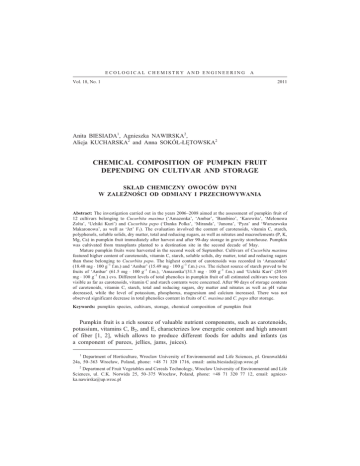 ECOLOGICAL CHEMISTRY AND ENGINEERING A Vol. 18, No. 1 2011 Anita BIESIADA1, Agnieszka NAWIRSKA2, Alicja KUCHARSKA2 and Anna SOKÓ£-£ÊTOWSKA2 CHEMICAL COMPOSITION OF PUMPKIN FRUIT DEPENDING ON CULTIVAR AND STORAGE SK£AD CHEMICZNY OWOCÓW DYNI W ZALE¯NOŒCI OD ODMIANY I PRZECHOWYWANIA Abstract: The investigation carried out in the years 2006–2008 aimed at the assessment of pumpkin fruit of 12 cultivars belonging to Cucurbita maxima (‘Amazonka’, ‘Ambar’, ‘Bambino’, ‘Karowita’, ‘Melonowa Zolta’, ‘Uchiki Kuri’) and Cucurbita pepo (‘Danka Polka’, ‘Miranda’, ‘Junona’, ‘Pyza’ and ‘Warszawska Makaronowa’, as well as ‘Jet’ F1). The evaluation involved the content of carotenoids, vitamin C, starch, polyphenols, soluble solids, dry matter, total and reducing sugars, as well as nitrates and macroelements (P, K, Mg, Ca) in pumpkin fruit immediately after harvest and after 90-day storage in gravity storehouse. Pumpkin was cultivated from transplants planted to a destination site in the second decade of May. Mature pumpkin fruits were harvested in the second week of September. Cultivars of Cucurbita maxima featured higher content of carotenoids, vitamin C, starch, soluble solids, dry matter, total and reducing sugars than those belonging to Cucurbita pepo. The highest content of carotenoids was recorded in ‘Amazonka’ (18.40 mg × 100 g–1 f.m.) and ‘Ambar’ (15.49 mg × 100 g–1 f.m.) cvs. The richest source of starch proved to be fruits of ‘Ambar’ (61.5 mg × 100 g–1 f.m.), ‘Amazonka’(31.3 mg × 100 g–1 f.m.) and ‘Uchiki Kuri’ (20.95 mg × 100 g–1 f.m.) cvs. Different levels of total phenolics in pumpkin fruit of all estimated cultivars were less visible as far as carotenoids, vitamin C and starch contents were concerned. After 90 days of storage contents of carotenoids, vitamin C, starch, total and reducing sugars, dry matter and nitrates as well as pH value decreased, while the level of potassium, phosphorus, magnesium and calcium increased. There was not observed significant decrease in total phenolics content in fruits of C. maxima and C. pepo after storage. Keywords: pumpkin species, cultivars, storage, chemical composition of pumpkin fruit Pumpkin fruit is a rich source of valuable nutrient components, such as carotenoids, potassium, vitamins C, B2, and E, characterizes low energetic content and high amount of fiber [1, 2], which allows to produce different foods for adults and infants (as a component of purees, jellies, jams, juices). 1 Department of Horticulture, Wroclaw University of Environmental and Life Sciences, pl. Grunwaldzki 24a, 50–363 Wroc³aw, Poland, phone: +48 71 320 1716, email: [email protected] 2 Department of Fruit Vegetables and Cereals Technology, Wroclaw University of Environmental and Life Sciences, ul. C.K. Norwida 25, 50–375 Wroc³aw, Poland, phone: +48 71 320 77 12, email: [email protected] 10 Anita Biesiada et al Carotenoids derived from pumpkin fruit can be used as natural food colorant [3]. Pumpkin fruit is a crop with good preservation capacity but regarding good quality of product pumpkins generally cannot be stored beyond 90 days, even in ideal storage conditions [4, 5]. In Poland there are grown two species of pumpkin Cucurbita maxima and Cucurbita pepo. Among botanical varieties of C. pepo the most popular are zucchini and pattypan squash type cultivated for immature fruit crop, whereas the production of cultivars for fully mature fruit crop is less popular in Poland. The purpose of the research conducted in the years 2006–2008 was the assessment of fruit quality of 12 pumpkin cultivars classified to two species – C. maxima and C. pepo directly after their harvesting and after storage. Materials and methods Three-year field experiment was carried out in the Experimental Station of Wroclaw University of Environmental and Life Sciences on fine clay soil containing 1.8 % of organic matter, of pH = 7.15 and high content of phosphorus (90–125 mg × dm–3) potassium (220–240 mg × dm–3) and magnesium (80–100 mg × dm–3). The experiment was established as two-factors pattern, in four replications. The plot area was 6.0 m2 (3.0 × 2.0 m). There were estimated different cultivars of Cucurbita maxima (‘Amazonka’, ‘Ambar’, ‘Bambino’, ‘Karowita’, ‘Melonowa Zolta’ and ‘Uchiki Kuri’) and Cucurbita pepo (‘Danka Polka’, ‘Jet’ F1, ‘Junona’ ‘Miranda’, ‘Pyza’ and ‘Makaronowa Warszawska’) cultivated from transplants. Ammonium nitrate was used in dose of 200 kg N × ha–1 as a broadcast (100 kg N × ha–1) and top dressing (100 kg N × ha–1) application. Seed were sown in the second week of April to multicells filled with peat substrate (126 cm3 per one cell). Transplants were planted to the field in spacing 1.5 × 1 m in the second week of May. Crop management was conducted according to commonly accepted standards for these species. Harvest took place in the second week of September. At harvest 3 fruits per plot were sampled for chemical analysis, the rest of the crop was kept in storage house with gravity ventilation at the temperature of 10 oC and RH 75 %. After 90 days of storage fruit samples were collected in the same amounts. They were prepared by cutting pumpkin fruit, removing the placenta and seeds, milling the flesh with blender. Immediately after harvesting and at the end of storage there were assayed the contents of vitamin C (Tillman’s method), total carotenoids [6], total and reducing sugars (by Lane-Eynon method), soluble solids in degree of Brix scale using refractometer (ATAGO-POCTEL), as well as dry matter by drying to constant weight at 105 oC. Nitrates were determined using an ion-selective electrode. The content of total phenolic compounds was determined according to Folin-Ciocalteu method [7]. The contents of macroelements: phosphorus, potassium, magnesium and calcium were assayed due to Nowosielski method [8