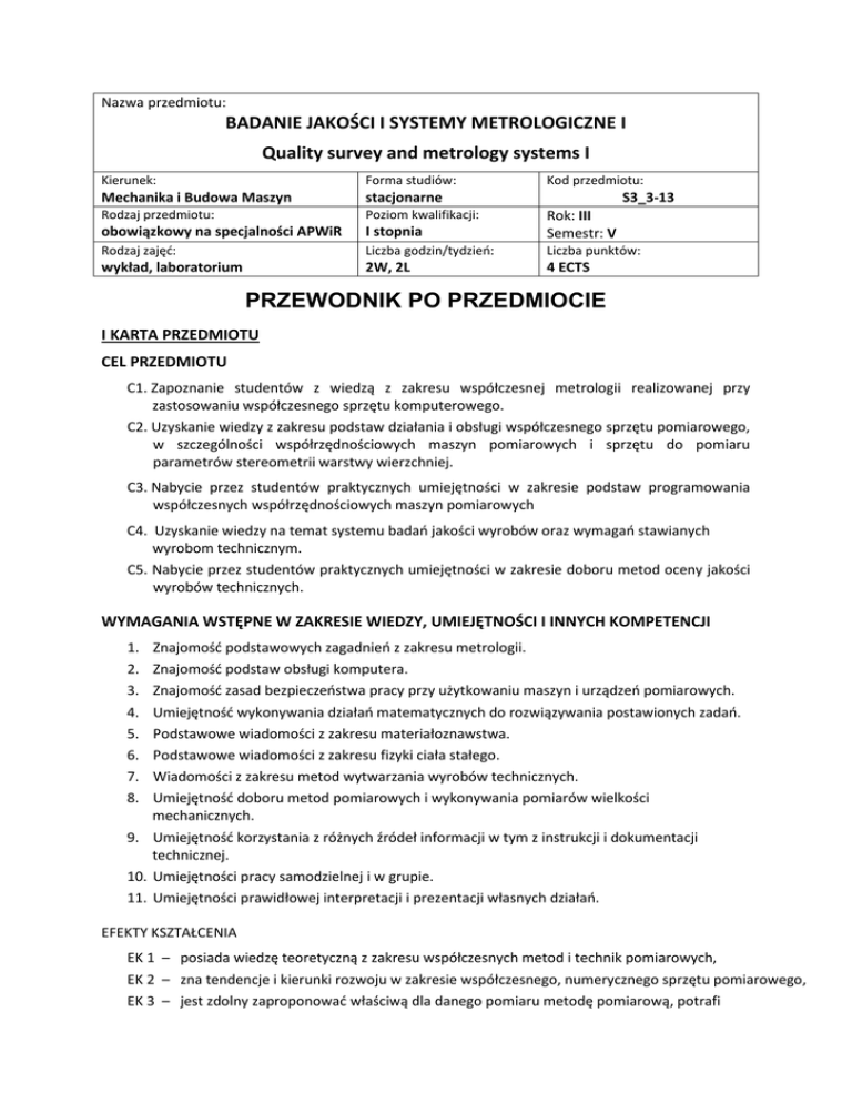 Nazwa przedmiotu: BADANIE JAKOŚCI I SYSTEMY METROLOGICZNE I Quality survey and metrology systems I Kierunek: Forma studiów: Mechanika i Budowa Maszyn stacjonarne Kod przedmiotu: Rodzaj przedmiotu: Poziom kwalifikacji: obowiązkowy na specjalności APWiR I stopnia Rok: III Semestr: V Rodzaj zajęć: Liczba godzin/tydzień: Liczba punktów: wykład, laboratorium 2W, 2L 4 ECTS S3_3-13 PRZEWODNIK PO PRZEDMIOCIE I KARTA PRZEDMIOTU CEL PRZEDMIOTU C1. Zapoznanie studentów z wiedzą z zakresu współczesnej metrologii realizowanej przy zastosowaniu współczesnego sprzętu komputerowego. C2. Uzyskanie wiedzy z zakresu podstaw działania i obsługi współczesnego sprzętu pomiarowego, w szczególności współrzędnościowych maszyn pomiarowych i sprzętu do pomiaru parametrów stereometrii warstwy wierzchniej. C3. Nabycie przez studentów praktycznych umiejętności w zakresie podstaw programowania współczesnych współrzędnościowych maszyn pomiarowych C4. Uzyskanie wiedzy na temat systemu badań jakości wyrobów oraz wymagań stawianych wyrobom technicznym. C5. Nabycie przez studentów praktycznych umiejętności w zakresie doboru metod oceny jakości wyrobów technicznych. WYMAGANIA WSTĘPNE W ZAKRESIE WIEDZY, UMIEJĘTNOŚCI I INNYCH KOMPETENCJI 1. 2. 3. 4. 5. 6. 7. 8. Znajomość podstawowych zagadnień z zakresu metrologii. Znajomość podstaw obsługi komputera. Znajomość zasad bezpieczeństwa pracy przy użytkowaniu maszyn i urządzeń pomiarowych. Umiejętność wykonywania działań matematycznych do rozwiązywania postawionych zadań. Podstawowe wiadomości z zakresu materiałoznawstwa. Podstawowe wiadomości z zakresu fizyki ciała stałego. Wiadomości z zakresu metod wytwarzania wyrobów technicznych. Umiejętność doboru metod pomiarowych i wykonywania pomiarów wielkości mechanicznych. 9. Umiejętność korzystania z różnych źródeł informacji w tym z instrukcji i dokumentacji technicznej. 10. Umiejętności pracy samodzielnej i w grupie. 11. Umiejętności prawidłowej interpretacji i prezentacji własnych działań. EFEKTY KSZTAŁCENIA EK 1 – posiada wiedzę teoretyczną z zakresu współczesnych metod i technik pomiarowych, EK 2 – zna tendencje i kierunki rozwoju w zakresie współczesnego, numerycznego sprzętu pomiarowego, EK 3 – jest zdolny zaproponować właściwą dla danego pomiaru metodę pomiarową, potrafi EK 4 – EK 5 – EK 6 – EK 7 – EK 8 – dokonać oceny i udowodnić zasadność przyjętego rozwiązania metrologicznego, zna ogólne zasady działania, obsługi i doboru skomputeryzowanych maszyn pomiarowych, potrafi wyznaczyć podstawowe parametry wybranych pomiarów, zna techniki kształtowania cech użytkowych wyrobów warunkujących ich jakość technologiczną i użytkową, ma ogólną wiedzę w zakresie współczesnej metrologii parametrów geometrycznych wyrobów i metrologii warstwy wierzchniej, potrafi przygotować sprawozdanie z przebiegu realizacji ćwiczeń. EK 9 – posiada wiedzę na temat systemu kontroli jakości wyrobów w UE, EK 10 – posiada wiedzę na temat wymagań stawianych wyrobom technicznym, EK 11 – potrafi dobrać odpowiednią metodę oceny jakości w odniesieniu do konkretnego wyrobu technicznego, EK 12 – posiada wiedzę teoretyczną z zakresu metod badań nieniszczących, EK 13 – potrafi odróżnić podstawowe wady występujące w wyrobach technicznych. 2 TREŚCI PROGRAMOWE Forma zajęć – WYKŁADY W1 - Współczesna metrologia i jej podział. Błędy pomiarów. Klasyfikacja współczesnych przyrządów pomiarowych. W2 - Współrzędnościowa technika pomiarowa. W3,W4 - Współrzędnościowe maszyny pomiarowe, podział, budowa i zasady działania. W5 - Podstawowe procedury pomiarowe. Metrologia długości i kąta. W6 - Przegląd typowych pakietów oprogramowania pomiarowego. W7 - Opis matematyczny procedur pomiarowych. Elementy skojarzone. W8 - Komputeryzacja pomiarów długości i kątów, wymiarów przestrzennie złożonych, wymiarów pośrednich. W9 - Metody analityczne i kompleksowe. Ustalanie baz pomiarowych. Konfiguracje modelowe. W10 - Pomiary błędów kształtu realizowane przy wykorzystaniu współrzędnościowej techniki pomiarowej. W11 - Typowe błędy komputerowych technik pomiarowych, wyznaczanie błędów działania WMP. W12 - Rodzaje jakości wyrobów, pojęcie jakości technologicznej i użytkowej wyrobów. W13 - Inżynieria jakości - błędy wykonania wyrobów: błędy kształtu, położenia i wykonania powierzchni i ich pomiary. W14,15- Inżynieria warstwy wierzchniej – komputerowo wspomagane pomiary chropowatości, stereometrii i właściwości fizycznych warstwy wierzchniej. W 16 – Przemysłowe systemy wykrywania wad. W 17 – System kontroli jakości wyrobów w UE. W 18, 19 – Zapewnienie jakości wyrobów w procesach odlewniczych. Klasyfikacja wad wyrobów odlewanych. W 20, 21 – Zapewnienie jakości wyrobów w procesach kucia. Wymagania jakościowe W 22 – Wymagania dotyczące jakości wykonania stawiane odkuwkom. Wady wyrobów kutych. W 23, 24 – Wymagania jakościowe stawiane wytłoczkom. W 25 - Wady wyrobów tłoczonych i metody ich wykrywania. W 26 – Zapewnienie jakości w procesach wytwarzania wyrobów z proszków spiekanych. W 27 – Wady wyrobów spiekanych. W 28 – Zapewnienie jakości wyrobów w procesach walcowania. W 29 – Wady wyrobów walcowanych. W 30 – Organizacja kontroli jakości w wybranych przedsiębiorstwach produkcyjnych, przykłady. Forma zajęć – LABORATORIUM L1 L2 L3 L4,L5 L6,L7 - Współrzędnościowa maszyna pomiarowa, zasada działania, budowa, podstawy jej obsługi i programowania. - Wprowadzenie do współrzędnościowej techniki pomiarowej. Demonstracja typowych pakietów oprogramowania pomiarowego. - Programowanie współrzędnościowej maszyny pomiarowej – praca na komputerowym symulatorze przebiegu pomiaru. - Opracowanie, przygotowanie i praktyczne przeniesienie na maszynę pomiarową planu pomiaru wybranego detalu. - Pomiary 