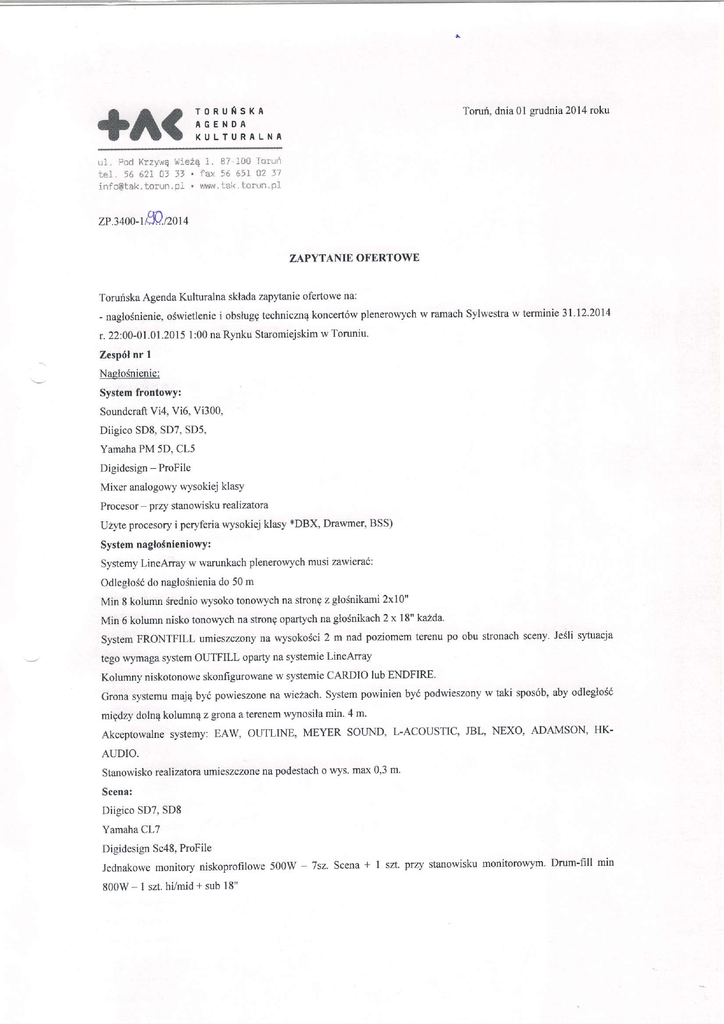 Naglosnienie,oswietleniei obslugQtechniczn4koncertu plenerowegow ramachSwigta Trzech Ik6lu w terminie