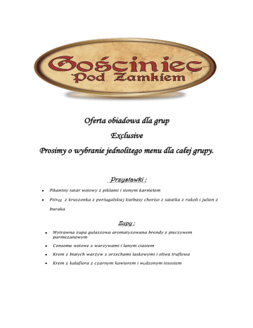 Oferta obiadowa dla grup Exclusive Prosimy o wybranie jednolitego menu dla całej grupy. Przystawki : Pikantny tatar wołowy z piklami i słonym karmelem Pstrąg z kruszonka z portugalskiej kiełbasy choriso z sałatka z rukoli i julien z buraka Zupy : Wytrawna zupa gulaszowa aromatyzowana brendy z pieczywem parmezanowym Consome wołowe z warzywami i lanym ciastem Krem z białych warzyw z orzechami laskowymi i oliwa truflowa Krem z kalafiora z czarnym kawiorem i wędzonym łososiem Drugie Danie Polędwiczki w sosie z czerwonego wina z zapiekanką graten i taghiatele z cukinii Udko z kaczki confit w sosie z borowików podane z chrupiącymi kluskami i kapusta z kurkami. Polędwica z dorsza podana na grillowanych ziemniakach, sosie z szalotek i mini buraczkami Rostbef z sosem Barnasie z szaszłykiem ziemniaczanym, grillowanymi pomidorami i bazylią (dopłata plus 10 zł) Dodatki ( do wyboru ) Ziemniaki opiekane Frytki Ziemniaki z wody (sezonowo) Ziemniaki puree Ryz Chleb Surówki ( do wyboru ) Pekińska Surówka z marchewki Surówka z Selera Surówka szwedzka ( z kiszonych ogórków ) Z czerwonej kapusty Napoje : Woda mineralna w dzbankach Kompot Bufet z kawą i herbatą Desery Lody z sosem owocowym i chrupiącym ciasteczkiem Chrupiące ciasto czekoladowe z wiśniami marynowanymi w wódce Szarlotka z sosem malinowym i gałko lodów śmietankowych Sernik z sosem karmelowym Diety przyrządzane u nas w restauracji Wegetariańska Wegańska Bezglutenowa Uczulenie na laktozę Bez wieprzowiny Bez tłuszczowa Serdecznie Zapraszamy !!!