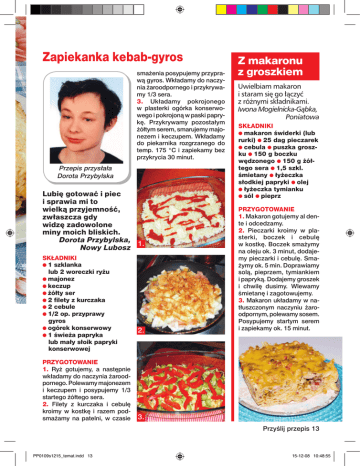 Zapiekanka kebab-gyros smażenia posypujemy przyprawą gyros. Wkładamy do naczynia żaroodpornego i przykrywamy 1/3 sera. 3. Układamy pokrojonego w plasterki ogórka konserwowego i pokrojoną w paski paprykę. Przykrywamy pozostałym żółtym serem, smarujemy majonezem i keczupem. Wkładamy do piekarnika rozgrzanego do temp. 175 °C i zapiekamy bez przykrycia 30 minut. Przepis przysłała Dorota Przybylska Lubię gotować i piec i sprawia mi to wielką przyjemność, zwłaszcza gdy widzę zadowolone miny moich bliskich. Dorota Przybylska, 1. Nowy Lubosz SKŁADNIKI ● 1 szklanka lub 2 woreczki ryżu ● majonez ● keczup ● żółty ser ● 2 filety z kurczaka ● 2 cebule ● 1/2 op. przyprawy gyros ● ogórek konserwowy ● 1 świeża papryka lub mały słoik papryki konserwowej PRZYGOTOWANIE 1. Ryż gotujemy, a następnie wkładamy do naczynia żaroodpornego. Polewamy majonezem i keczupem i posypujemy 1/3 startego żółtego sera. 2. Filety z kurczaka i cebulę kroimy w kostkę i razem podsmażamy na patelni, w czasie 2. Z makaronu z groszkiem Uwielbiam makaron i staram się go łączyć z różnymi składnikami. Iwona Mogielnicka-Gąbka, Poniatowa SKŁADNIKI ● makaron świderki (lub rurki) ● 25 dag pieczarek ● cebula ● puszka groszku ● 150 g boczku wędzonego ● 150 g żółtego sera ● 1,5 szkl. śmietany ● łyżeczka słodkiej papryki ● olej ● łyżeczka tymianku ● sól ● pieprz PRZYGOTOWANIE 1. Makaron gotujemy al dente i odcedzamy. 2. Pieczarki kroimy w plasterki, boczek i cebulę w kostkę. Boczek smażymy na oleju ok. 3 minut, dodajemy pieczarki i cebulę. Smażymy ok. 5 min. Doprawiamy solą, pieprzem, tymiankiem i papryką. Dodajemy groszek i chwilę dusimy. Wlewamy śmietanę i zagotowujemy. 3. Makaron układamy w natłuszczonym naczyniu żaroodpornym, polewamy sosem. Posypujemy startym serem i zapiekamy ok. 15 minut. 3. Przyślij przepis 13 PP0109s1215_temat.indd 13 15-12-08 10:48:55