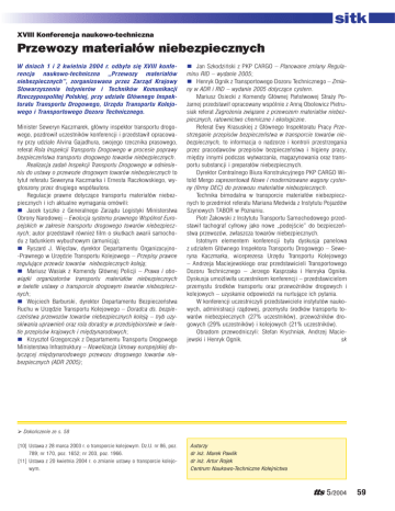sitk XVIII Konferencja naukowo-techniczna Przewozy materiałów niebezpiecznych W dniach 1 i 2 kwietnia 2004 r. odbyła się XVIII konferencja naukowo-techniczna „Przewozy materiałów niebezpiecznych”, zorganizowana przez Zarząd Krajowy Stowarzyszenia Inżynierów i Techników Komunikacji Rzeczypospolitej Polskiej, przy udziale Głównego Inspektoratu Transportu Drogowego, Urzędu Transportu Kolejowego i Transportowego Dozoru Technicznego. Minister Seweryn Kaczmarek, główny inspektor transportu drogowego, pozdrowił uczestników konferencji i przedstawił opracowany przy udziale Alvina Gajadhura, swojego rzecznika prasowego, referat Rola Inspekcji Transportu Drogowego w procesie poprawy bezpieczeństwa transportu drogowego towarów niebezpiecznych. Realizacja zadań Inspekcji Transportu Drogowego w odniesieniu do ustawy o przewozie drogowym towarów niebezpiecznych to tytuł referatu Seweryna Kaczmarka i Ernesta Raczkowskiego, wygłoszony przez drugiego współautora. Regulacje prawne dotyczące transportu materiałów niebezpiecznych i ich aktualne wymagania omówili: Jacek Łyczko z Generalnego Zarządu Logistyki Ministerstwa Obrony Narodowej – Ewolucja systemu prawnego Wspólnot Europejskich w zakresie transportu drogowego towarów niebezpiecznych; autor przedstawił również film o skutkach awarii samochodu z ładunkiem wybuchowym (amunicją); Ryszard J. Więcław, dyrektor Departamentu Organizacyjno-Prawnego w Urzędzie Transportu Kolejowego – Przepisy prawne regulujące przewóz towarów niebezpiecznych koleją; Mariusz Wasiak z Komendy Głównej Policji – Prawa i obowiązki organizatorów transportu materiałów niebezpiecznych w świetle ustawy o transporcie drogowym towarów niebezpiecznych; Wojciech Barburski, dyrektor Departamentu Bezpieczeństwa Ruchu w Urzędzie Transportu Kolejowego – Doradca ds. bezpieczeństwa przewozów towarów niebezpiecznych koleją – tryb uzyskiwania uprawnień oraz rola doradcy w przedsiębiorstwie w świetle przepisów krajowych i międzynarodowych; Krzysztof Grzegorczyk z Departamentu Transportu Drogowego Ministerstwa Infrastruktury – Nowelizacja Umowy europejskiej dotyczącej międzynarodowego przewozu drogowego towarów niebezpiecznych (ADR 2005); Jan Szkodziński z PKP CARGO – Planowane zmiany Regulaminu RID – wydanie 2005; Henryk Ognik z Transportowego Dozoru Technicznego – Zmiany w ADR i RID – wydanie 2005 dotyczące cystern. Mariusz Osiecki z Komendy Głównej Państwowej Straży Pożarnej przedstawił opracowany wspólnie z Anną Obolewicz Pietrusiak referat Zagrożenia związane z przewozem materiałów niebezpiecznych, ratownictwo chemiczne i ekologiczne. Referat Ewy Krasuskiej z Głównego Inspektoratu Pracy Przestrzeganie przepisów bezpieczeństwa w transporcie towarów niebezpiecznych, to informacja o nadzorze i kontroli przestrzegania przez pracodawców przepisów bezpieczeństwa i higieny pracy, między innymi podczas wytwarzania, magazynowania oraz transportu substancji i preparatów niebezpiecznych. Dyrektor Centralnego Biura Konstrukcyjnego PKP CARGO Witold Mergo zaprezentował Nowe i modernizowane wagony cysterny (firmy DEC) do przewozu materiałów niebezpiecznych. Technika bimodalna w transporcie materiałów niebezpiecznych to przedmiot referatu Mariana Medwida z Instytutu Pojazdów Szynowych TABOR w Poznaniu. Piotr Żakowski z Instytutu Transportu Samochodowego przedstawił tachograf cyfrowy jako nowe „podejście” do bezpieczeństwa przewozów, zwłaszcza towarów niebezpiecznych. Istotnym elementem konferencji była dyskusja panelowa z udziałem Głównego Inspektora Transportu Drogowego – Seweryna Kaczmarka, wiceprezesa Urzędu Transportu Kolejowego – Andrzeja Maciejewskiego oraz przedstawicieli Transportowego Dozoru Technicznego – Jerzego Kasprzaka i Henryka Ognika. Dyskusja umożliwiła uczestnikom konferencji – przedstawicielom przemysłu środków transportu oraz przewoźników drogowych i kolejowych – uzyskanie odpowiedzi na nurtujące ich pytania. W konferencji uczestniczyli przedstawiciele instytutów naukowych, administracji rządowej, przemysłu środków transportu towarów niebezpiecznych (27% uczestników), przewoźników drogowych (29% uczestników) i kolejowych (21% uczestników). Obradom przewodniczyli: Stefan Krychniak, Andrzej Maciejewski i Henryk Ognik. sk Dokończenie ze s. 58 [10] Ustawa z 28 marca 2003 r. o transporcie kolejowym. Dz.U. nr 86, poz. 789; nr 170, poz. 1652; nr 203, poz. 1966. [11] Ustawa z 20 kwietnia 2004 r. o zmianie ustawy o transporcie kolejowym. Autorzy dr inż. Marek Pawlik dr inż. Artur Rojek Centrum Naukowo-Techniczne Kolejnictwa 5/2004 59