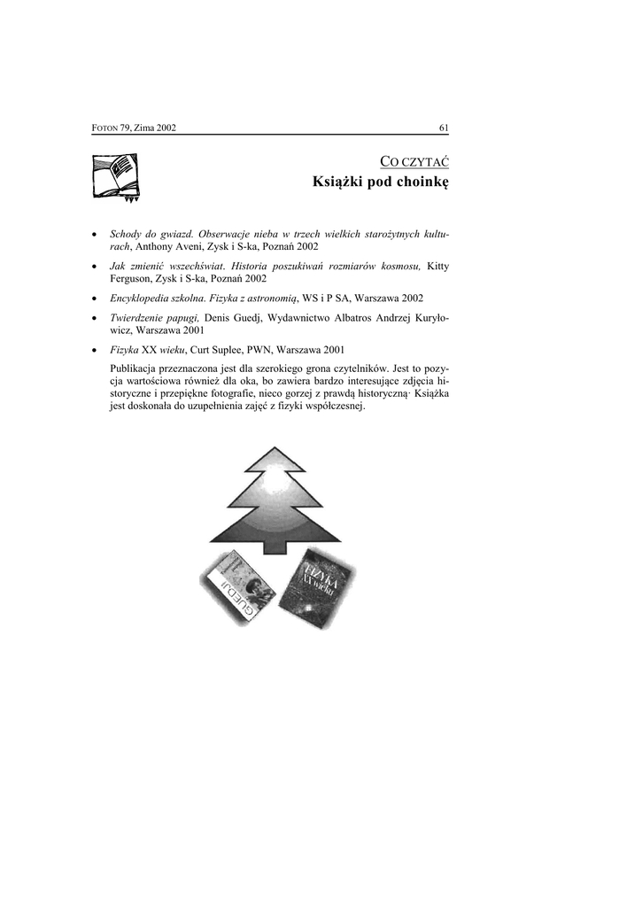FOTON 79, Zima 2002 61 CO CZYTAĆ Książki pod choinkę Schody do gwiazd. Obserwacje nieba w trzech wielkich starożytnych kulturach, Anthony Aveni, Zysk i S-ka, Poznań 2002 Jak zmienić wszechświat. Historia poszukiwań rozmiarów kosmosu, Kitty Ferguson, Zysk i S-ka, Poznań 2002 Encyklopedia szkolna. Fizyka z astronomią, WS i P SA, Warszawa 2002 Twierdzenie papugi, Denis Guedj, Wydawnictwo Albatros Andrzej Kuryłowicz, Warszawa 2001 Fizyka XX wieku, Curt Suplee, PWN, Warszawa 2001 Publikacja przeznaczona jest dla szerokiego grona czytelników. Jest to pozycja wartościowa również dla oka, bo zawiera bardzo interesujące zdjęcia historyczne i przepiękne fotografie, nieco gorzej z prawdą historyczną· Książka jest doskonała do uzupełnienia zajęć z fizyki współczesnej. 62 FOTON 79, Zima 2002 Antyrecenzja Fizyki XX wieku Curta Suplee Edward Malec Instytut Fizyki UJ Książkę Curta Suplee po raz pierwszy wziąłem do ręki w dniu 28 października 2002 roku około 15.15 i już po 20 sekundach wiedziałem, że nie będę jej czytać. Jeśli pomimo to uległem prośbie Szanownej Pani Redaktor Fotonu, by coś napisać, to głównie po to, aby przekazać potencjalnym autorom książek popularnonaukowych informację o istnieniu dosyć szczególnego rodzaju czytelników, których można nazwać spontanicznymi łowcami sprzeczności. Spontaniczny łowca sprzeczności jest czytelnikiem kapryśnym – nie zważa na całokształt, ale zraża się już przy pojedynczym potknięciu autora. Proces ten jest nie tylko spontaniczny, alei pozarozumowy. Objaśnię rzecz na własnym przykładzie. Kartkując wspomnianą Fizykę XX wieku, trafiłem w dwudziestej sekundzie na stronę 204, gdzie przeczytałem: Mimo to Chandrasekhar ustalił granice masy wymaganej do utworzenia czarnej dziury, a nowozelandzki matematyk Roy Kerr opisał, jak muszą one rotować. Potrzeba wielu zdań, aby wyprostować treść tego jednego. Nie istnieje żadna fundamentalna granica masy czarnej dziury. Można natomiast mówić o górnej granicy mas obiektów (gwiazd neutronowych), które powstały w wyniku ewolucji gwiazd; obiekty cięższe musiałyby być czarnymi dziurami. To nie Chandrasekhar ustalił tę granicę (w rzeczy samej jest ona bliżej nieokreślona, zależy od tzw. równania stanu i priorytetów badacza, jakkolwiek tajemniczo to brzmi) granica Chandrasekhara dotyczy bowiem maksymalnej masy białych karłów. Kerr odnalazł rozwiązanie rotującej czarnej dziury, co jest ważne. Ważniejszy jest jednak wkład choćby Finkelsteina w zrozumienie istoty rozwiązania Schwarzschilda, a tego nazwiska w książce nie znalazłem. Z drugiej jednak strony, gdyby zacytowane zdanie wyrzucić, to pozostały tekst rozdziału Brakująca masa i czarne dziury jest właściwie do przyjęcia (no, może poza tytułem, który nazbyt optymistycznie sugeruje, że czarne dziury mogą wyjaśnić zagadkę brakującej masy). Poza tym książka została wydana najpierw przez wydawnictwo American Institute of Physics i American Physical Society, co jednak gwarantuje jakiś tam poziom. Z kolei polski wydawca, PWN, też jest instytucją poważną. Ilustracje i zdjęcia wyglądają atrakcyjnie, a skorowidz zawiera te nazwiska, które chciałbym tam widzieć. Rozdział Elektrony wymienia model „rodzynków w cieście”, co sugeruje dbałość autora o przedstawienie historycznego rozwoju fizyki, a to lubię. Jeśli więc podejmuję decyzję o nieczytaniu tej pozycji, to jest w tym element pozarozumowy, pobudzony – uwaga, potencjalni autorzy – przez jedno nieostrożne zdanie.