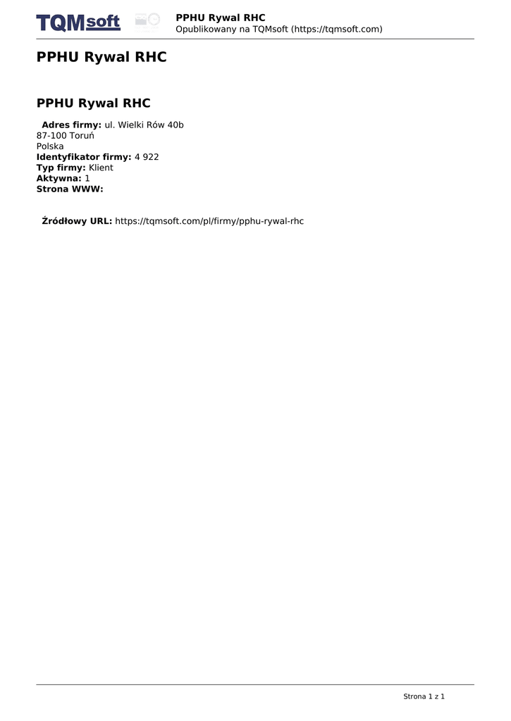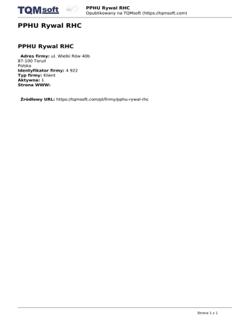 PPHU Rywal RHC Opublikowany na TQMsoft (https://tqmsoft.com) PPHU Rywal RHC PPHU Rywal RHC Adres firmy: ul. Wielki Rów 40b 87-100 Toruń Polska Identyfikator firmy: 4 922 Typ firmy: Klient Aktywna: 1 Strona WWW: Źródłowy URL: https://tqmsoft.com/pl/firmy/pphu-rywal-rhc Strona 1 z 1