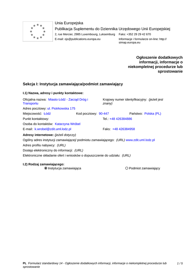 Unia Europejska Publikacja Suplementu do Dziennika Urzędowego Unii Europejskiej 2, rue Mercier, 2985 Luxembourg, Luksemburg Faks: +352 29 29 42 670 E-mail: [email protected] Informacje i formularze on-line: http:// simap.europa.eu Ogłoszenie dodatkowych informacji, informacje o niekompletnej procedurze lub sprostowanie Sekcja I: Instytucja zamawiająca/podmiot zamawiający I.1) Nazwa, adresy i punkty kontaktowe: Oficjalna nazwa: Miasto Łódź - Zarząd Dróg i Transportu Krajowy numer identyfikacyjny: (jeżeli jest znany) _____ Adres pocztowy: ul. Piotrkowska 175 Miejscowość: Łódź Kod pocztowy: 90-447 Punkt kontaktowy: _____ Państwo: Polska (PL) Tel.: +48 426384886 Osoba do kontaktów: Katarzyna Wróbel E-mail: [email protected] Faks: +48 426384958 Adresy internetowe: (jeżeli dotyczy) Ogólny adres instytucji zamawiającej/ podmiotu zamawiającego: (URL) www.zdit.uml.lodz.pl Adres profilu nabywcy: (URL) _____ Dostęp elektroniczny do informacji: (URL) _____ Elektroniczne składanie ofert i wniosków o dopuszczenie do udziału: (URL) _____ I.2) Rodzaj zamawiającego: Instytucja zamawiająca Podmiot zamawiający PL Formularz standardowy 14 - Ogłoszenie dodatkowych informacji, informacje o niekompletnej procedurze lub sprostowanie 1/5 Sekcja II: Przedmiot zamówienia II.1.1) Nazwa nadana zamówieniu: Przebudowa układu drogowo - torowego skrzyżowania ul. Dąbrowskiego i al. Rydza Śmigłego II.1.2) Krótki opis zamówienia lub zakupu: (podano w pierwotnym ogłoszeniu) 1.1.Przedmiotem zamówienia jest: Przebudowa układu drogowo - torowego skrzyżowania ul. Dąbrowskiego i al. Rydza Śmigłego Przedmiotem zamówienia jest wykonanie na podstawie dokumentacji projektowej robót budowlanych polegających na przebudowie układu drogowo – torowego na skrzyżowaniu ul. Dąbrowskiego i al. Rydza – Śmigłego oraz odcinka ul. Dąbrowskiego od skrzyżowania z al. Rydza – Śmigłego do ul. Dąbrowskiego 34a (tj. do pikietażu: TOR A 1+311,069km, TOR B 1+312,373km ul. Dąbrowskiego) wraz ze skrzyżowaniem z ul. Podgórną i podłączeniem obydwu skrzyżowań do Obszarowego Systemu Sterowania Ruchem. Przedmiot zamówienia obejmuje również przebudowę infrastruktury towarzyszącej. Celem inwestycji jest poprawa komunikacji publicznej, samochodowej i pieszej. Modernizacja istniejącego układu przyczyni się do poprawy bezpieczeństwa użytkowników pojazdów i pieszych na przebudowywanym odcinku. Przebudowa zakresu określonego w zamówieniu stanowi pierwszy etap przebudowy i rozbudowy ul. Dąbrowskiego na odcinku od al. Rydza Śmigłego do ul. Rzgowskiej. 1.2. Planowany zakres robót w ramach zamówienia obejmuje m.in.: a) przebudowę torowiska tramwajowego i infrastruktury towarzyszącej wraz z zapewnieniem połączenia styku szyn na granicy opracowania tak, by było możliwe jego użytkowanie; b) przebudowę tramwajowej sieci trakcyjnej i układu zasilania wraz z zapewnieniem połączenia styku trakcji tramwajowej na granicy opracowania tak, by było możliwe jego użytkowanie, c) przyjęcie, poza zakresem określonym w planie zagospodarowania terenu zawartym w Tomie III SIWZ, regulację w planie i profilu istniejącego torowiska wraz z regulacją sieci trakcyjnej na długości do 50 m., regulacja ma pozwolić na prawidłowe funkcjonowanie tramwajów, d) przebudowę układu drogowego, e) wykonanie peronów przystankowych z płytek betonowych 30x30x8cm w kolorze grafitowym, f) przebudowę oświetlenia ulicznego wraz z zasilaniem, g) przebudowę i budowę systemu odwodnienia (kanalizacja deszczowa) wraz z odwodnieniem torowiska, h) budowę kabla i zakończenie go w szafach 3.4 i 3.5 wg projektu. Zakres od Sz. 4 w kierunku granicy następnego etapu (tj. wciągnięcie kabla na odcinku 100m) zostanie wykonany w zakresie następnego etapu, i) usunięcie kolizji telekomunikacyjnych, j) usunięcie kolizji elektroenergetycznych, k) usunięcie kolizji gazowych, l) usunięcie kolizji wodociągowych, m) roboty w zakresie zieleni w tym na działce 2/5, obręb G-17, bez wyburzania obiektu kubaturowego na tej działce. Zakres obszarowy zamówienia wskazany jest w Projekcie zagospodarowania terenu zamieszczonym w Tomie III SIWZ. 1.3. Zadanie zostało podzielone na etapy: - Etap I zamówienia obejmuje przebudowę układu drogowo – torowego wraz z dopuszczeniem do ruchu tramwajów w relacjach: wschód – północ, północ – wschód, południe – północ, północ - południe oraz ruchu kołowego w relacji: północ – południe, południe - północ skrzyżowania ul. PL Formularz standardowy 14 - Ogłoszenie dodatkowych informacji, informacje o niekompletnej procedurze lub sprostowanie 2/5 Dąbrowskiego i al. Rydza – Śmigłego oraz zapewnienie bezpiecznego poruszania się pieszych i rowerzystów w jego obrębie. Etap I obejmuje również podłączenie tego skrzyżowania do Obszarowego Systemu Sterowania Ruchem za pomocą światłowodu. - Etap II zamówienia obejmuje pozostałe roboty. Szczegółowy opis przedmiotu zamówienia zawarty jest w Tomie III SIWZ – Dokumentacja projektowa i Specyfikacje Techniczne Wykonania i Odbioru Robót Budowlanych oraz w Tomie II SIWZ – Formularz aktu umowy. 2. Zamawiający zastrzega, że wszędzie tam gdzie w treści dokumentacji projektowej i STWiORB, stanowiących opis przedmiotu zamówienia, zostały w opisie tego przedmiotu wskazane znaki towarowe, patenty lub pochodzenie, Zamawiający dopuszcza metody, materiały, urządzenia, systemy, technologie itp. równoważne do przedstawionych w opisie przedmiotu zamówienia. Dopuszcza się, więc zaproponowanie w ofercie wszelkich równoważnych odpowiedników rynkowych o właściwościach nie gorszych niż wskazane przez Zamawiającego. Parametry wskazanego standardu określają minimalne warunki techniczne, eksploatacyjne, użytkowe, jakościowe i funkcjonalne, jakie ma spełniać przedmiot zamówienia. Wskazane znaki towarowe, patenty, marki lub nazwy producenta wskazujące na pochodzenie określają je