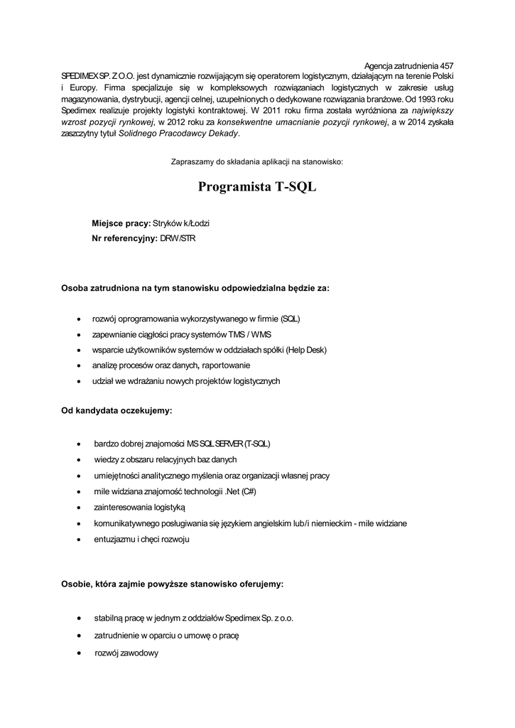 Agencja zatrudnienia 457 SPEDIMEX SP. Z O.O. jest dynamicznie rozwijającym się operatorem logistycznym, działającym na terenie Polski i Europy. Firma specjalizuje się w kompleksowych rozwiązaniach logistycznych w zakresie usług magazynowania, dystrybucji, agencji celnej, uzupełnionych o dedykowane rozwiązania branżowe. Od 1993 roku Spedimex realizuje projekty logistyki kontraktowej. W 2011 roku firma została wyróżniona za największy wzrost pozycji rynkowej, w 2012 roku za konsekwentne umacnianie pozycji rynkowej, a w 2014 zyskała zaszczytny tytuł Solidnego Pracodawcy Dekady. Zapraszamy do składania aplikacji na stanowisko: Programista T-SQL Miejsce pracy: Stryków k/Łodzi Nr referencyjny: DRW/STR Osoba zatrudniona na tym stanowisku odpowiedzialna będzie za: rozwój oprogramowania wykorzystywanego w firmie (SQL) zapewnianie ciągłości pracy systemów TMS / WMS wsparcie użytkowników systemów w oddziałach spółki (Help Desk) analizę procesów oraz danych, raportowanie udział we wdrażaniu nowych projektów logistycznych Od kandydata oczekujemy: bardzo dobrej znajomości MS SQL SERVER (T-SQL) wiedzy z obszaru relacyjnych baz danych umiejętności analitycznego myślenia oraz organizacji własnej pracy mile widziana znajomość technologii .Net (C#) zainteresowania logistyką komunikatywnego posługiwania się językiem angielskim lub/i niemieckim - mile widziane entuzjazmu i chęci rozwoju Osobie, która zajmie powyższe stanowisko oferujemy: stabilną pracę w jednym z oddziałów Spedimex Sp. z o.o. zatrudnienie w oparciu o umowę o pracę rozwój zawodowy odpowiedzialne stanowisko pozwalające na samodzielność w ramach realizacji obowiązków bezpłatną opiekę medyczną w najlepszej w Polsce sieci placówek prywatnych karnet sportowy na preferencyjnych warunkach Osoby zainteresowane ofertą oraz spełniające powyższe wymagania prosimy o przesyłanie aplikacji z podaniem nr referencyjnego DRW/STR na adres: [email protected]. Dziękujemy za nadesłane zgłoszenia. Jednocześnie informujemy, że skontaktujemy się z kandydatami, których profil zawodowy odpowiada warunkom ogłoszenia. Prosimy o dopisanie następującej klauzuli: Wyrażam zgodę na przetwarzanie moich danych osobowych zawartych w mojej ofercie pracy dla potrzeb niezbędnych do realizacji procesu rekrutacji (zgodnie z ustawą z dn. 29.08.97 roku o Ochronie Danych Osobowych Dz. Ust Nr 133 poz. 883).