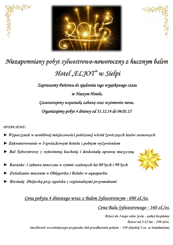 Niezapomniany pobyt sylwestrowosylwestrowo-noworoczny z hucznym balem Hotel „ELJOT” w Sielpi Zapraszamy Państwa do spędzenia spędzenia tego wyjątkowego czasu w Naszym Hotelu. Gwarantujemy wspaniałą zabawę oraz wyśmienite menu. Organizujemy Organizujemy pobyt 4 dniowy od 31.12.14 do 04.01.1 04.01.15 .01.15 OFERUJEMY: ► Wypoczynek w urokliwej miejscowości położonej wśród żywicznych lasów sosnowych ► Zakwaterowanie w 3-gwiazkowym hotelu z pełnym wyżywieniem ► Bal Sylwestrowy z wykwintną kuchnią i doskonałą oprawą muzyczną ► Karaoke i zabawa taneczna w rytmie szalonych lat 80’tych i 90’tych ► Zwiedzanie muzeum w Oblęgorku i Relaks w aquaparku ► Biesiadę Zbójecką przy ognisku z regionalnymi przysmakami Cena pobytu 4 dniowego wraz z Balem Sylwestrowym - 690 zł./os. Cena Balu Sylwestrowego - 160 zł./os. Dzieci do 3-tego roku życia – pobyt bezpłatny Dzieci od 3-12 lat – 250 zł/os. (możliwość wcześniejszego przyjazdu, lub przedłużenia pobytu – 150 zł/pokój 2 os. ze śniadaniem) PROGRAM IMPREZY Dla naszych gości przygotowaliśmy: 31.12 - Środa 14.00 - przyjazd gości 20.00 - Bal Sylwestrowy z profesjonalnym zespołem muzycznym, bogatym menu: cztery dania gorące, deser, zimne przekąski, napoje zimne i gorące, szampan 0,7 l/4os. 01.01 - Czwartek 09.00 - 11.00 - śniadanie noworoczne 14.00 - obiad 18.00 - uroczysta kolacja, karaoke oraz zabawa w rytmie szalonych lat 80’tych i 90’tych 02.01 - Piątek 09.00 - 10.00 - śniadanie 13.00 - obiad 14.00 - wyjazd do Oblęgorka, zwiedzanie muzeum Henryka Sienkiewicza i relaks w Centrum wodnym Olimpic 20.00 - kolacja 03.01 - Sobota 09.00 - 10.00 - śniadanie 13.00 - obiad 14.00 - 16.00 - zabawy plenerowe 18.00 - Biesiada Zbójnicka przy ognisku w towarzystwie Zbója Świętokrzyskiego z regionalnymi przysmakami (chleb ze smalcem ,pieczony świniak, kiełbaski, bigos, grzane wino) 04.01 – Niedziela 9.00 - 10.00- śniadanie 12.00 –pożegnanie Gości Więcej informacji na stronie www.hotelsielpia.pl Rezerwacja - 041 372 02 83, 83, 602 614 007