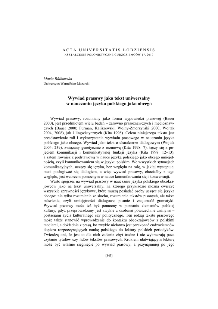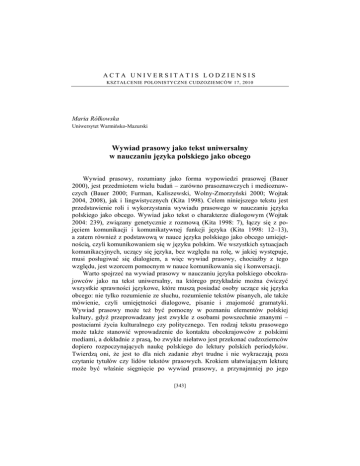 ACTA UNIVERSITATIS LODZIENSIS KSZTAŁCENIE POLONISTYCZNE CUDZOZIEMCÓW 17, 2010 Maria Rółkowska Uniwersytet Warmińsko-Mazurski Wywiad prasowy jako tekst uniwersalny w nauczaniu języka polskiego jako obcego Wywiad prasowy, rozumiany jako forma wypowiedzi prasowej (Bauer 2000), jest przedmiotem wielu badań – zarówno prasoznawczych i medioznawczych (Bauer 2000; Furman, Kaliszewski, Wolny-Zmorzyński 2000; Wojtak 2004, 2008), jak i lingwistycznych (Kita 1998). Celem niniejszego tekstu jest przedstawienie roli i wykorzystania wywiadu prasowego w nauczaniu języka polskiego jako obcego. Wywiad jako tekst o charakterze dialogowym (Wojtak 2004: 239), związany genetycznie z rozmową (Kita 1998: 7), łączy się z pojęciem komunikacji i komunikatywnej funkcji języka (Kita 1998: 12–13), a zatem również z podstawową w nauce języka polskiego jako obcego umiejętnością, czyli komunikowaniem się w języku polskim. We wszystkich sytuacjach komunikacyjnych, uczący się języka, bez względu na rolę, w jakiej występuje, musi posługiwać się dialogiem, a więc wywiad prasowy, chociażby z tego względu, jest wzorcem pomocnym w nauce komunikowania się i konwersacji. Warto spojrzeć na wywiad prasowy w nauczaniu języka polskiego obcokrajowców jako na tekst uniwersalny, na którego przykładzie można ćwiczyć wszystkie sprawności językowe, które muszą posiadać osoby uczące się języka obcego: nie tylko rozumienie ze słuchu, rozumienie tekstów pisanych, ale także mówienie, czyli umiejętności dialogowe, pisanie i znajomość gramatyki. Wywiad prasowy może też być pomocny w poznaniu elementów polskiej kultury, gdyż przeprowadzany jest zwykle z osobami powszechnie znanymi – postaciami życia kulturalnego czy politycznego. Ten rodzaj tekstu prasowego może także stanowić wprowadzenie do kontaktu obcokrajowców z polskimi mediami, a dokładnie z prasą, bo zwykle niełatwo jest przekonać cudzoziemców dopiero rozpoczynających naukę polskiego do lektury polskich periodyków. Twierdzą oni, że jest to dla nich zadanie zbyt trudne i nie wykraczają poza czytanie tytułów czy lidów tekstów prasowych. Krokiem ułatwiającym lekturę może być właśnie sięgnięcie po wywiad prasowy, a przynajmniej po jego [343] 344 Maria Rółkowska fragmenty, bowiem struktura dialogowa, segmentacja tekstu, ułatwia jego czytanie i rozumienie poszczególnych fragmentów. W odróżnieniu od tekstu ciągłego, satysfakcję może przynieść uczniowi zrozumienie już jednej wymiany, czyli pary: pytanie – odpowiedź, gdyż stanowi ona samodzielną całość (Wojtak 2008: 145). W tekście ciągłym, narracyjnym, niezrozumienie fragmentu poprzedzającego pociąga za sobą niezrozumienie dalszego ciągu, co często zniechęca ucznia do czytania, zaś lektura nawet pojedynczych wymian klasycznego wywiadu prasowego daje satysfakcję ze zrozumienia minitekstu i motywację do kontynuowania lektury. Znajomość wywiadu prasowego przez obcokrajowców przynosi bardzo wymierne korzyści, chociażby podczas państwowych egzaminów certyfikatowych z języka polskiego jako obcego (dla wszystkich trzech poziomów). Po pierwsze – wywiad prasowy jako tekst o charakterze dialogowym, uczy umiejętności prowadzenia rozmowy, co jest wymagane na każdym z poziomów, ponadto jest oryginalnym tekstem prasowym, a znajomość takich tekstów jest konieczna od poziomu B1 do C2 (Państwowe egzaminy... 2003: 17–19, 21, 33–34, 36–40, 43–44, 48, 50–54). Jak zatem wywiady prasowe – zarówno w postaci klasycznej, jak i wywiady kwestionariuszowe oraz sondy (Wojtak 2008: 143) – są obecne w podręcznikach do nauczania języka polskiego jako obcego, do ćwiczenia jakich umiejętności językowych są używane? Oto przykłady z wybranych podręczników dla różnych poziomów. W podręcznikach dla poziomu progowego A1 bardzo trudno jest znaleźć fragmenty autentycznych wywiadów prasowych; zwykle są to teksty stylizowane na wywiad – jak można przypuszczać – prasowy. Na przykład w podręczniku Małgorzaty Małolepszej i Anety Szymkiewicz Po polsku 1 pojawia się forma sondy – ankiety ulicznej na temat zawodów wykonywanych przez różne osoby, forma fragmentu wywiadu z młodą kobietą, forma wywiadu kwestionariuszowego z najmłodszym w Polsce milionerem (zaczerpniętego – jak dowodzi polecenie ćwiczenia – z prasy, choć autorki nie podają źródła) oraz sonda na temat obchodzonych w Polsce tradycji wielkanocnych, która mogłaby być materiałem prasowym (Małolepsza, Szymkiewicz 2006: 29, 95, 130, 147). Natomiast w zbiorze ćwiczeń komunikacyjnych autorstwa Danuty Gałygi Ach, ten język polski! (poziom A1) znaleźć można dwa bardzo krótkie fragmenty sond z prasy kobiecej: na temat gotowania („Tina”) i największych osiągnięć XX w. („Olivia”) (Gałyga 2001: 70, 164). Z kolei podręcznik Agnieszki Burkart i Agnieszki Jasińskiej Po polsku 2 (dla poziomu A2) zawiera teksty, które mają formę wywiadu prasowego, ale ponieważ autorki nie podają ich źródła, nie można mieć pewności, czy mamy do czynienia z autentycznymi tekstami prasowymi. Są to: tekst w formie wywiadu kwestionariuszowego na temat pracy, tekst w formie sondy dotyczący ogrodów zoologicznych, fragment Wywiad prasowy jako tekst uniwersalny... 345 wywiadu z psychologiem na temat życia w pojedynkę, w którym podane są nazwiska rozmawiających osób, sonda wśród cudzoziemców mieszkających w Polsce o znajomości polskiego kina, sonda na temat złych i dobrych wspomnień z zapamiętanych z dzieciństwa świąt, która – jak sugeruje polecenie ćwiczenia – została zamieszczona w prasie, ale nie podano jej źródła (Burkart, Jasińska 2007: 14–15, 61, 83, 138, 167). Analizując podręczniki dla poziomu progowego, widać, że przy najniższych stopniach zaawansowania językowego pojawiają się teksty stylizowane na wywiad prasowy i, bardzo rzadko, krótkie fragmenty autentycznych sond pr