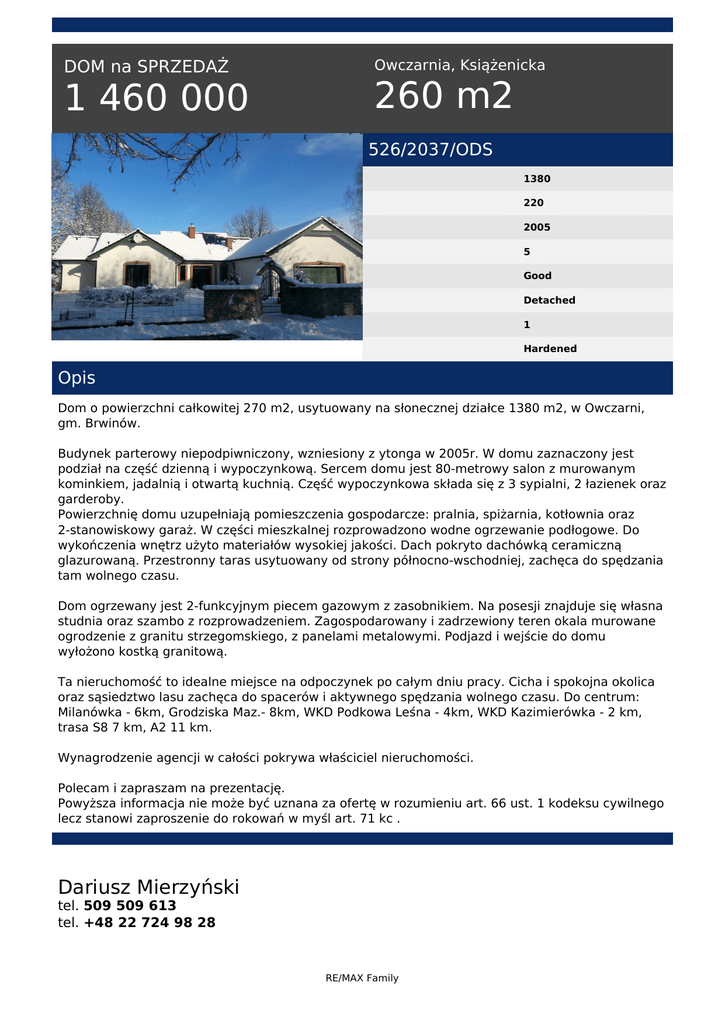 DOM na SPRZEDAŻ 1 460 000 Owczarnia, Książenicka 260 m2 526/2037/ODS 1380 220 2005 5 Good Detached 1 Hardened Opis Dom o powierzchni całkowitej 270 m2, usytuowany na słonecznej działce 1380 m2, w Owczarni, gm. Brwinów. Budynek parterowy niepodpiwniczony, wzniesiony z ytonga w 2005r. W domu zaznaczony jest podział na część dzienną i wypoczynkową. Sercem domu jest 80-metrowy salon z murowanym kominkiem, jadalnią i otwartą kuchnią. Część wypoczynkowa składa się z 3 sypialni, 2 łazienek oraz garderoby. Powierzchnię domu uzupełniają pomieszczenia gospodarcze: pralnia, spiżarnia, kotłownia oraz 2-stanowiskowy garaż. W części mieszkalnej rozprowadzono wodne ogrzewanie podłogowe. Do wykończenia wnętrz użyto materiałów wysokiej jakości. Dach pokryto dachówką ceramiczną glazurowaną. Przestronny taras usytuowany od strony północno-wschodniej, zachęca do spędzania tam wolnego czasu. Dom ogrzewany jest 2-funkcyjnym piecem gazowym z zasobnikiem. Na posesji znajduje się własna studnia oraz szambo z rozprowadzeniem. Zagospodarowany i zadrzewiony teren okala murowane ogrodzenie z granitu strzegomskiego, z panelami metalowymi. Podjazd i wejście do domu wyłożono kostką granitową. Ta nieruchomość to idealne miejsce na odpoczynek po całym dniu pracy. Cicha i spokojna okolica oraz sąsiedztwo lasu zachęca do spacerów i aktywnego spędzania wolnego czasu. Do centrum: Milanówka - 6km, Grodziska Maz.- 8km, WKD Podkowa Leśna - 4km, WKD Kazimierówka - 2 km, trasa S8 7 km, A2 11 km. Wynagrodzenie agencji w całości pokrywa właściciel nieruchomości. Polecam i zapraszam na prezentację. Powyższa informacja nie może być uznana za ofertę w rozumieniu art. 66 ust. 1 kodeksu cywilnego lecz stanowi zaproszenie do rokowań w myśl art. 71 kc . Dariusz Mierzyński tel. 509 509 613 tel. +48 22 724 98 28 RE/MAX Family email: [email protected] RE/MAX Family Powered by TCPDF (www.tcpdf.org)