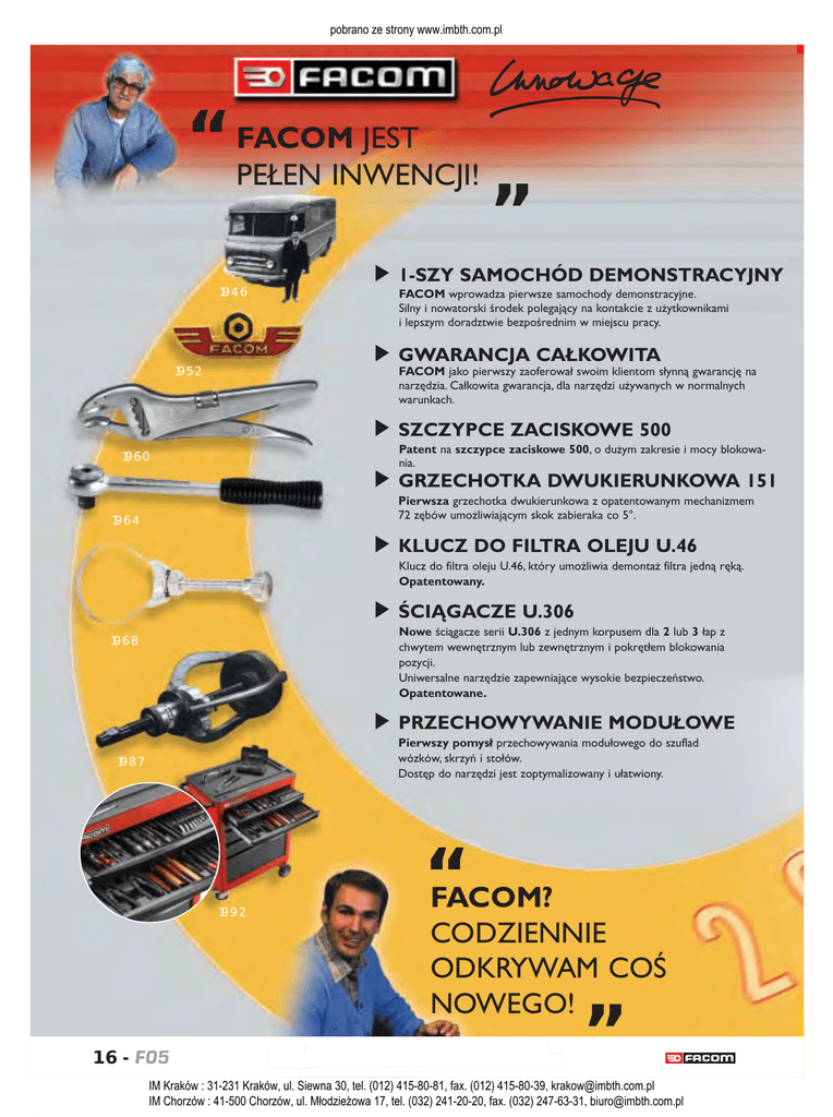 P16-17.qxd 28/02/05 12:26 Page 16 pobrano ze strony www.imbth.com.pl “ JEST “ FACOM PEŁEN INWENCJI! 1-SZY SAMOCHÓD DEMONSTRACYJNY 1946 FACOM wprowadza pierwsze samochody demonstracyjne. Silny i nowatorski środek polegający na kontakcie z użytkownikami i lepszym doradztwie bezpośrednim w miejscu pracy. GWARANCJA CAŁKOWITA 1952 FACOM jako pierwszy zaoferował swoim klientom słynną gwarancję na narzędzia. Całkowita gwarancja, dla narzędzi używanych w normalnych warunkach. SZCZYPCE ZACISKOWE 500 Patent na szczypce zaciskowe 500, o dużym zakresie i mocy blokowania. 1960 GRZECHOTKA DWUKIERUNKOWA 151 Pierwsza grzechotka dwukierunkowa z opatentowanym mechanizmem 72 zębów umożliwiającym skok zabieraka co 5°. 1964 KLUCZ DO FILTRA OLEJU U.46 Klucz do filtra oleju U.46, który umożliwia demontaż filtra jedną ręką. Opatentowany. ŚCIĄGACZE U.306 Nowe ściągacze serii U.306 z jednym korpusem dla 2 lub 3 łap z chwytem wewnętrznym lub zewnętrznym i pokrętłem blokowania pozycji. Uniwersalne narzędzie zapewniające wysokie bezpieczeństwo. Opatentowane. 1968 PRZECHOWYWANIE MODUŁOWE Pierwszy pomysł przechowywania modułowego do szuflad wózków, skrzyń i stołów. Dostęp do narzędzi jest zoptymalizowany i ułatwiony. 1987 1992 “ FACOM? CODZIENNIE ODKRYWAM COŚ NOWEGO! “ 16 - F05 Katalog elektroniczny na www.facom.com IM Kraków : 31-231 Kraków, ul. Siewna 30, tel. (012) 415-80-81, fax. (012) 415-80-39, [email protected] IM Chorzów : 41-500 Chorzów, ul. Młodzieżowa 17, tel. (032) 241-20-20, fax. (032) 247-63-31, [email protected]