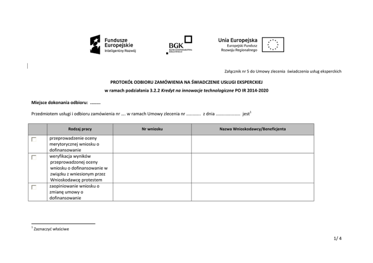 Załącznik nr 5 do Umowy zlecenia świadczenia usług eksperckich PROTOKÓŁ ODBIORU ZAMÓWIENIA NA ŚWIADCZENIE USŁUGI EKSPERCKIEJ w ramach podziałania 3.2.2 Kredyt na innowacje technologiczne PO IR 2014-2020 Miejsce dokonania odbioru: ........ Przedmiotem usługi i odbioru zamówienia nr …. w ramach Umowy zlecenia nr ............ z dnia .................... jest1 Rodzaj pracy Nr wniosku Nazwa Wnioskodawcy/Beneficjenta przeprowadzenie oceny merytorycznej wniosku o dofinansowanie weryfikacja wyników przeprowadzonej oceny wniosku o dofinansowanie w związku z wniesionym przez Wnioskodawcę protestem zaopiniowanie wniosku o zmianę umowy o dofinansowanie 1 Zaznaczyć właściwe 1/ 4 doradztwo w zakresie projektu, w szczególności w zakresie weryfikacji wniosku o płatność, zmiany rzeczowej projektu, dokumentacji środowiskowej W przypadku odbioru zamówienia bez zastrzeżeń wypełniana jest tylko część A. CZĘŚĆ A W dniu …....…..... Zamawiający odbiera dokonaną usługę określoną w § 1 ust. 2 Umowy zlecenia świadczenia usług eksperckich bez zastrzeżeń i za wykonanie zamówienia wypłaci Ekspertowi wynagrodzenie w pełnej wysokości, zgodnie z zapisami Umowy. Powyższe skutkuje pozytywną oceną pracy Eksperta udokumentowaną Kartą Oceny Pracy Eksperta. ………………………………………………………..……………………… ; Sekretarz KOP/ Zastępca Sekretarza KOP ………………………………………………………..……………………… Przewodniczący KOP/ Zastępca Przewodniczącego KOP CZĘŚĆ B W dniu …………………… Zamawiający nie przyjmuje wykonania usługi z uwagi na negatywną oceną pracy Eksperta udokumentowaną Kartą Oceny Pracy Eksperta. W związku z powyższym, zgodnie z § 7 ust. 4 Umowy zlecenia świadczenia usług eksperckich za wykonanie usługi Ekspert nie otrzymuje wynagrodzenia, a umowa zlecenia świadczenia usług, zawarta w dniu ….......... , zgodnie z § 8 ust. 3 pkt 10 ulega rozwiązaniu ze skutkiem natychmiastowym. ………………………………………………………..……………………… ; ………………………………………………………..……………………… 2/ 4 Sekretarz KOP/ Zastępca Sekretarza KOP Przewodniczący KOP/ Zastępca Przewodniczącego KOP Integralną część Protokołu Odbioru Zamówienia na świadczenie usługi eksperckiej stanowi załącznik: Załącznik nr 5a Karta Oceny Pracy Eksperta 3/ 4 Załącznik nr 5a Karta Oceny Pracy Eksperta KARTA OCENY PRACY EKSPERTA w ramach poddziałania 3.2.2 Kredyt na innowacje technologiczne Programu Operacyjnego Inteligentny Rozwój 2014-2020 Imię i nazwisko Eksperta Numer WOD Elementy oceny pracy Eksperta: TAK 1. Kompletność oceny WOD polegająca na wypełnieniu wszystkich rubryk Karty oceny merytorycznej oraz zgodnie z § 4 ust. 7 Umowy zlecenia świadczenia usług eksperckich*. 2. Kompletność weryfikacji wyników oceny WOD w związku z wniesionym przez Wnioskodawcę protestem polegająca na wypełnieniu właściwych rubryk Karty oceny merytorycznej, w zakresie objętym protestem oraz zgodnie z § 4 ust. 7 Umowy zlecenia świadczenia usług eksperckich*. Kompletność wykonania usługi eksperckiej wymienionej w § 1 ust. 2 pkt. 3, zgodnie z Umową zlecenia świadczenia usług eksperckich oraz Zamówieniem na świadczenie usługi eksperckiej*. 3. 4. 5. 6. NIE NIE DOTYCZY Kompletność wykonania usługi eksperckiej wymienionej w § 1 ust. 2 pkt. 4, zgodnie z Umową zlecenie świadczenia usług eksperckich oraz Zamówieniem na świadczenie usługi eksperckiej*. Wykonanie usługi zgodnie z zasadami ujętymi w dokumentach programowych, w szczególności wymienionymi w § 2 ust. 1 Umowy zlecenia świadczenia usług eksperckich. Ekspert posiada wiedzę, umiejętności, doświadczenie lub wymagane uprawnienia w dziedzinie objętej Programem Operacyjnym Inteligentny Rozwój 2014-2020, w ramach której był dokonywany wybór WOD. Pozytywna Negatywna Wynik Ocen * Negatywna ocena może skutkować koniecznością skierowania WOD do oceny przez innego Eksperta. Uwagi: …………………………………………………………………………….. Sporządził: Zatwierdził: …………………………….. …………………………………… Sekretarz KOP/Zastępca Sekretarza KOP Przewodniczący KOP/Zastępca Przewodniczącego KOP (imię, nazwisko, data) (imię, nazwisko, data) 4/ 4